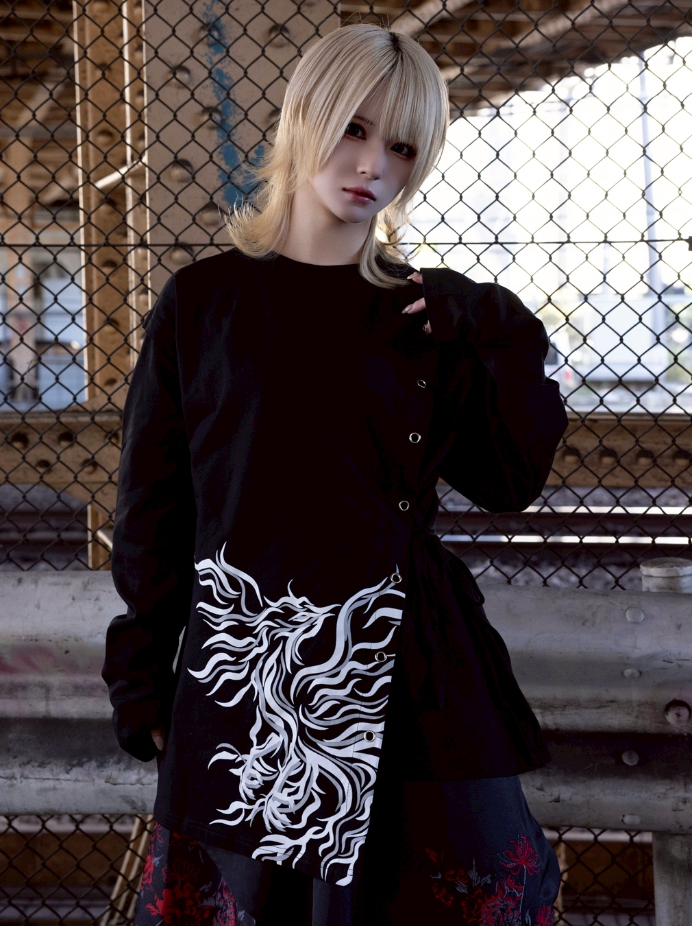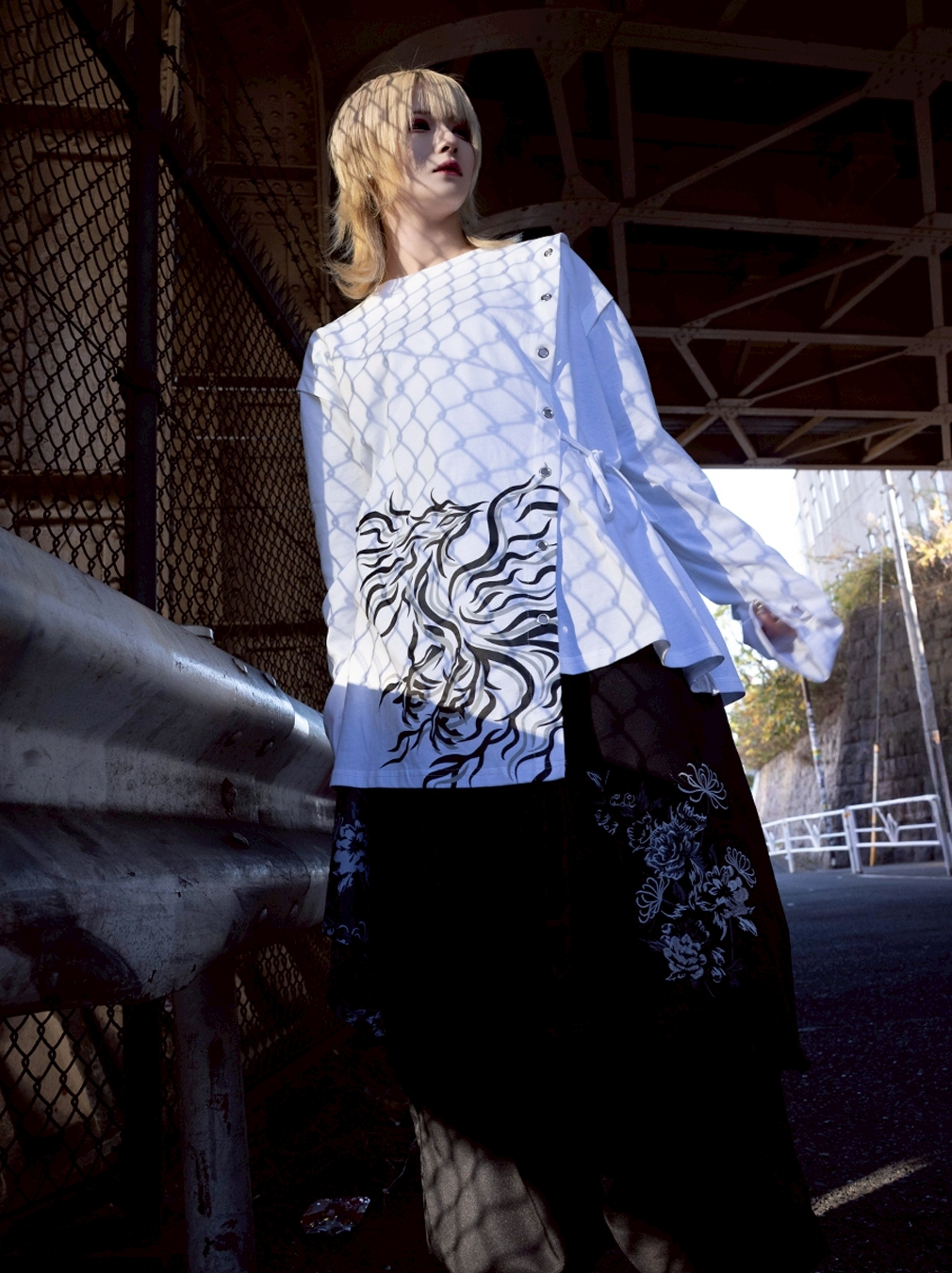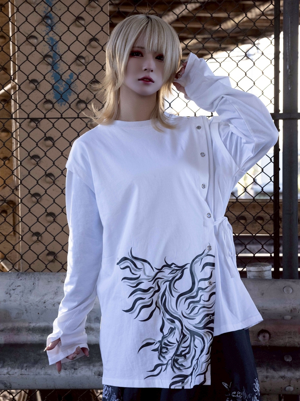 A long-sleeve cut-and-sew top featuring a powerful Suzaku (Vermilion Bird) motif, expressed through an asymmetrical construction.