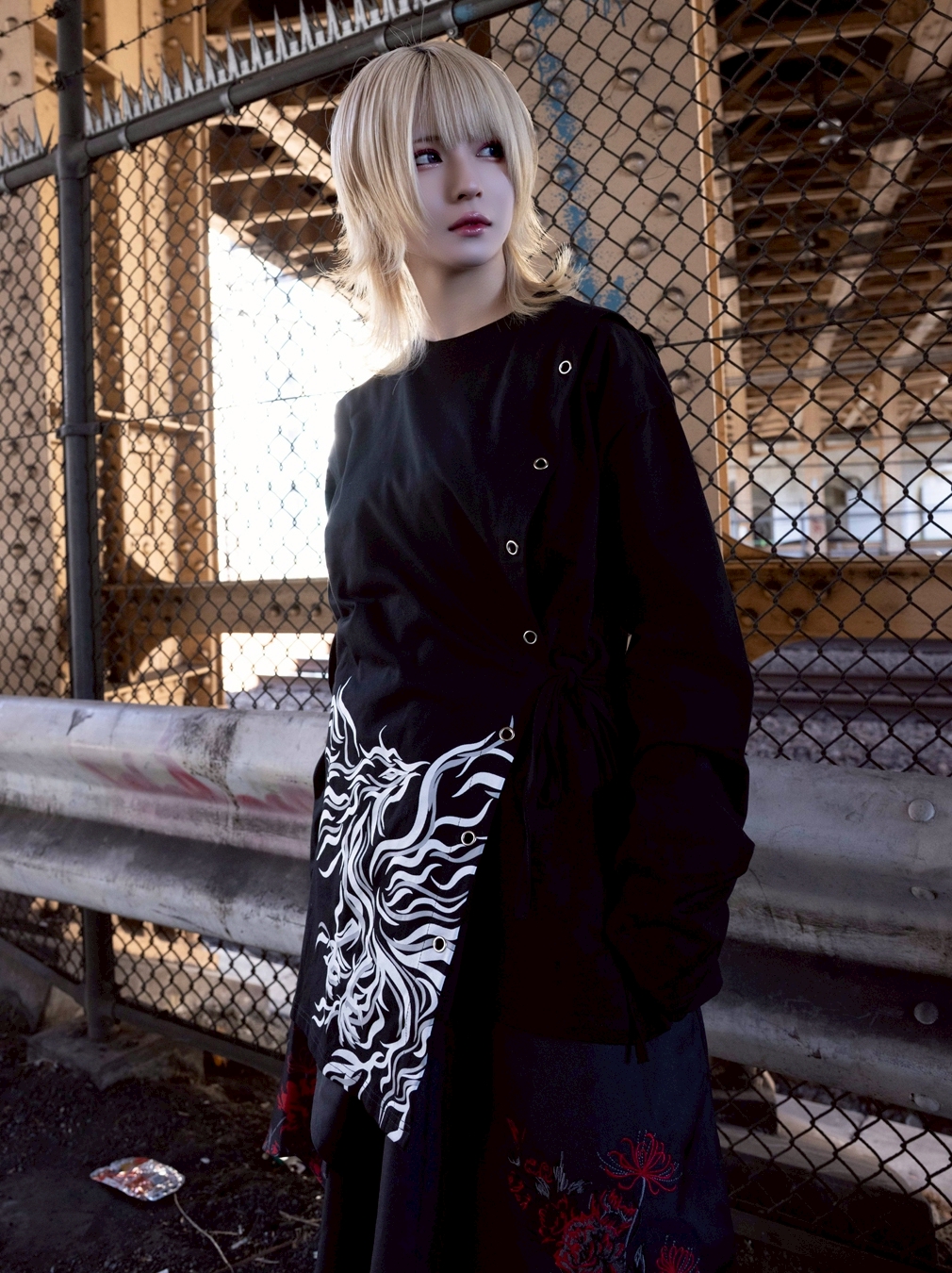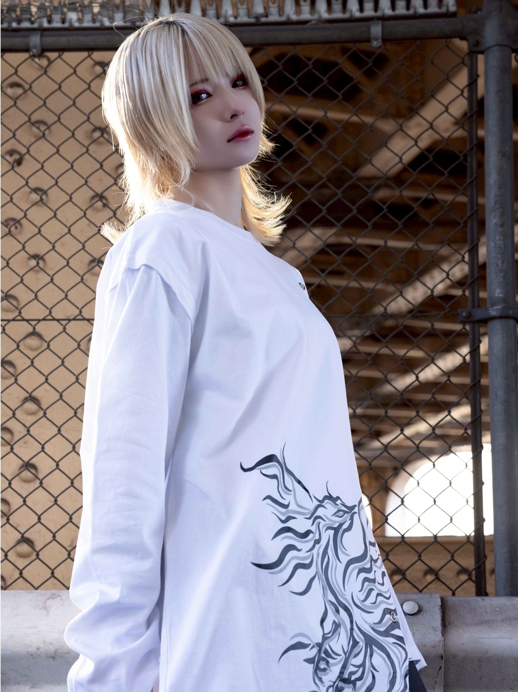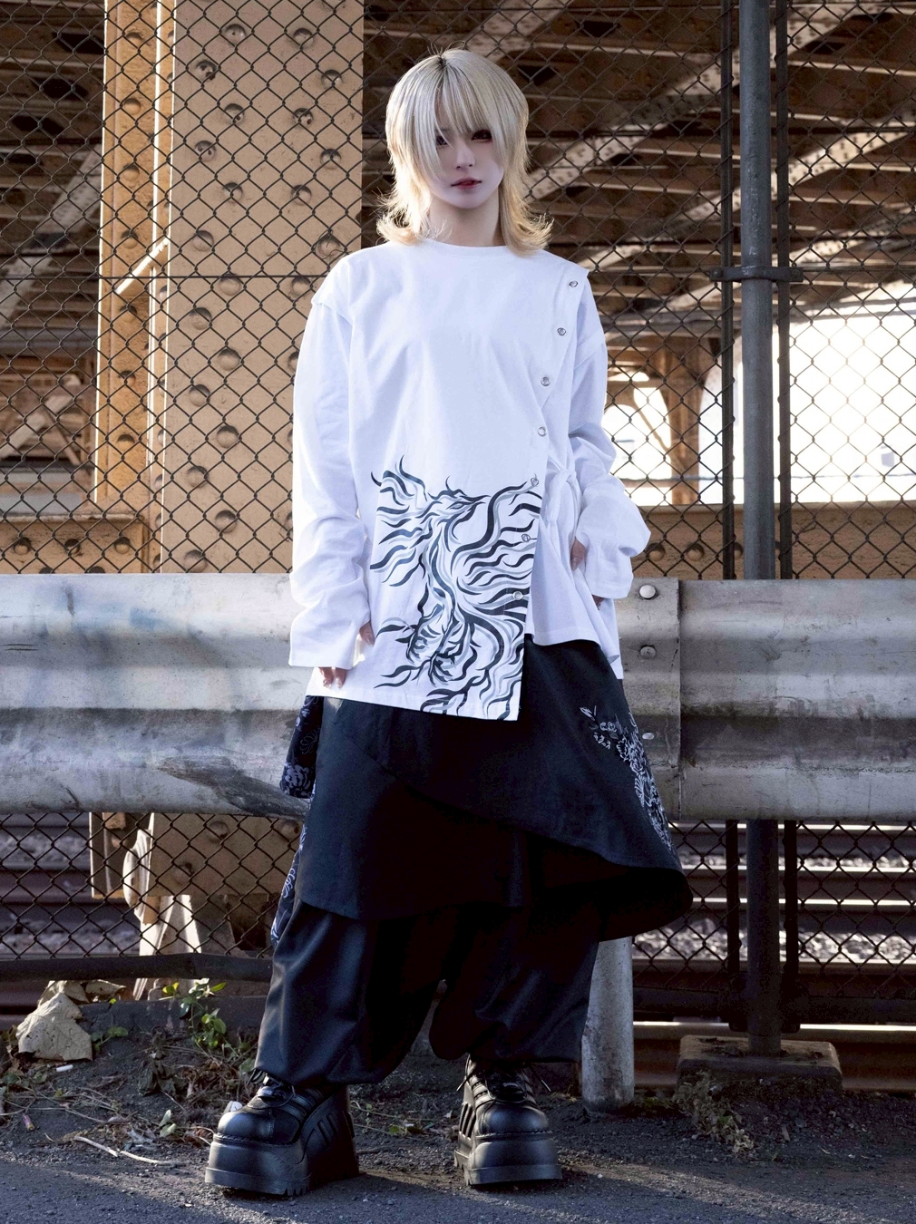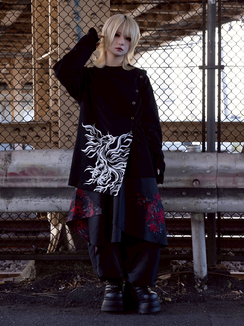 A long-sleeve cut-and-sew top featuring a powerful Suzaku (Vermilion Bird) motif, expressed through an asymmetrical construction.
