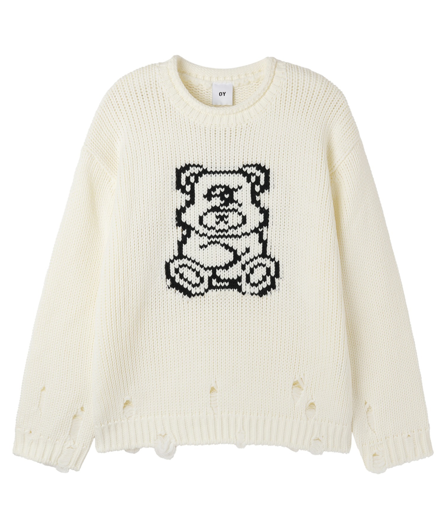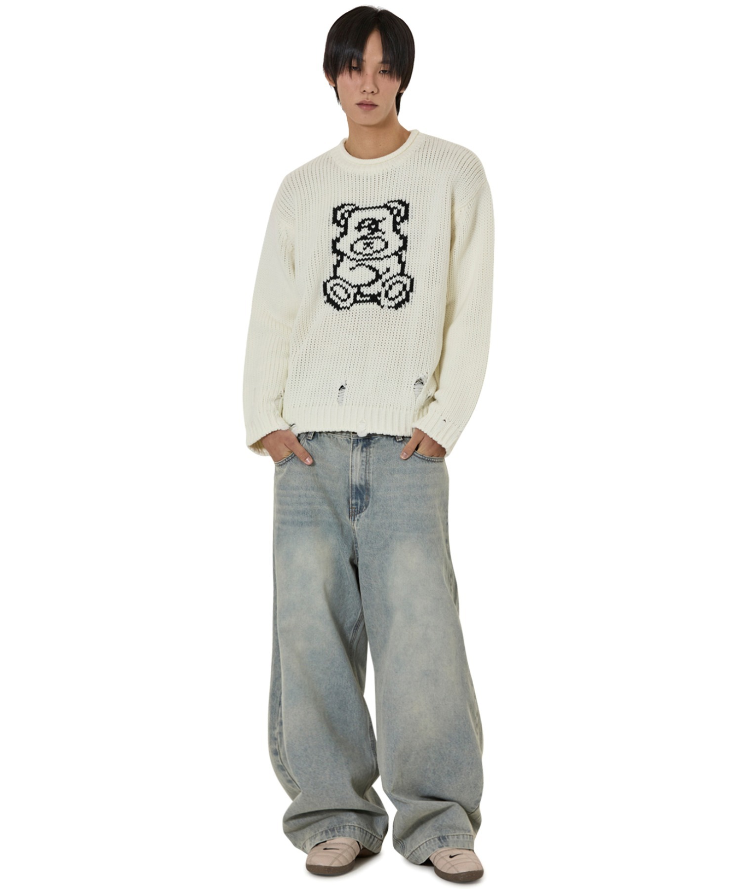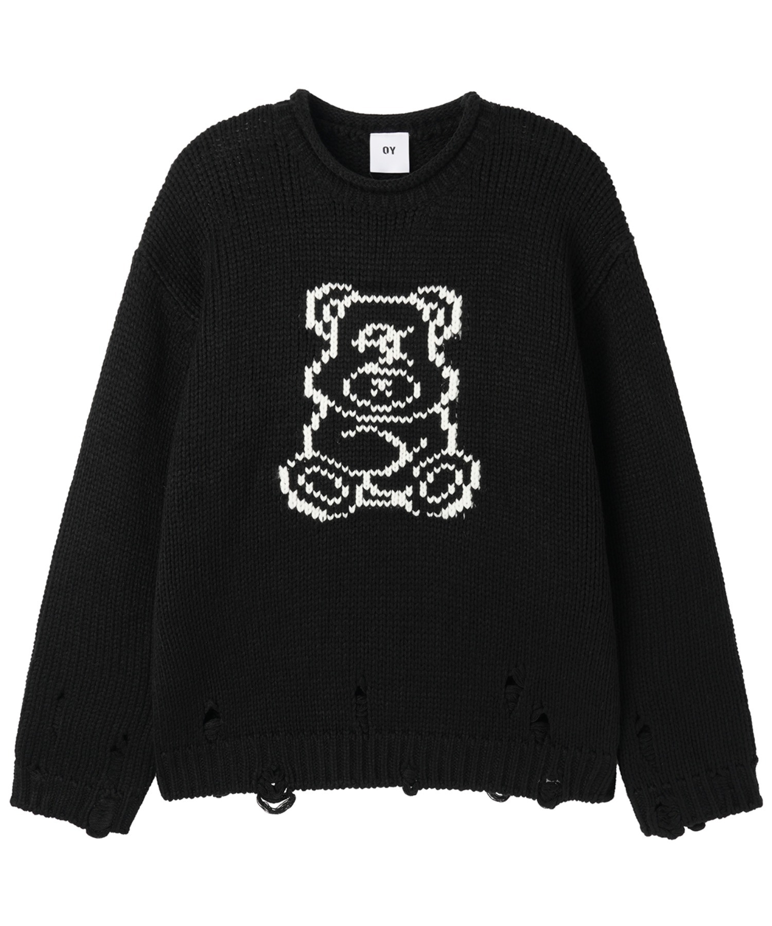 A standout piece featuring a boldly knitted dolly bear motif on the front, accented with subtle distressed details that enhance its street-inspired vibe.