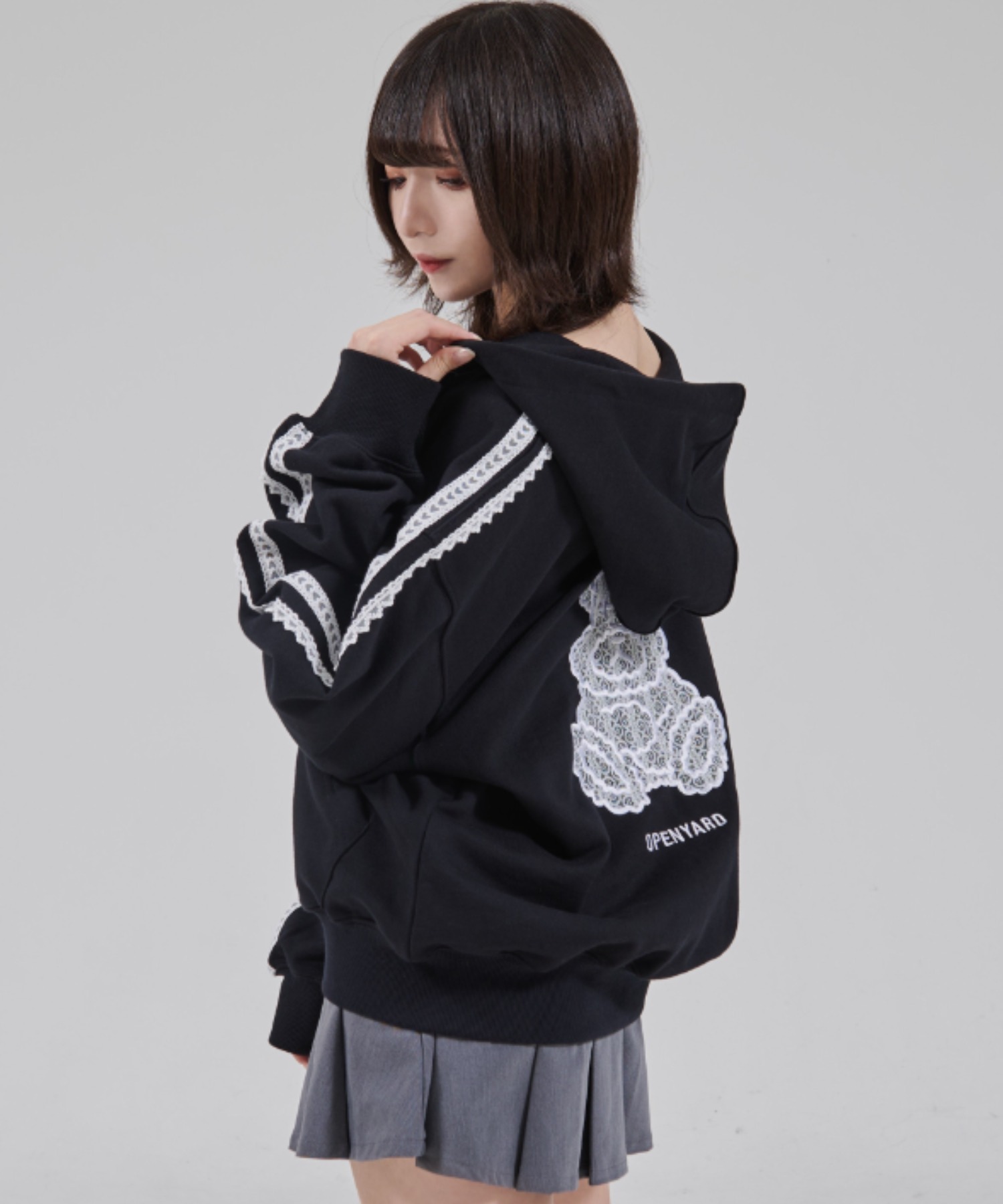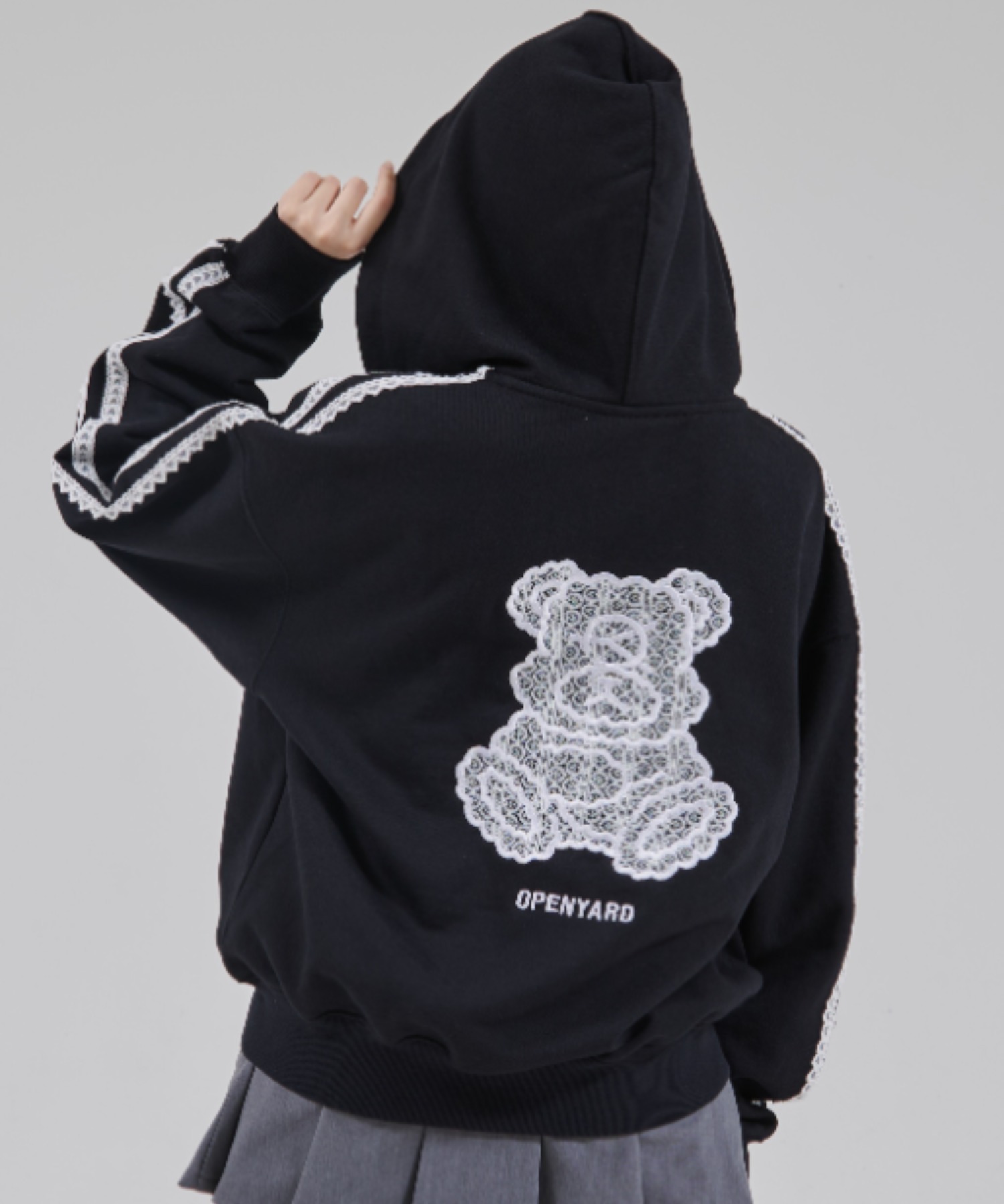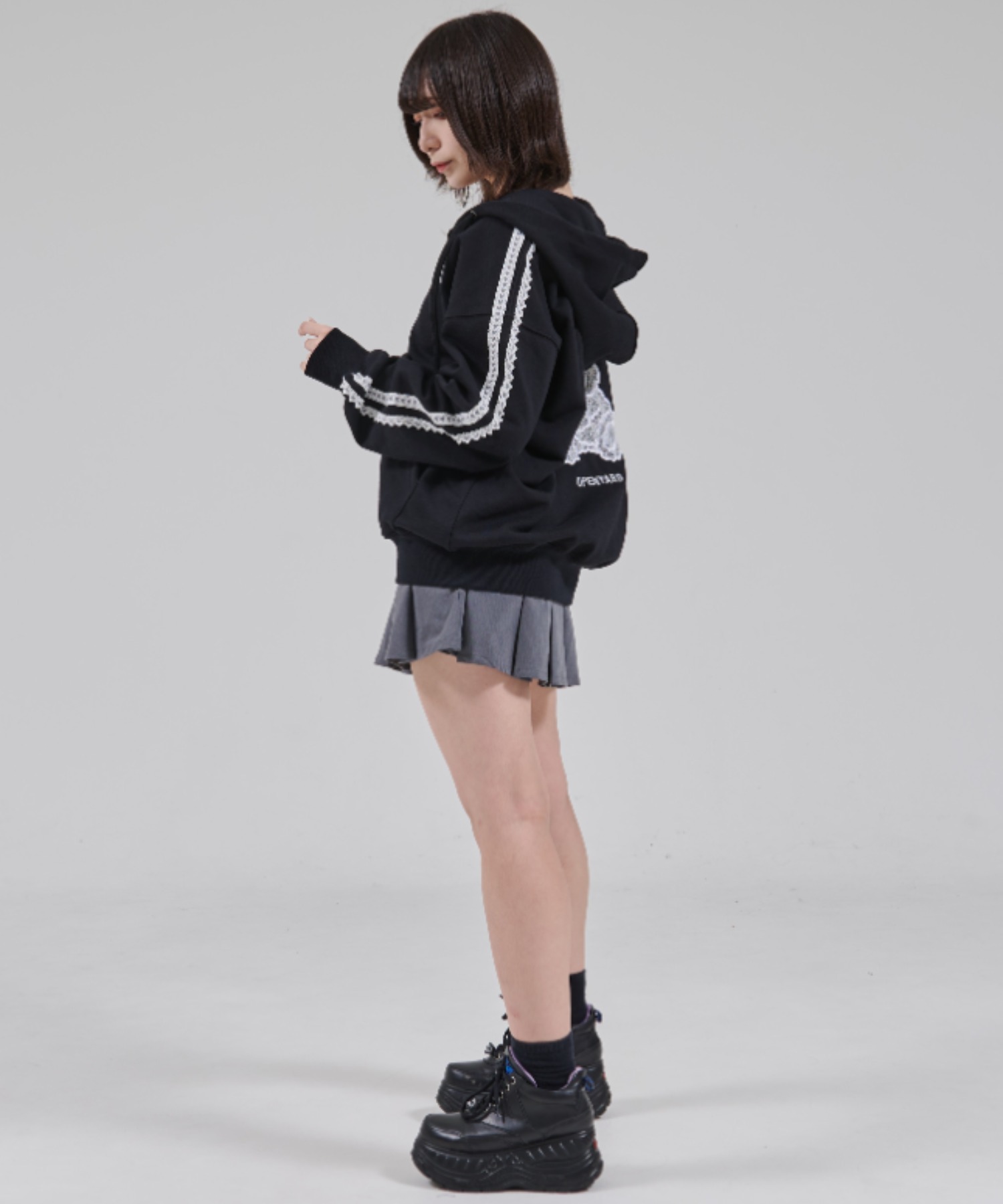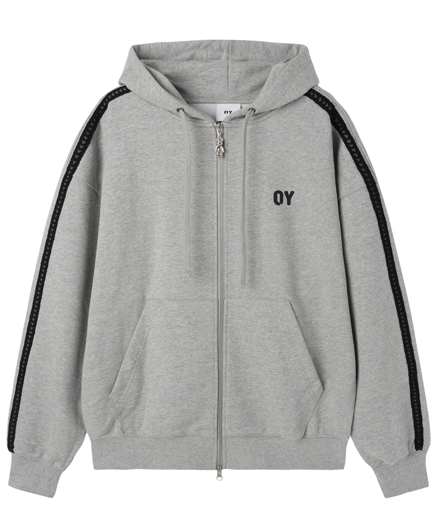 Lace lines run along the sleeves, adding an elegant touch to the simple zip-up hoodie.