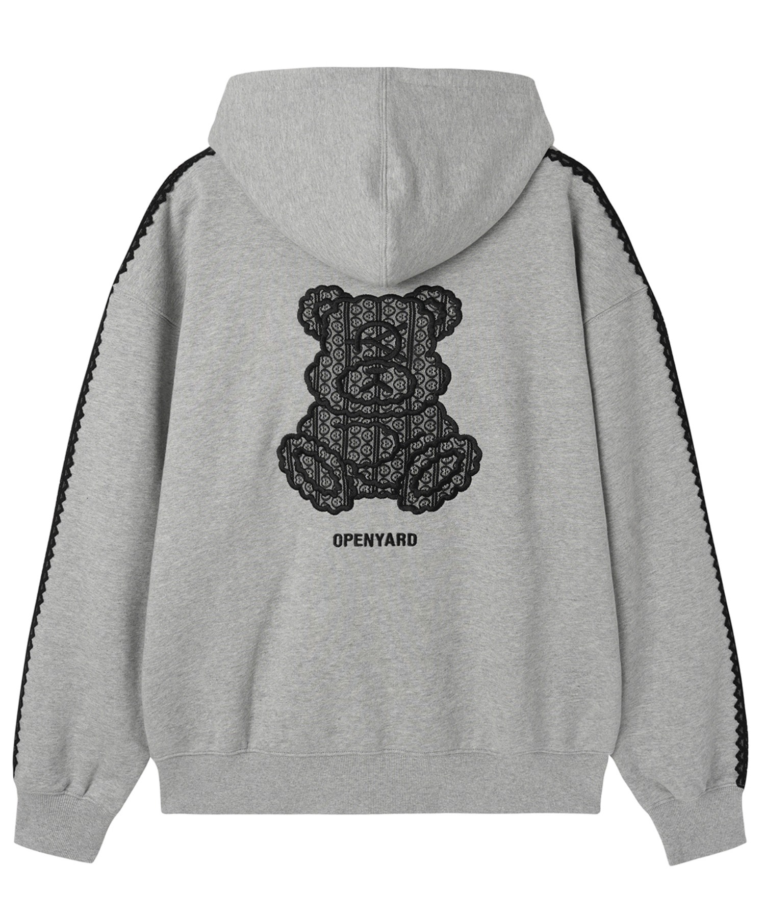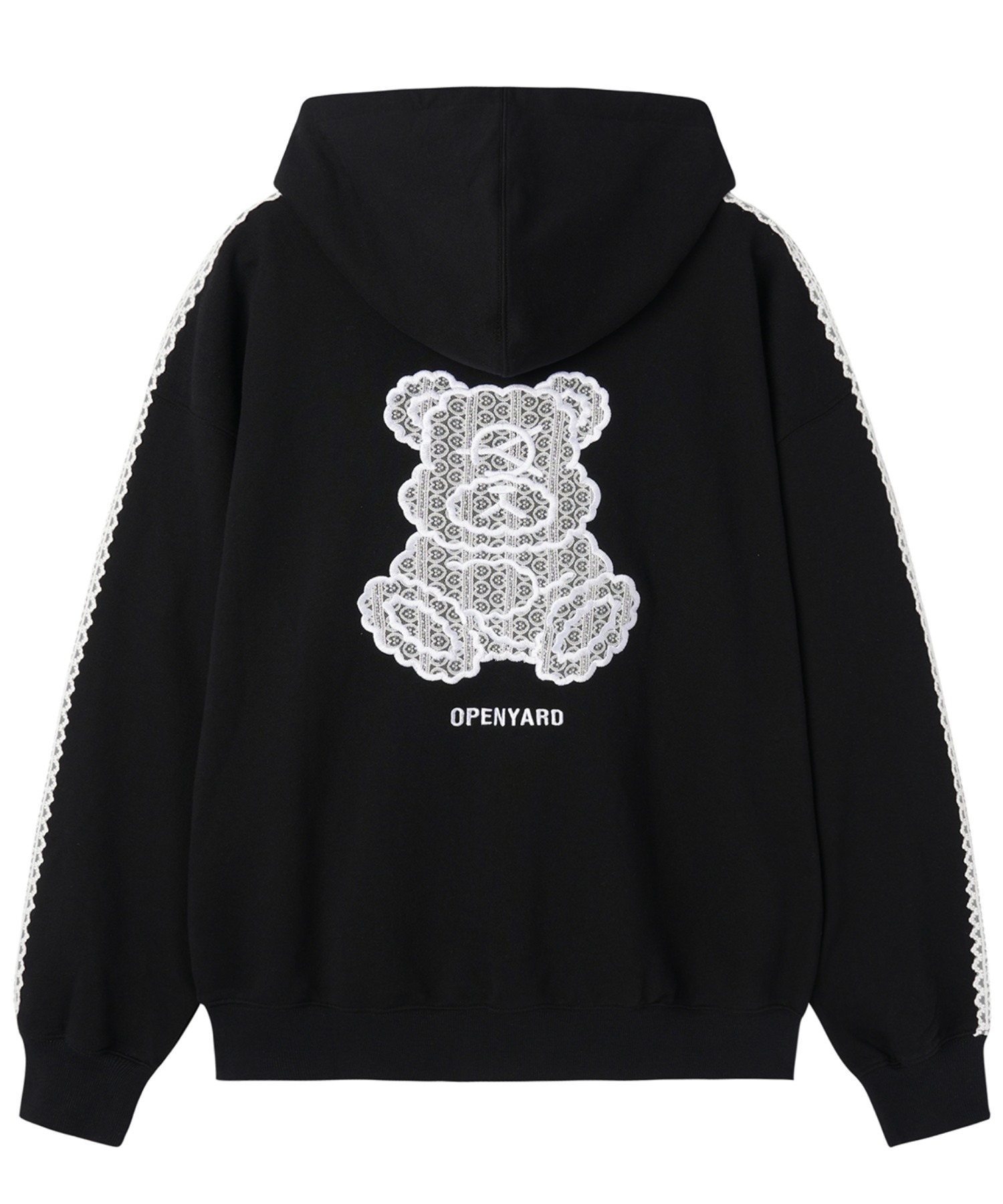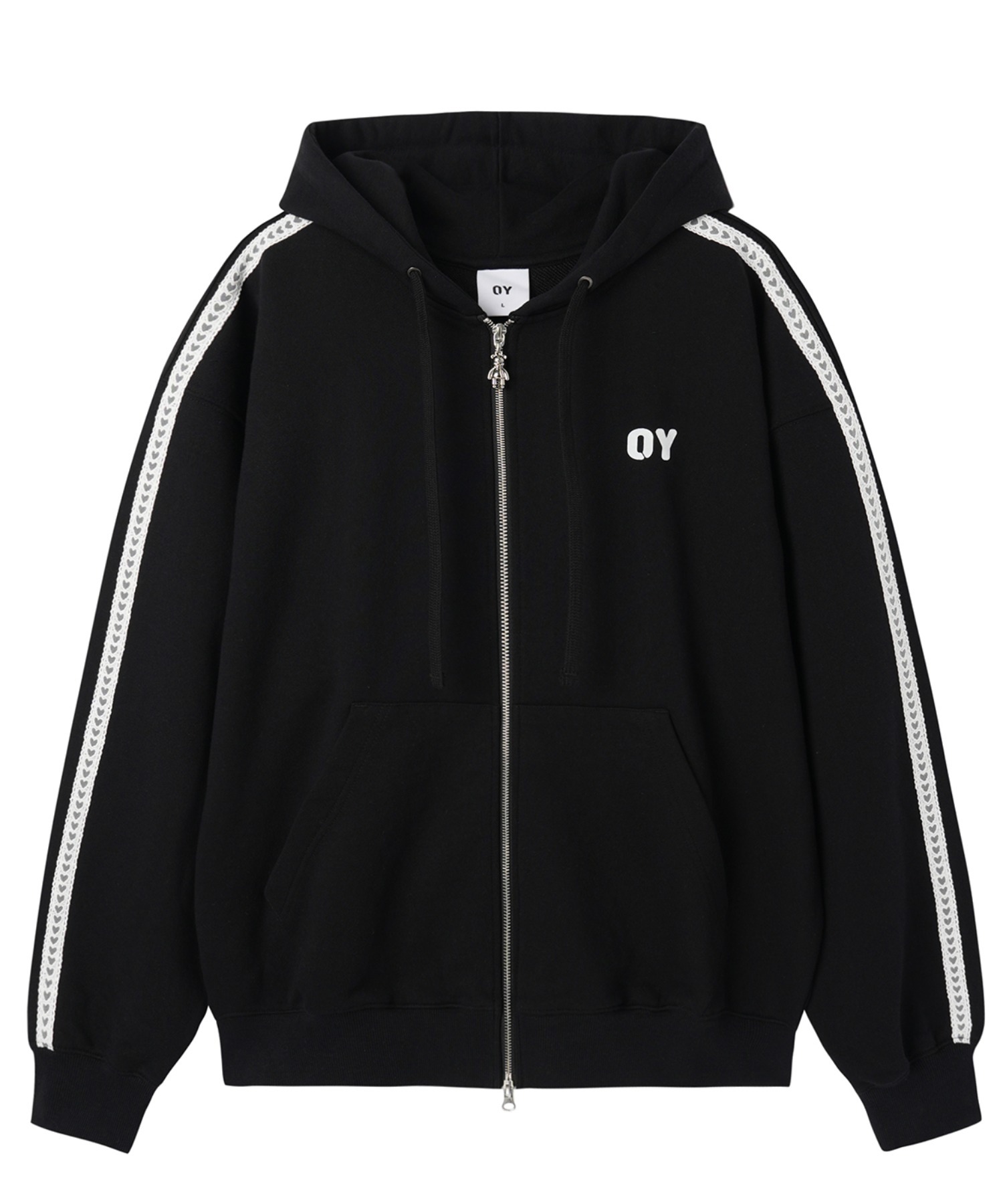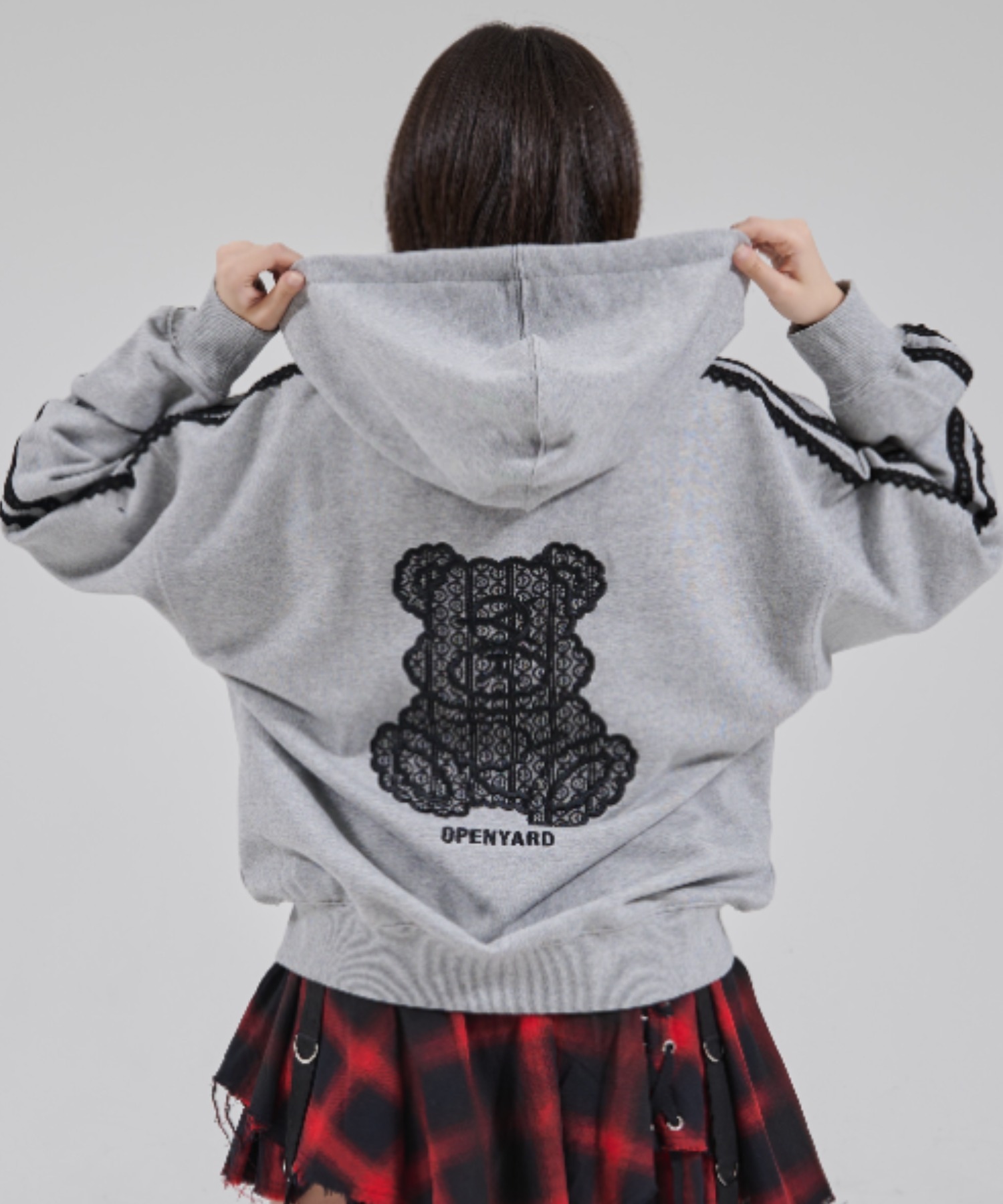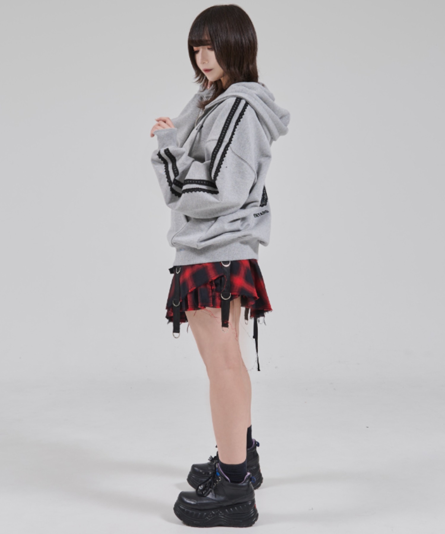 Lace lines run along the sleeves, adding an elegant touch to the simple zip-up hoodie.