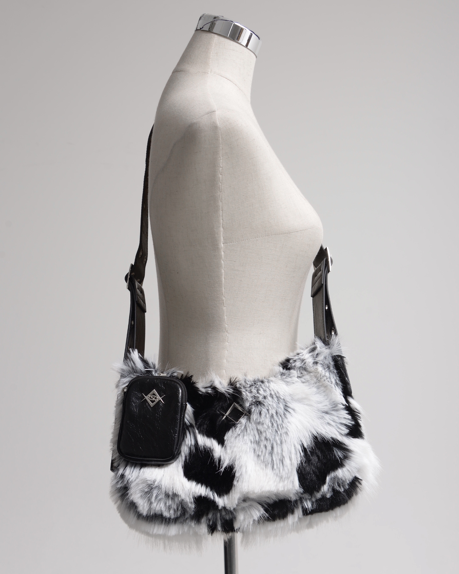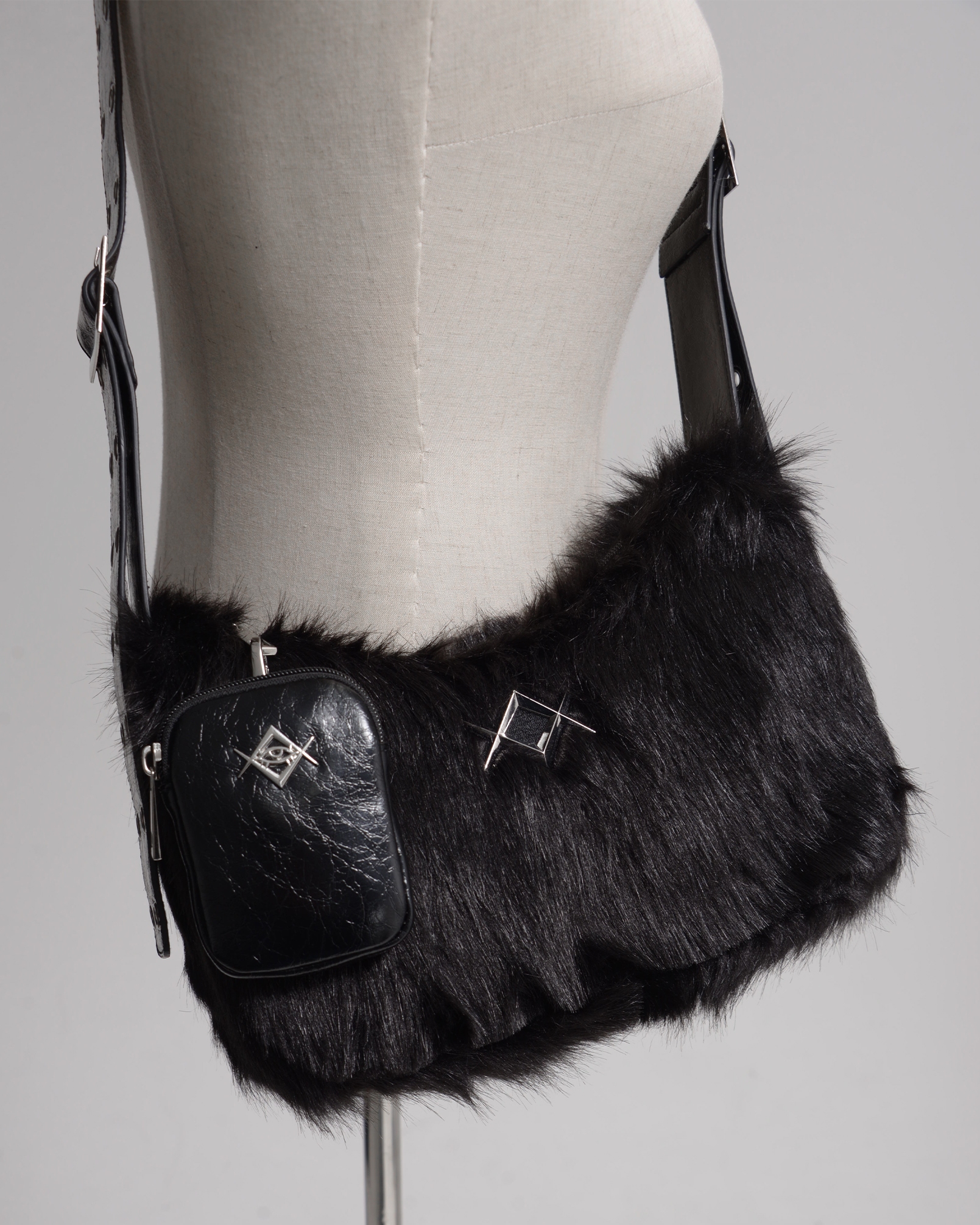 A shoulder bag featuring a practical half-moon silhouette combined with trendy faux-fur material.