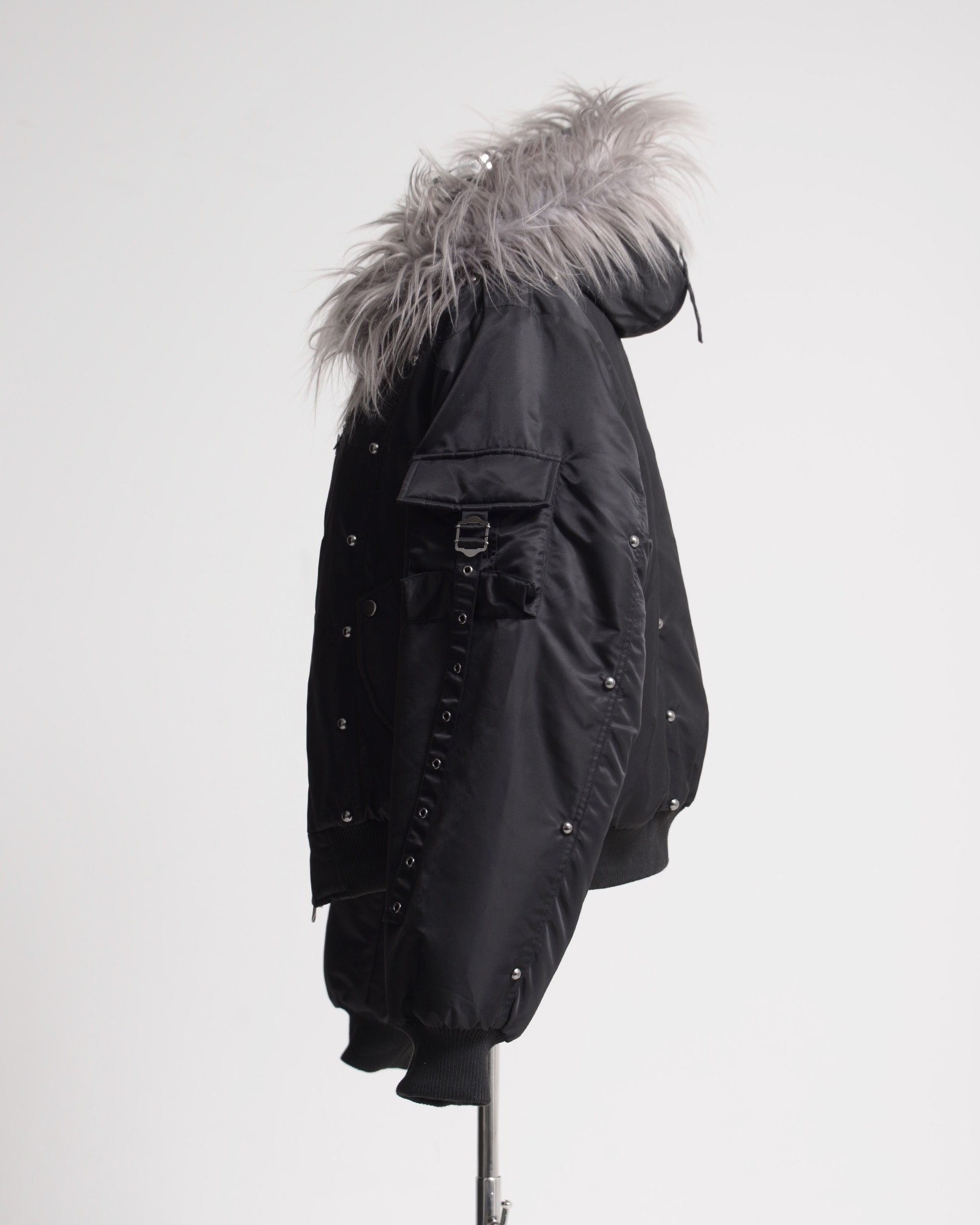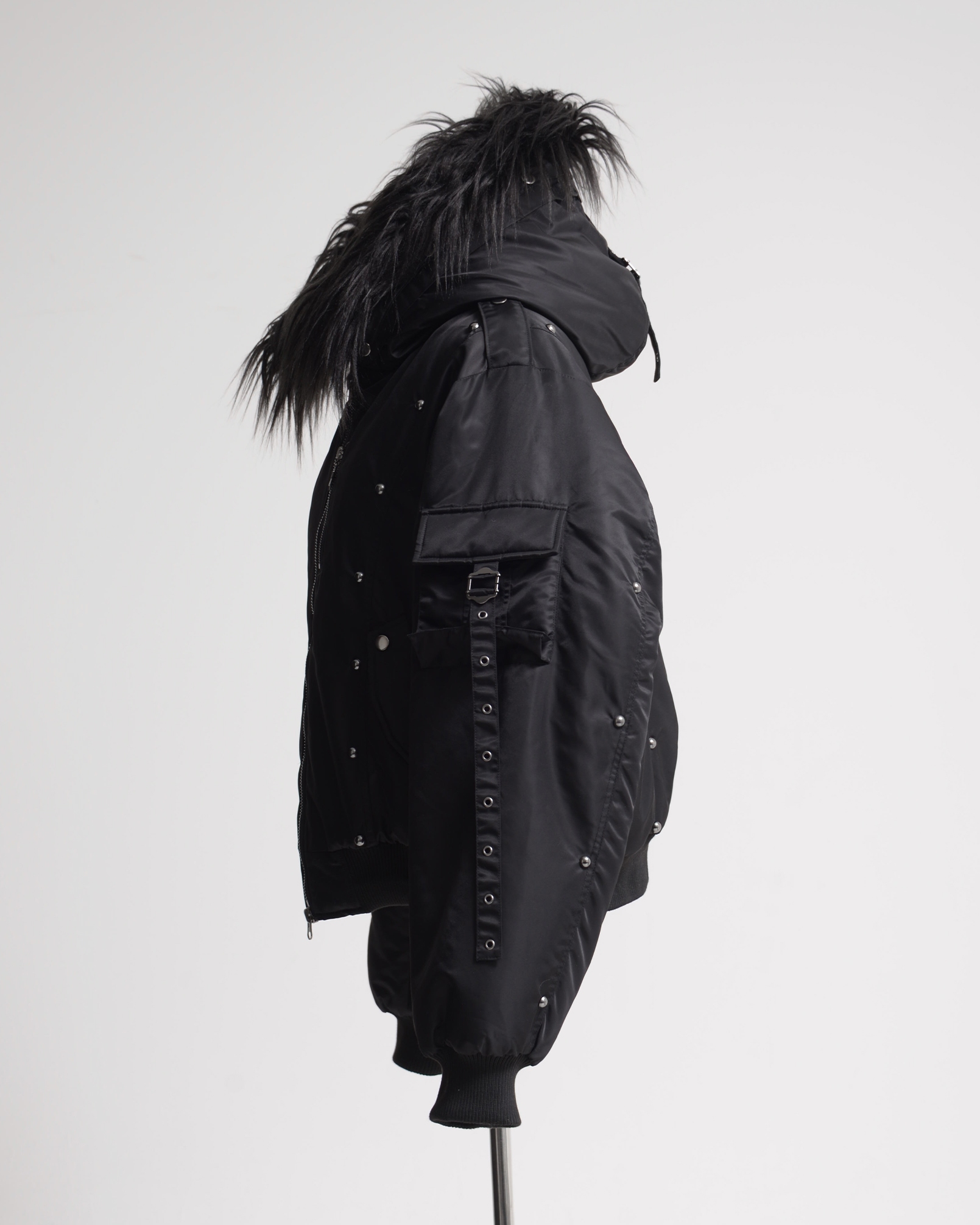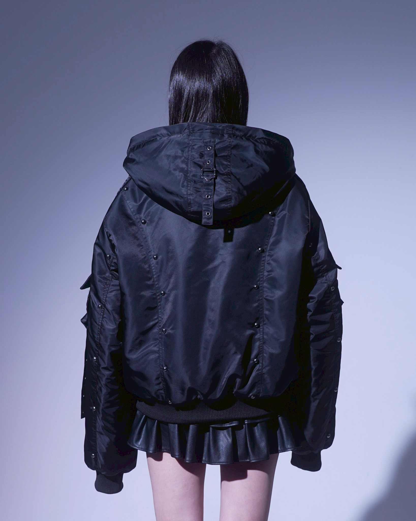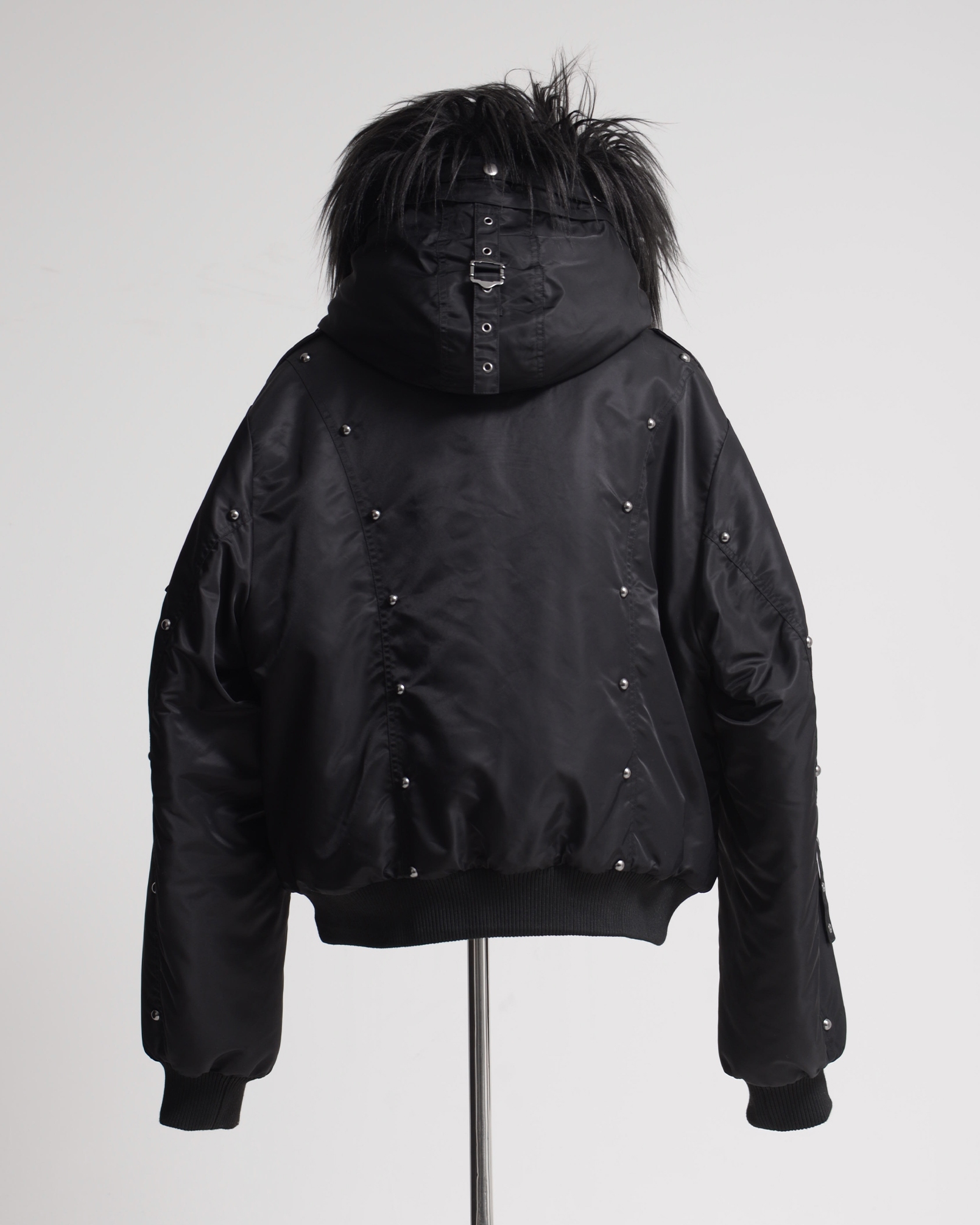 An N2B jacket featuring standout stud details placed along the switched design panels, with intricate accents that complement the nylon fabric.