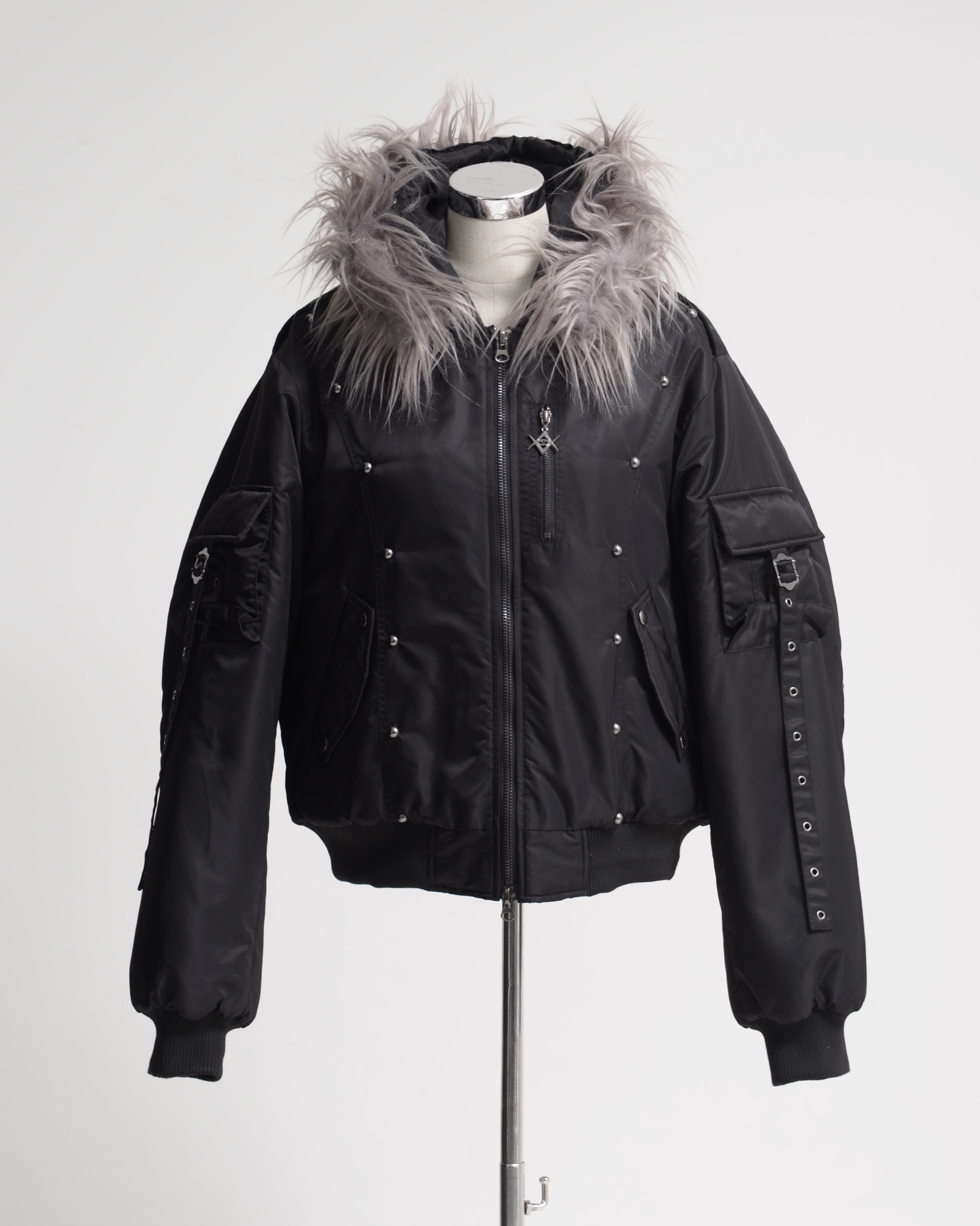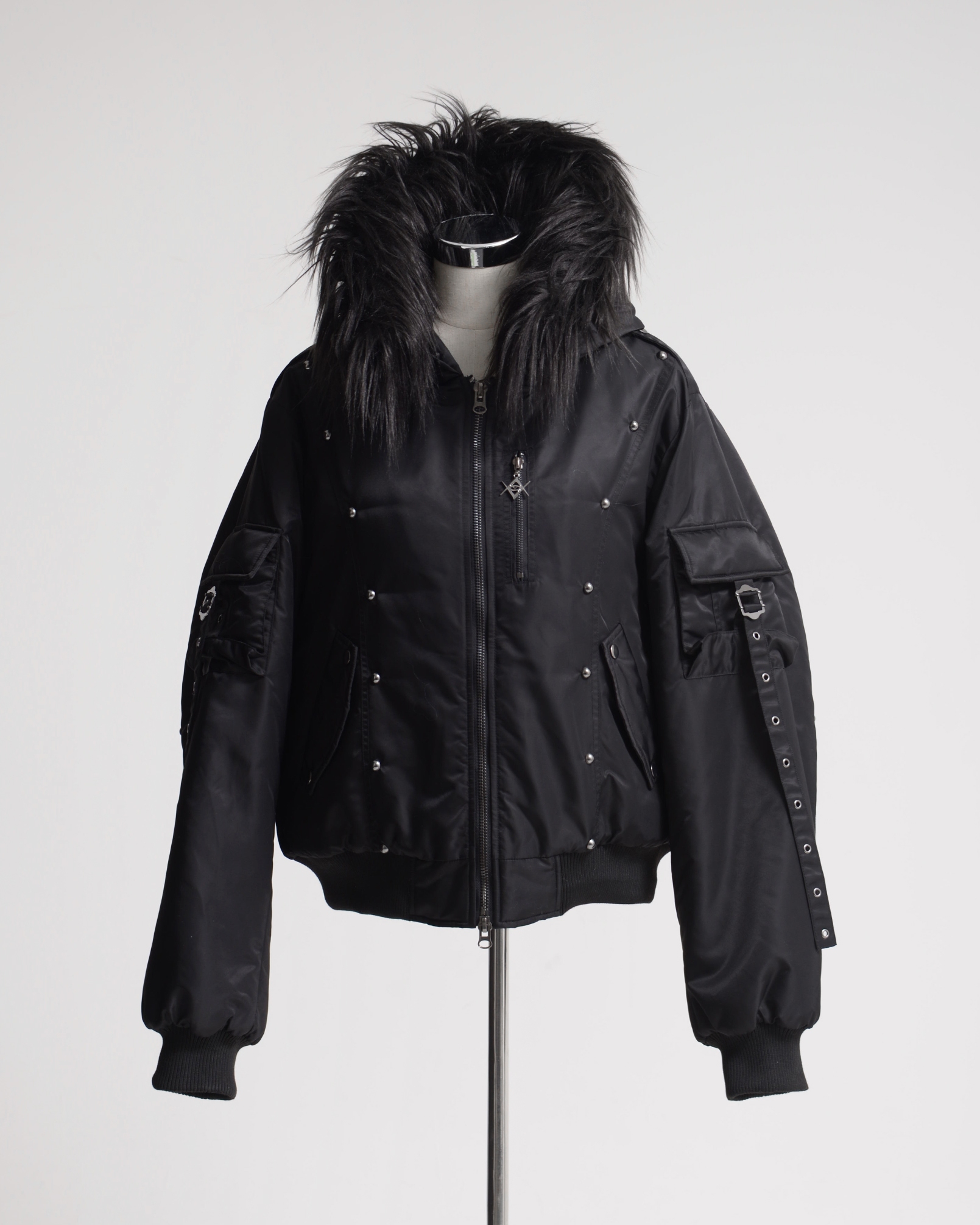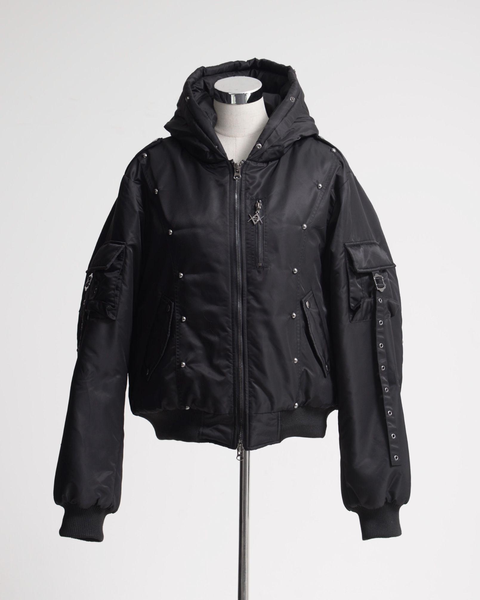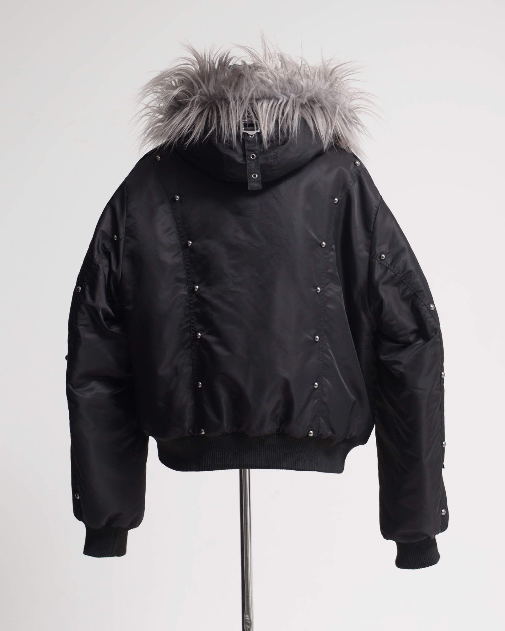 An N2B jacket featuring standout stud details placed along the switched design panels, with intricate accents that complement the nylon fabric.