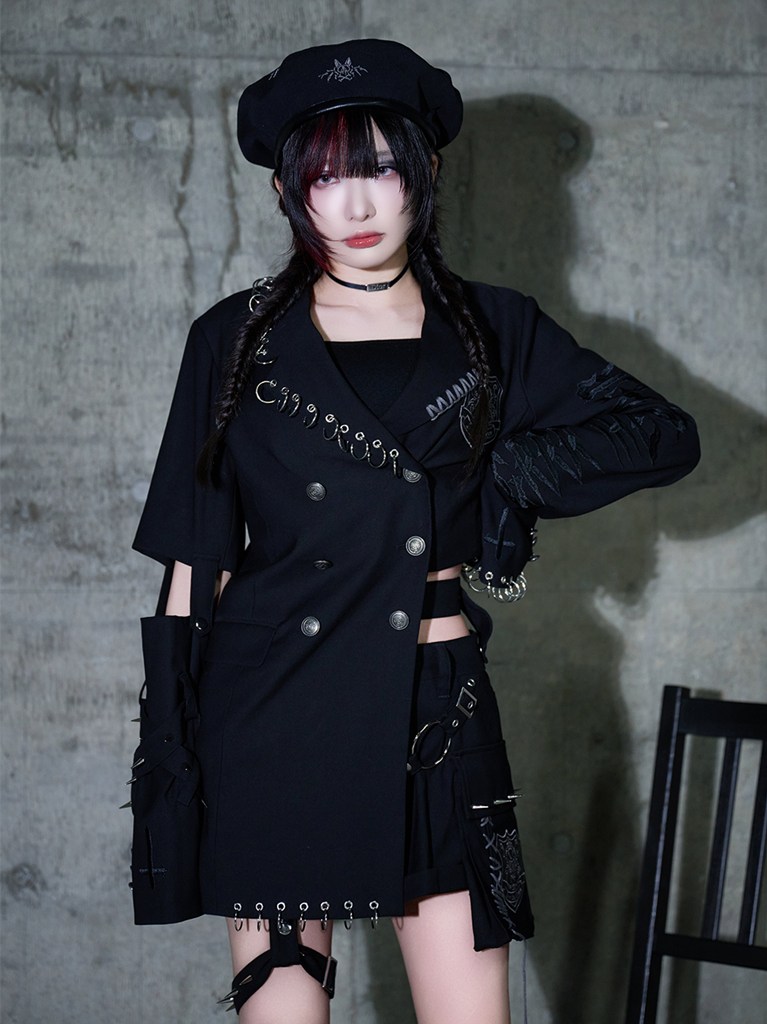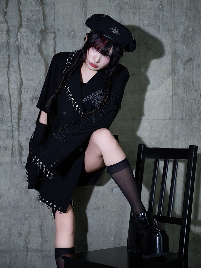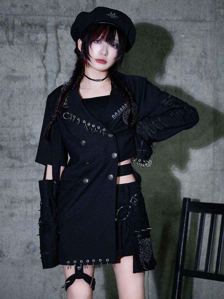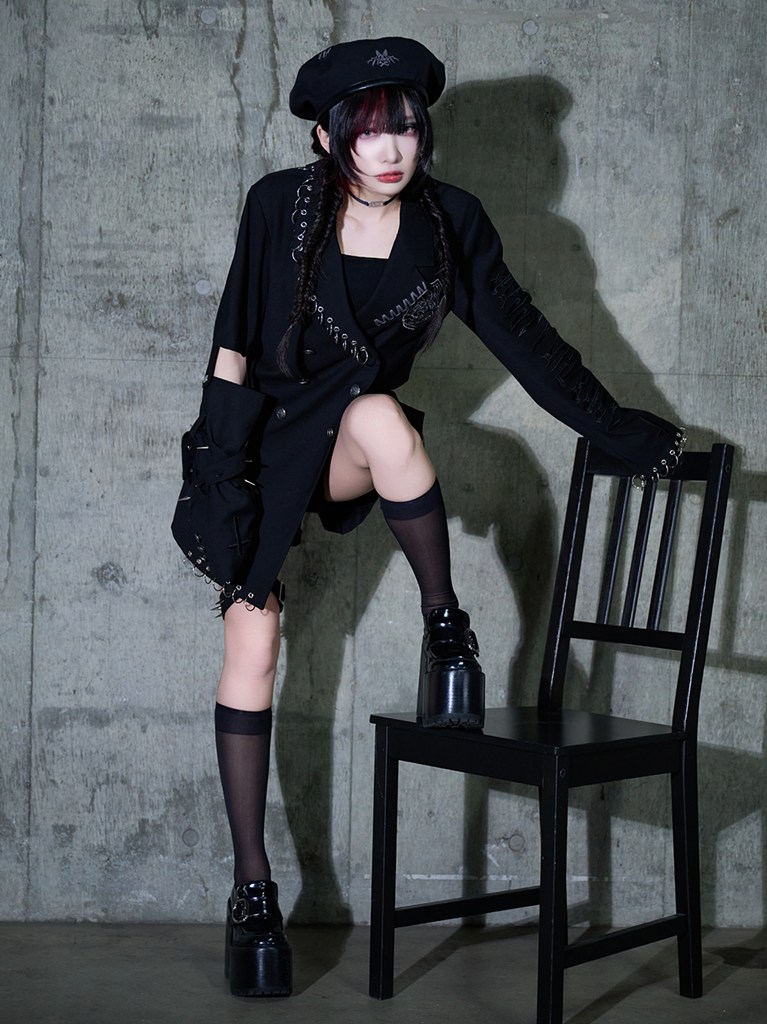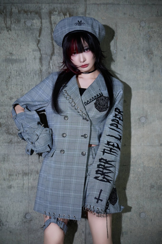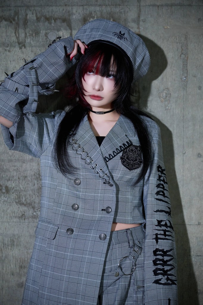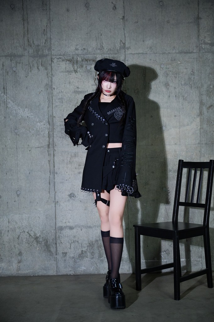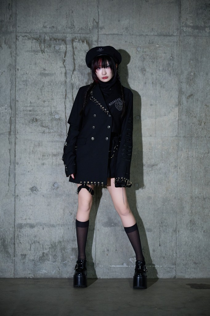 The waist features a double-layered design that adds a sharp, edgy element to your styling. The layout is asymmetrical, with a cargo pocket on the left and a basic pocket on the right. Layered fabric patches are applied throughout the garment to evoke the ruggedness and sense of decadence unique to the brand Grrr. Additionally, the right leg is equipped with a leg garter, serving as a distinctive, high-impact accent.