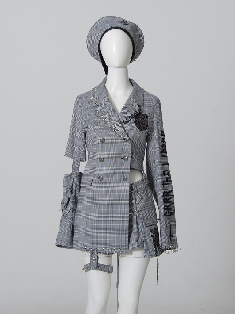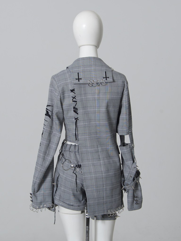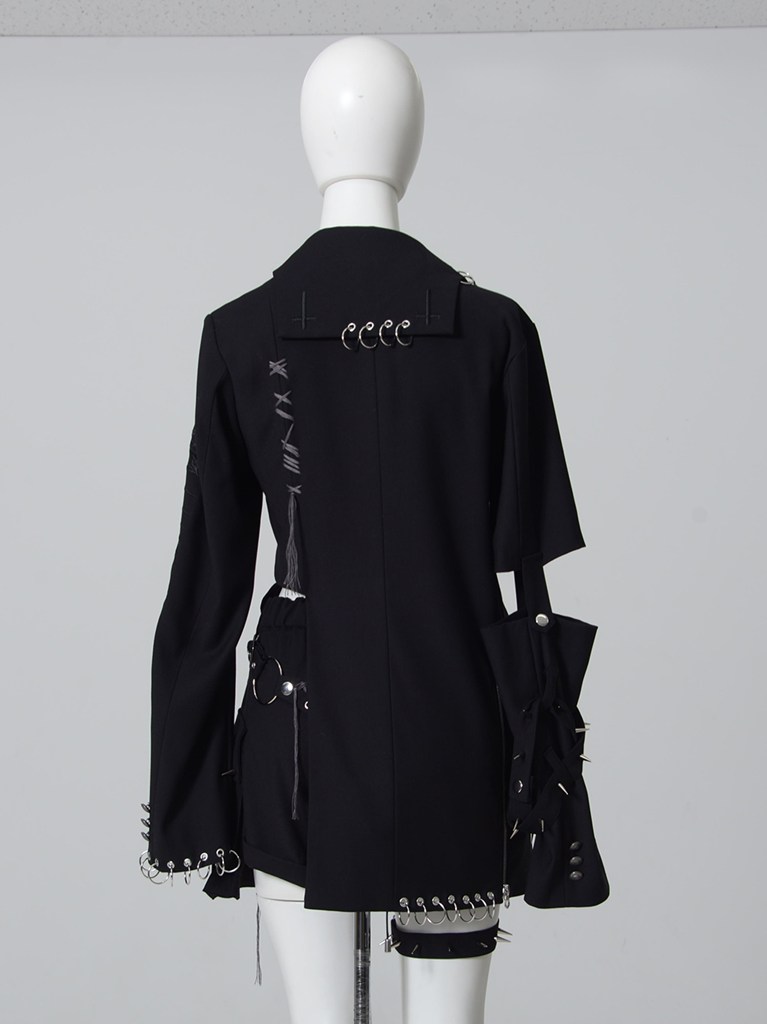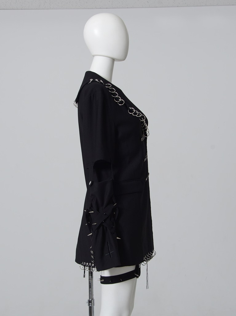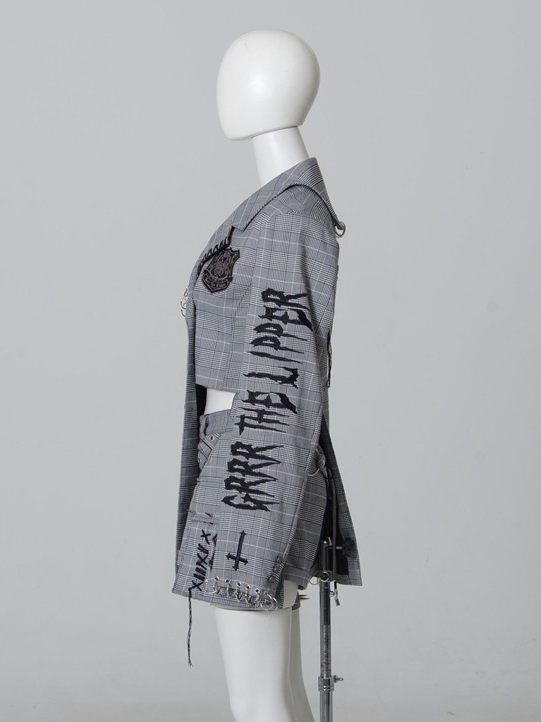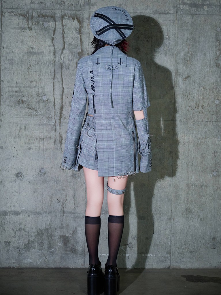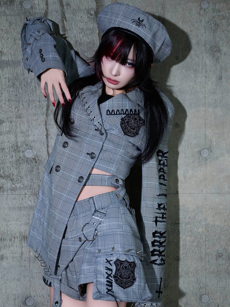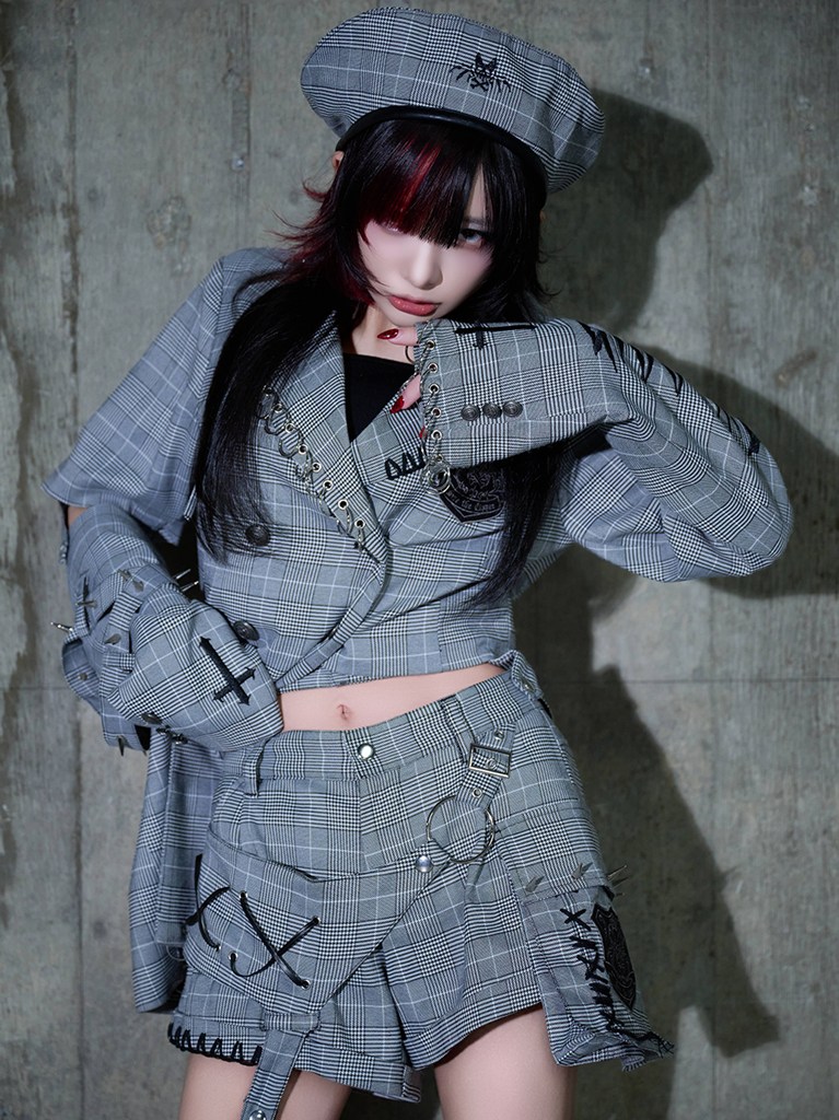 The waist features a double-layered design that adds a sharp, edgy element to your styling. The layout is asymmetrical, with a cargo pocket on the left and a basic pocket on the right. Layered fabric patches are applied throughout the garment to evoke the ruggedness and sense of decadence unique to the brand Grrr. Additionally, the right leg is equipped with a leg garter, serving as a distinctive, high-impact accent.