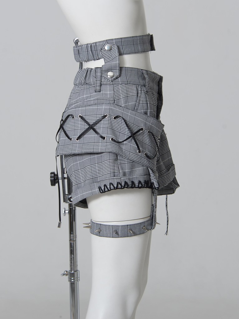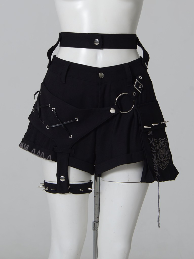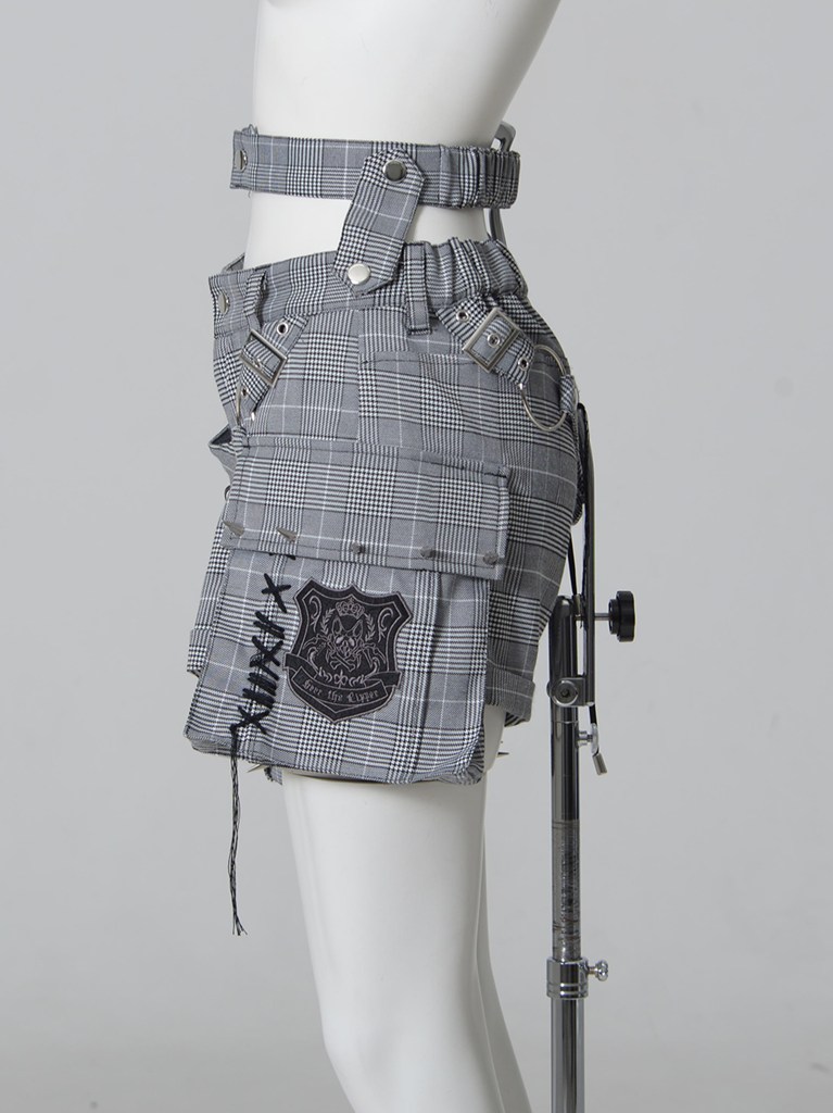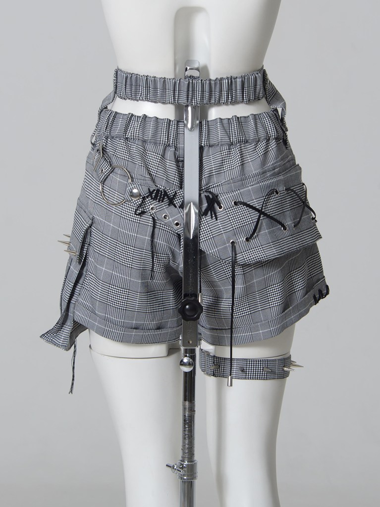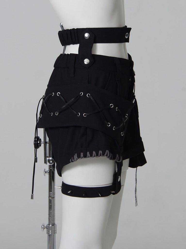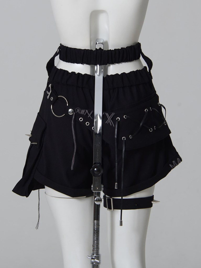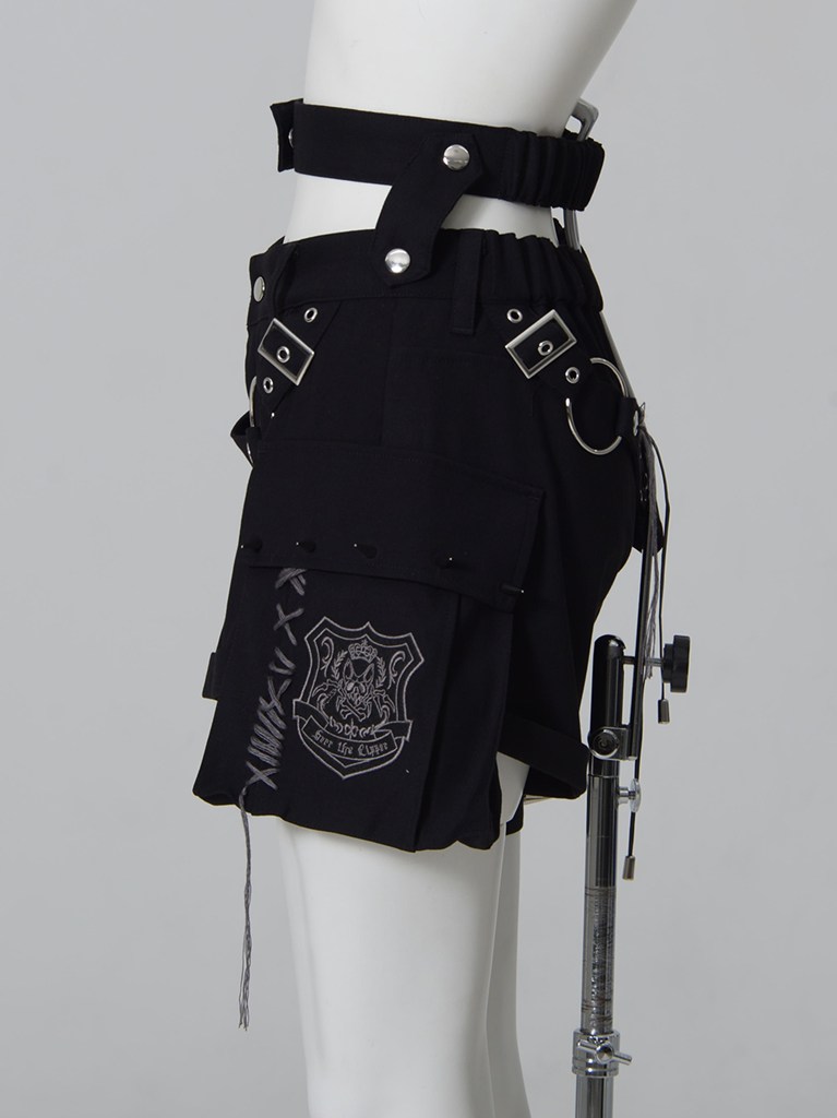 Featuring a double-layered waist specification that adds an edgy touch to your styling. The asymmetrical design consists of a cargo pocket on the left and a basic pocket on the right. Layered fabric is applied throughout to evoke the ruggedness and sense of decadence unique to Grrr. The right leg is equipped with a leg garter, serving as a high-impact, functional accent.
