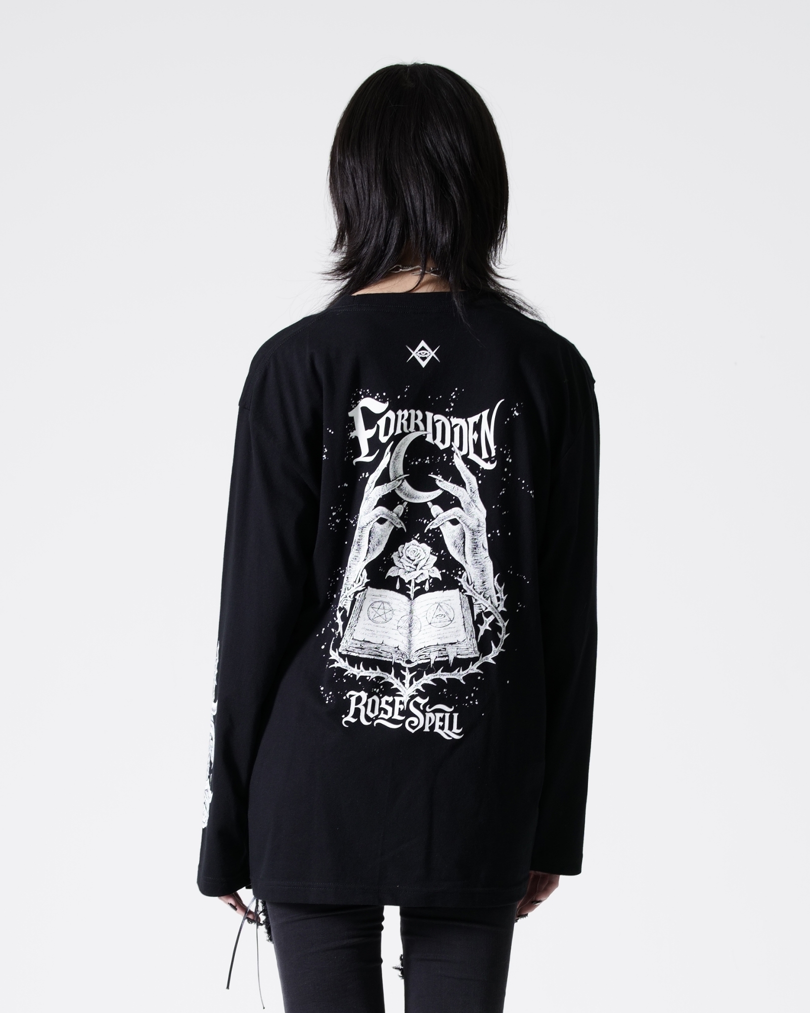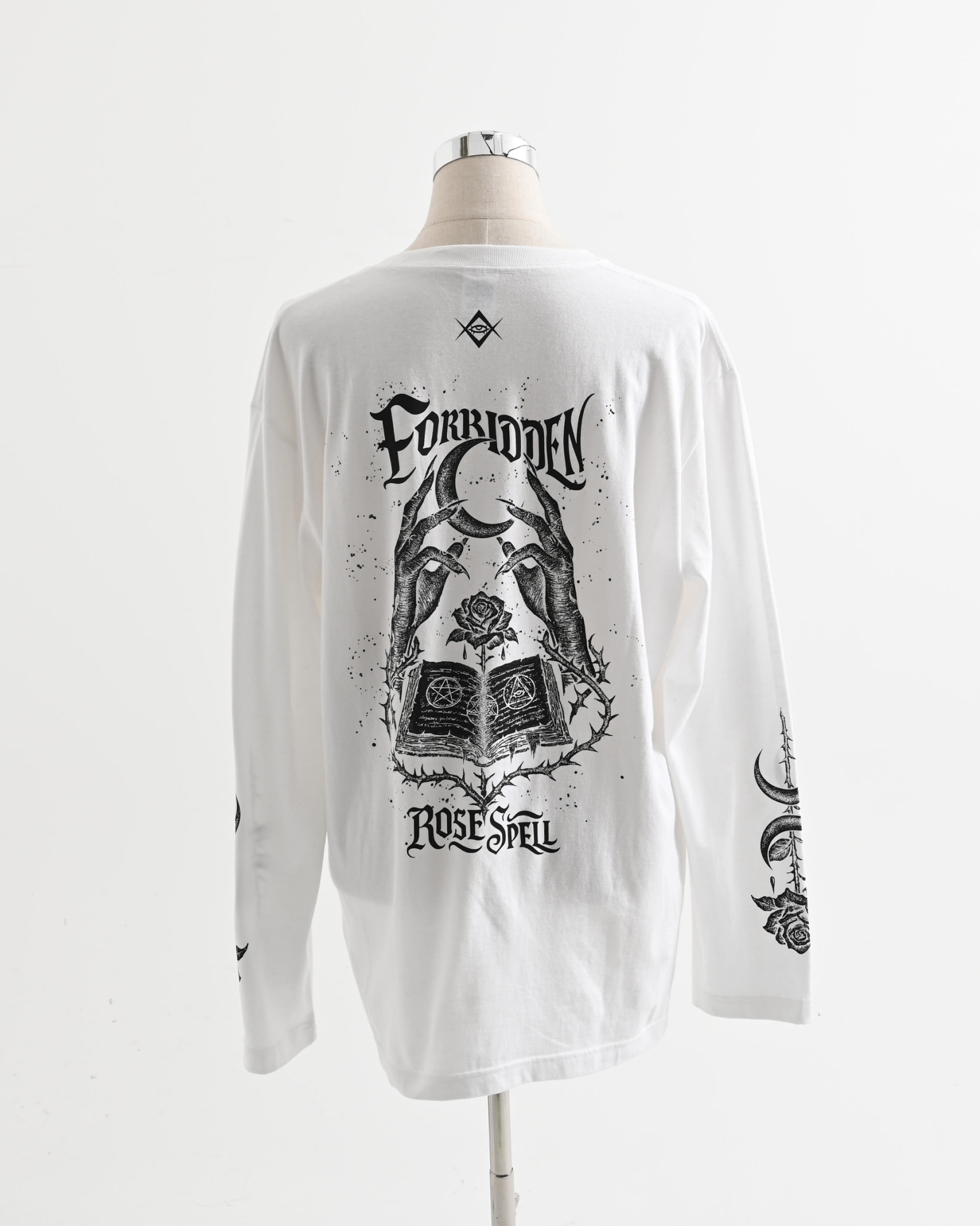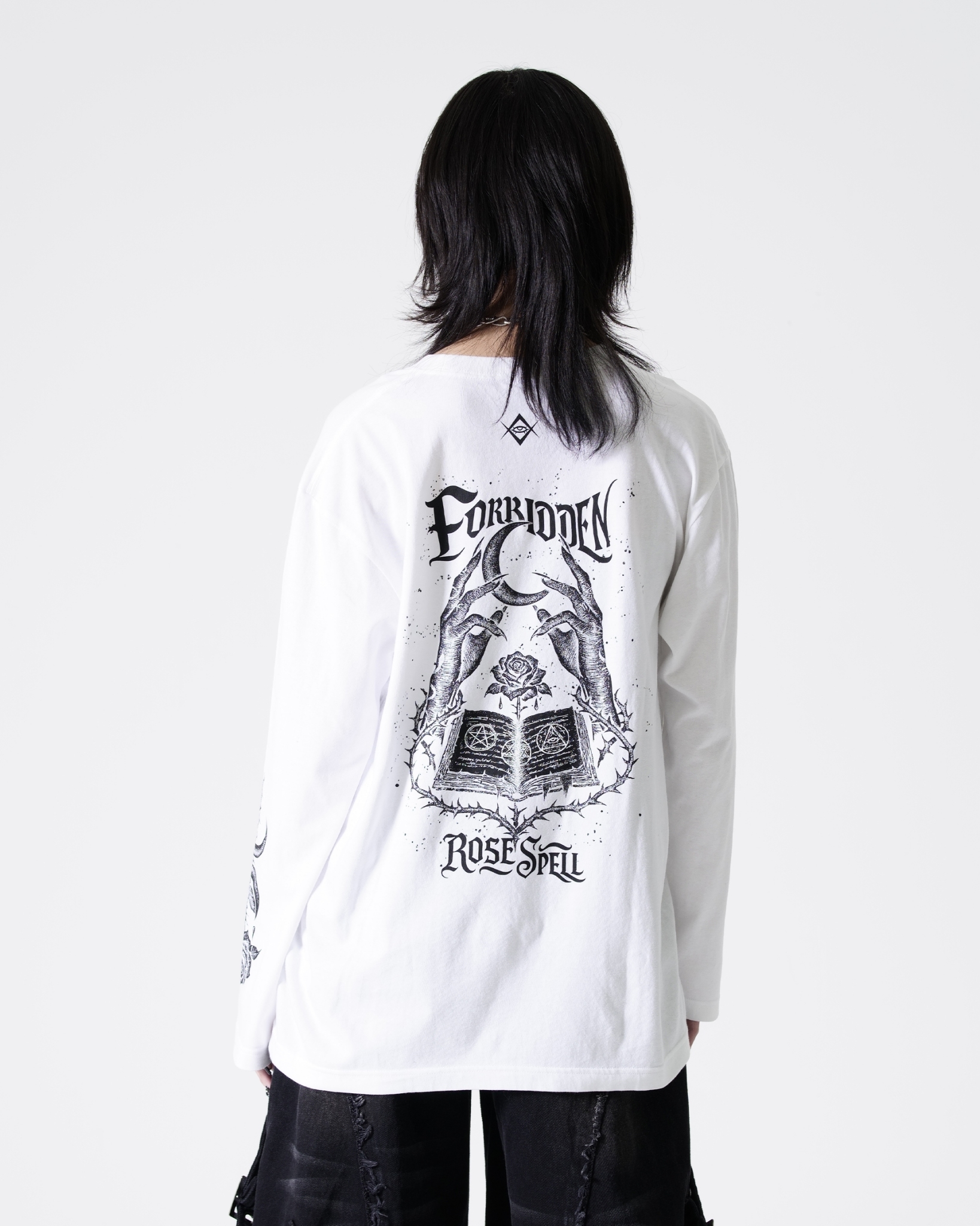 A long-sleeve cut-and-sew top featuring mysterious artwork.
