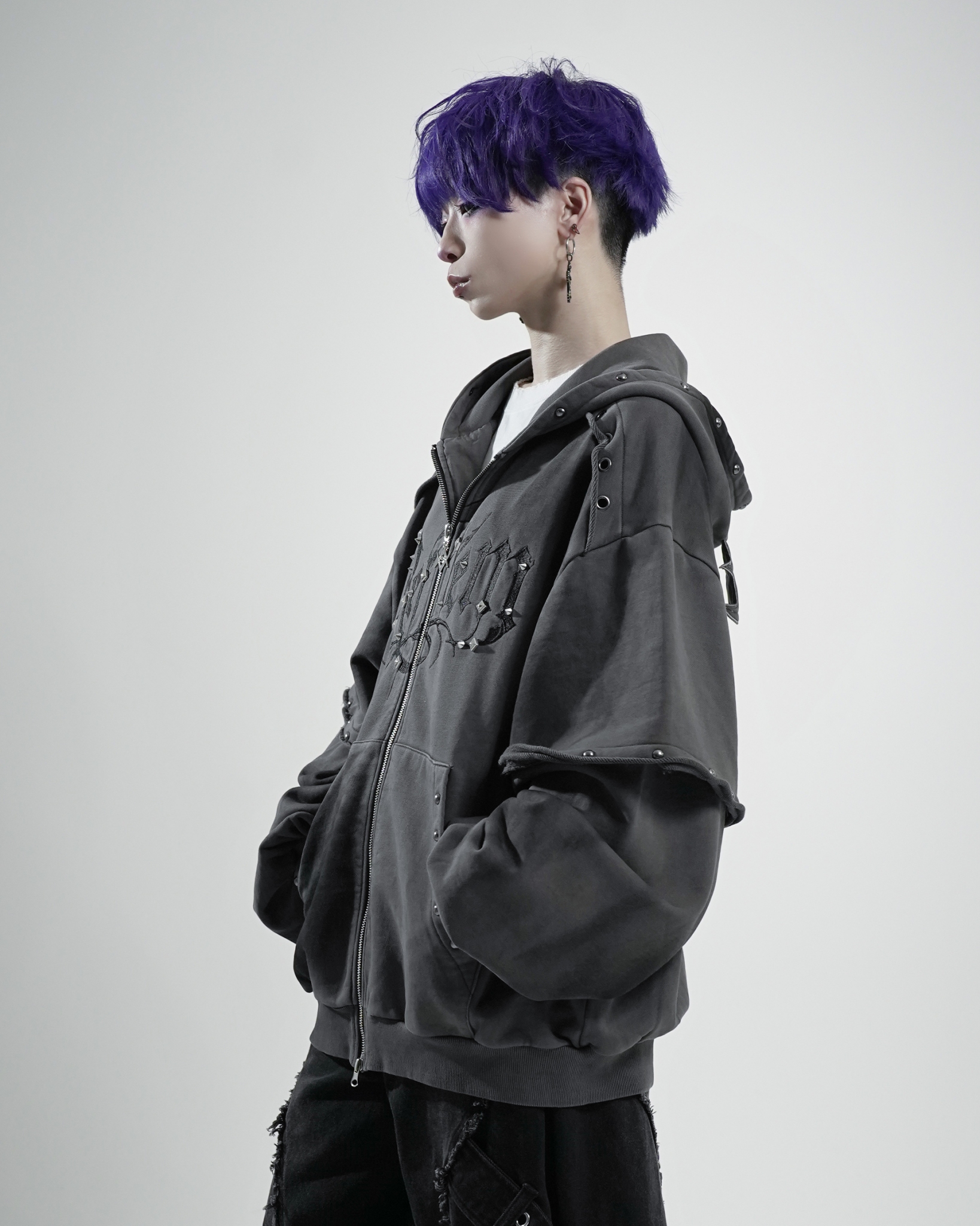 The layered sleeve construction adds a strong street influence, giving this piece a bold, urban presence.