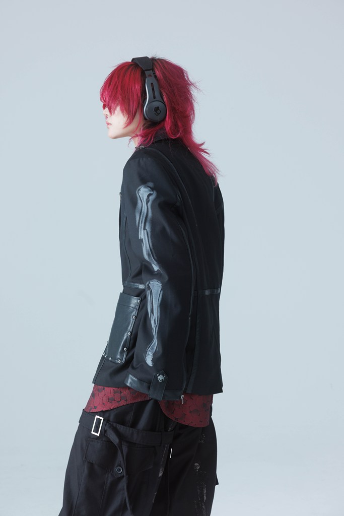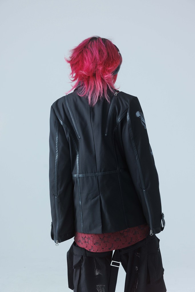 A tailored jacket defined by a sharply refined silhouette and a dark, commanding presence.