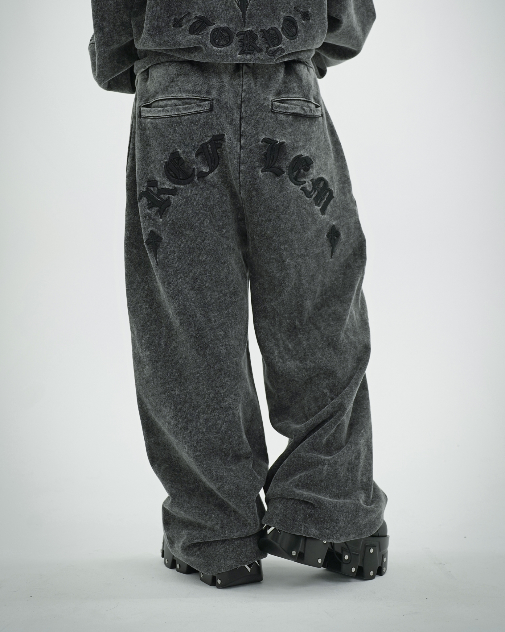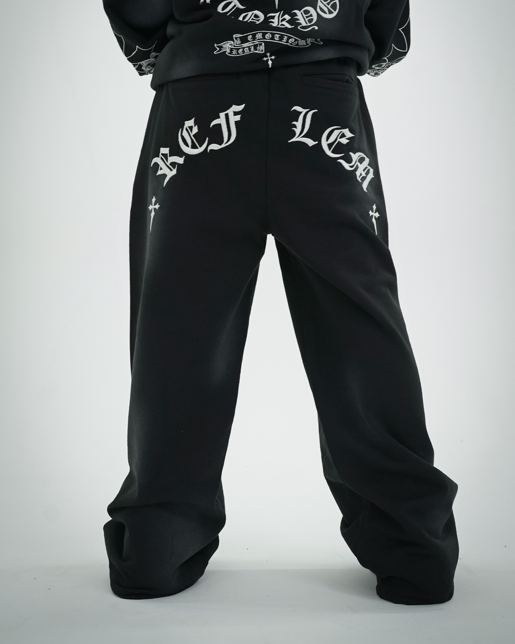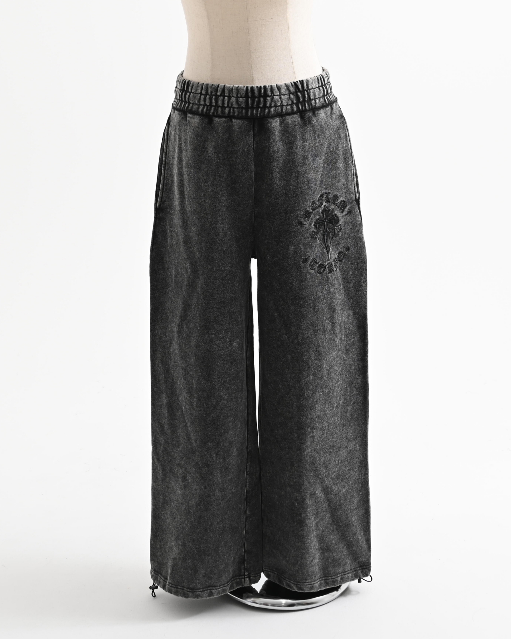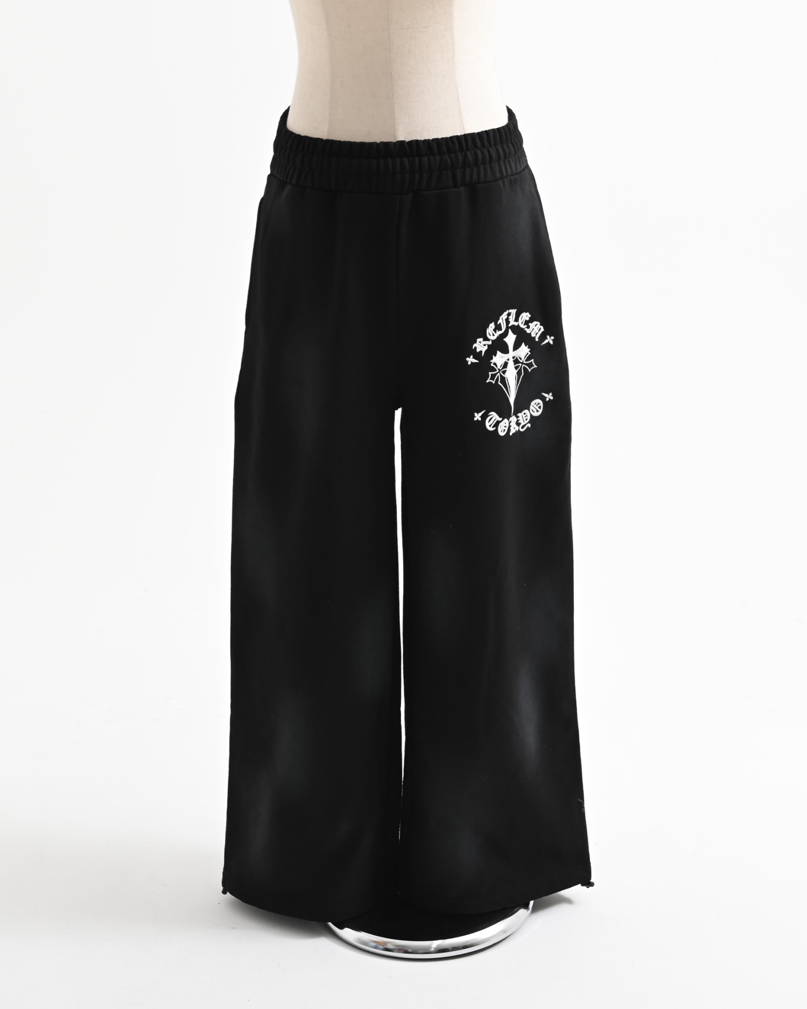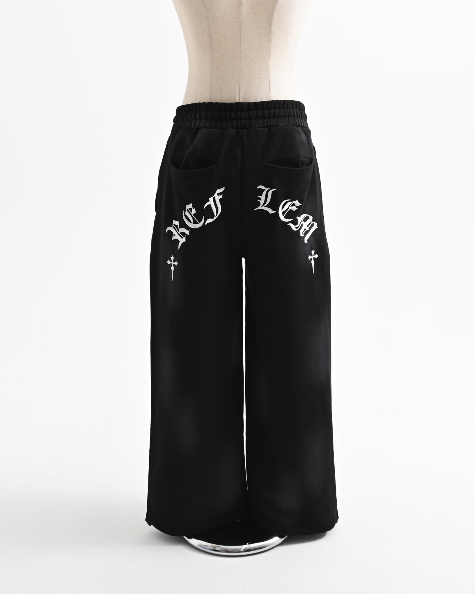 Sweat wide pants featuring cross motifs and Old English logo embroidery.