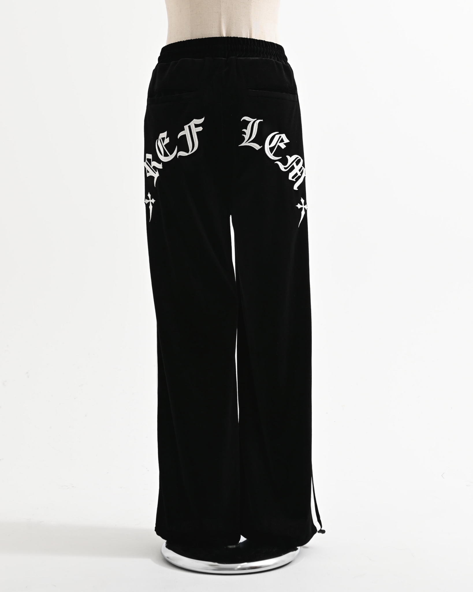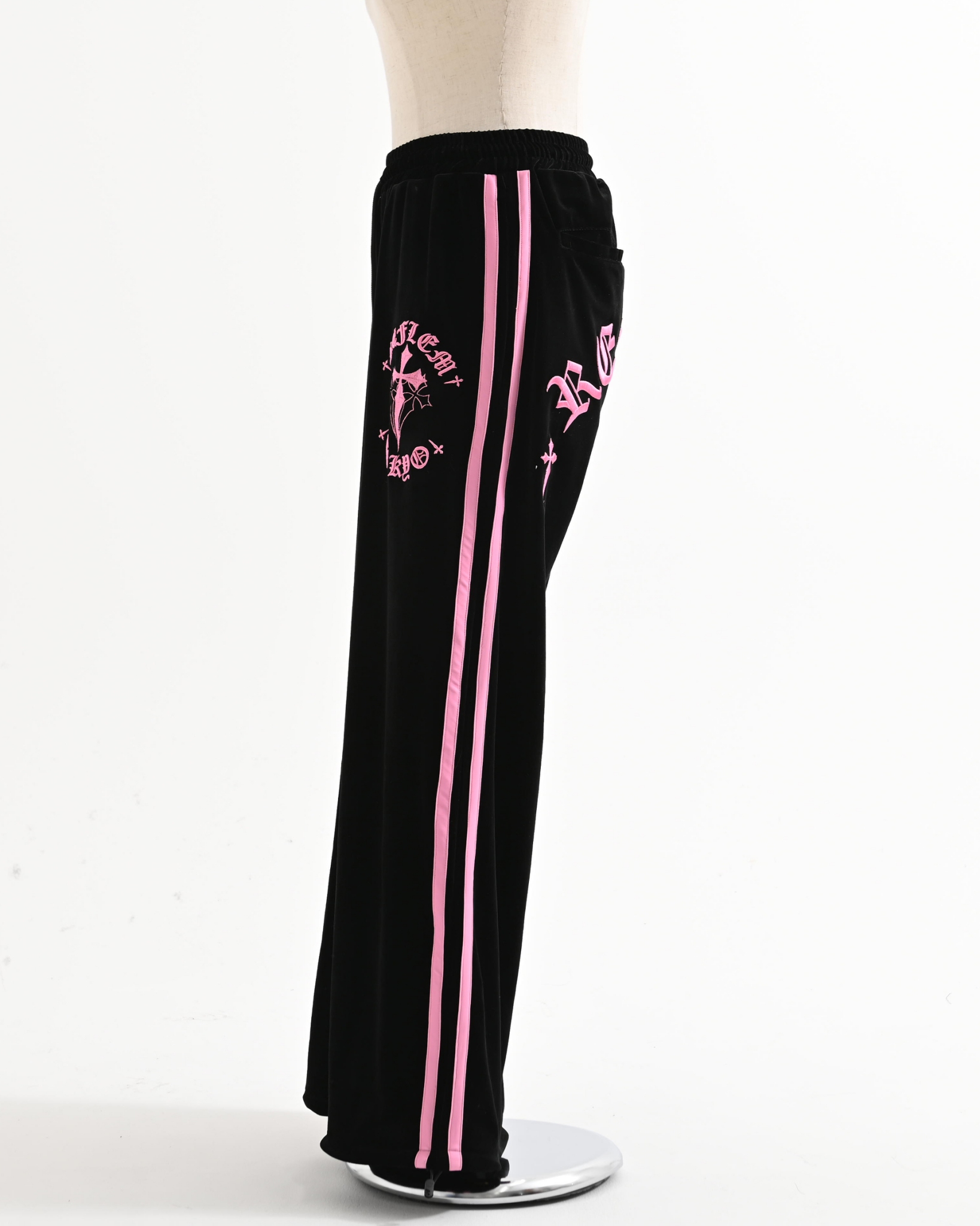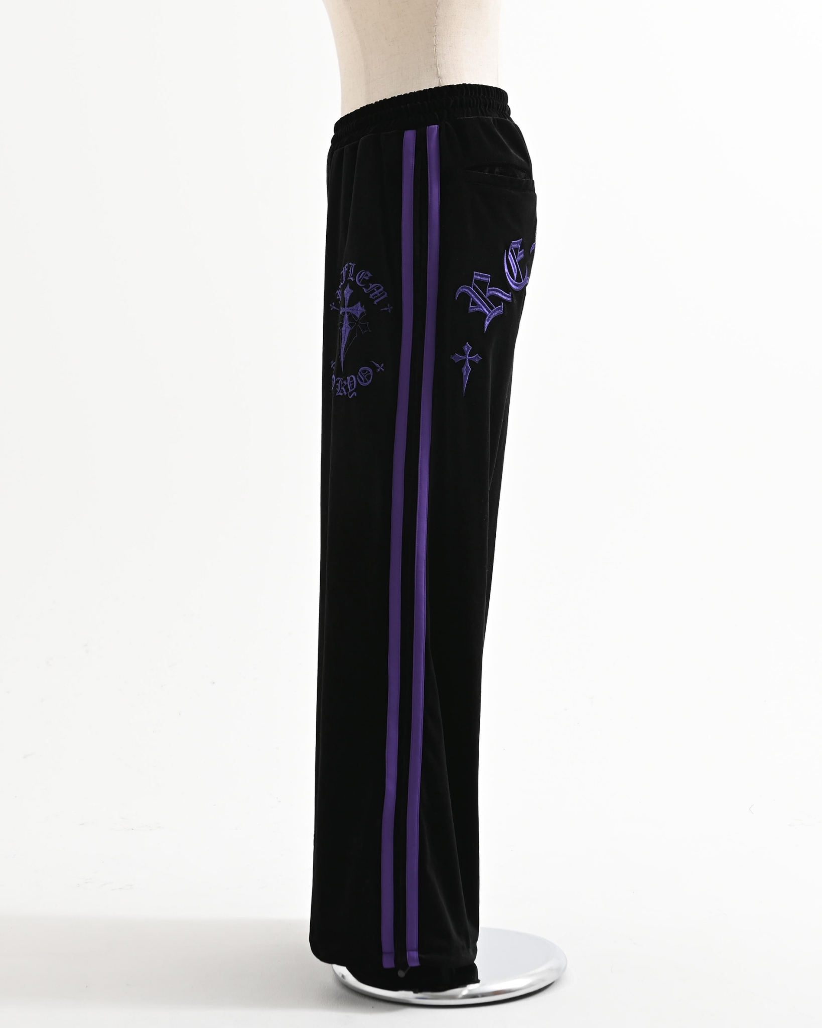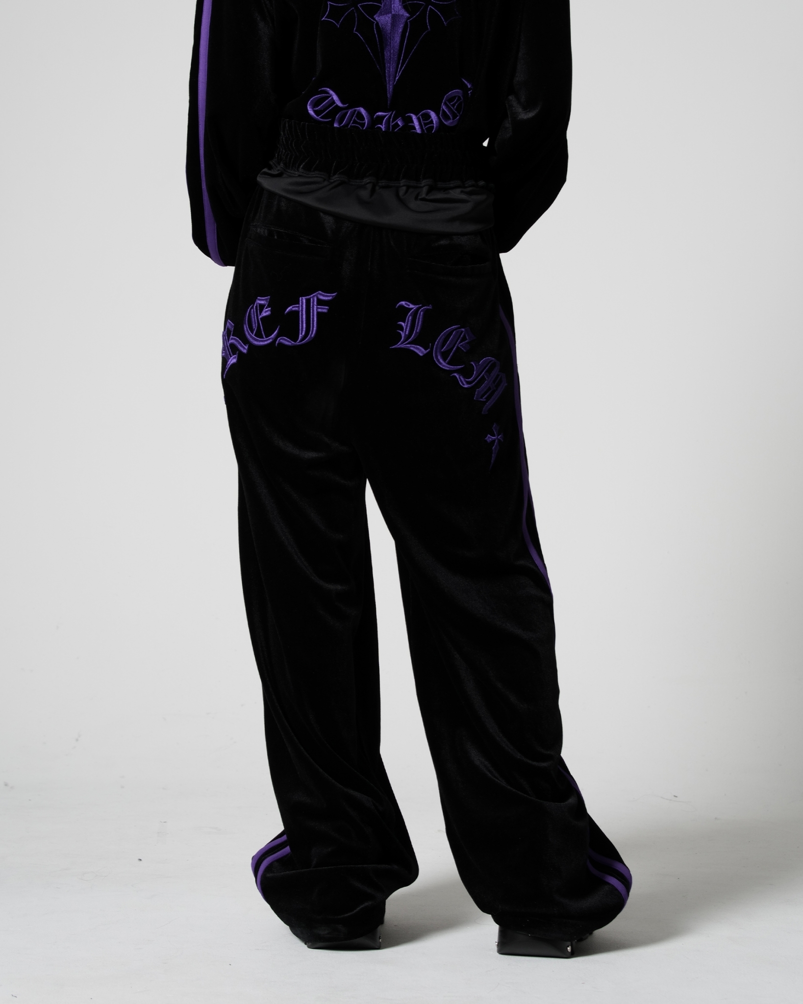 Velour pants featuring cross motifs and Old English logo embroidery.
