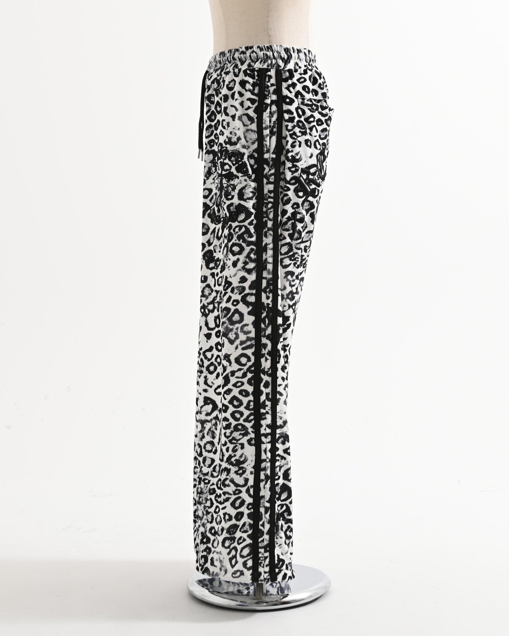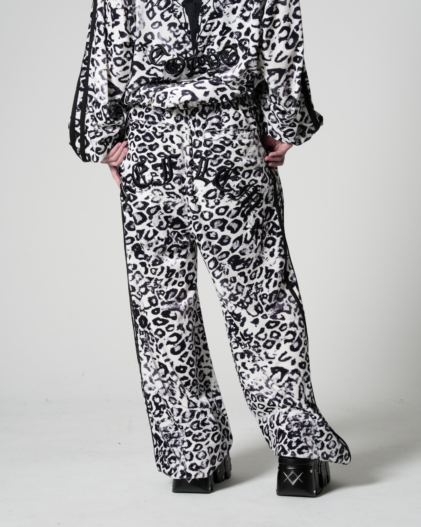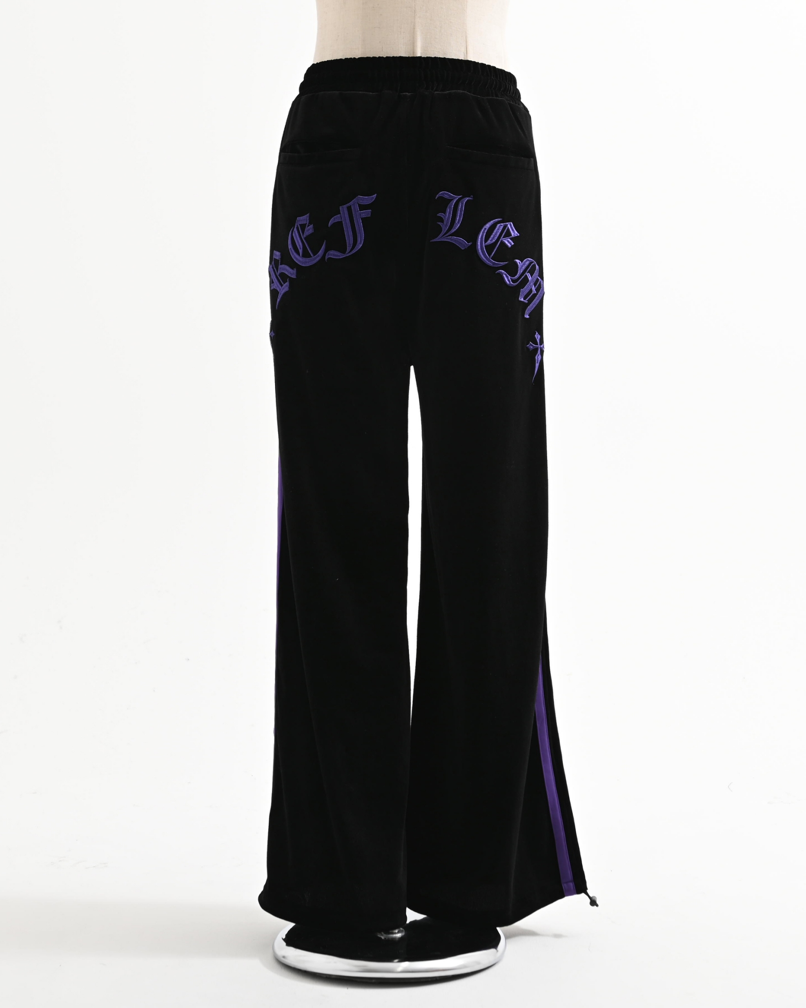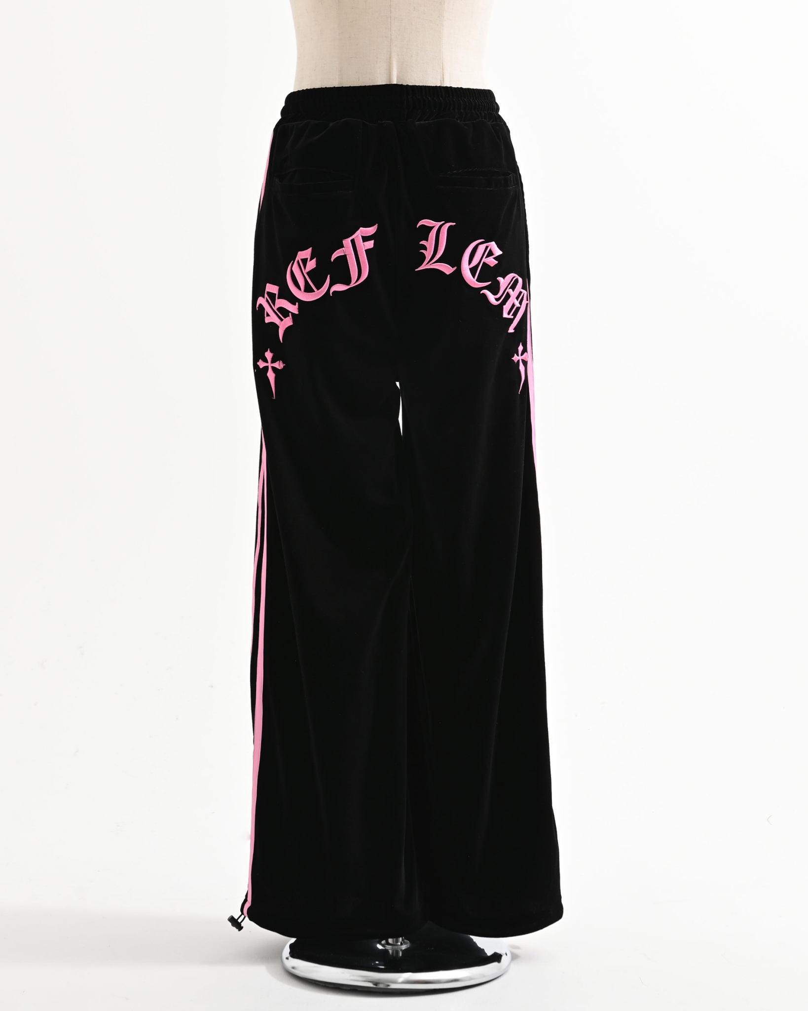 Velour pants featuring cross motifs and Old English logo embroidery.