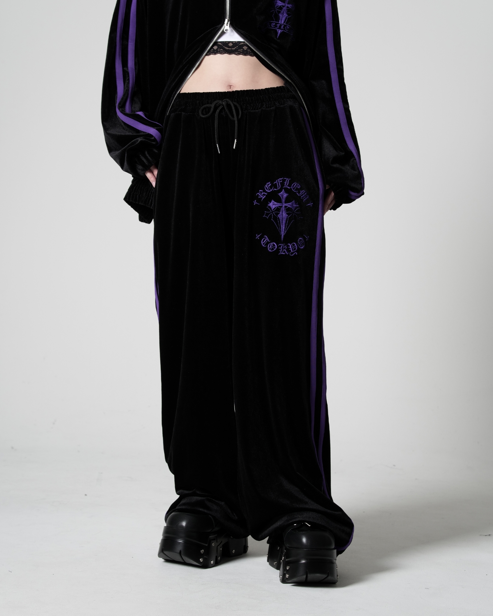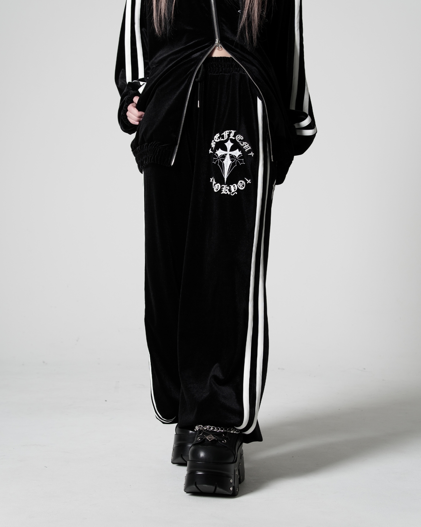 ※ Made from the same material as the Cross Embroidery Velour Track Jacket (Item No.: RF26-H03). Recommended for coordinated set-up styling.