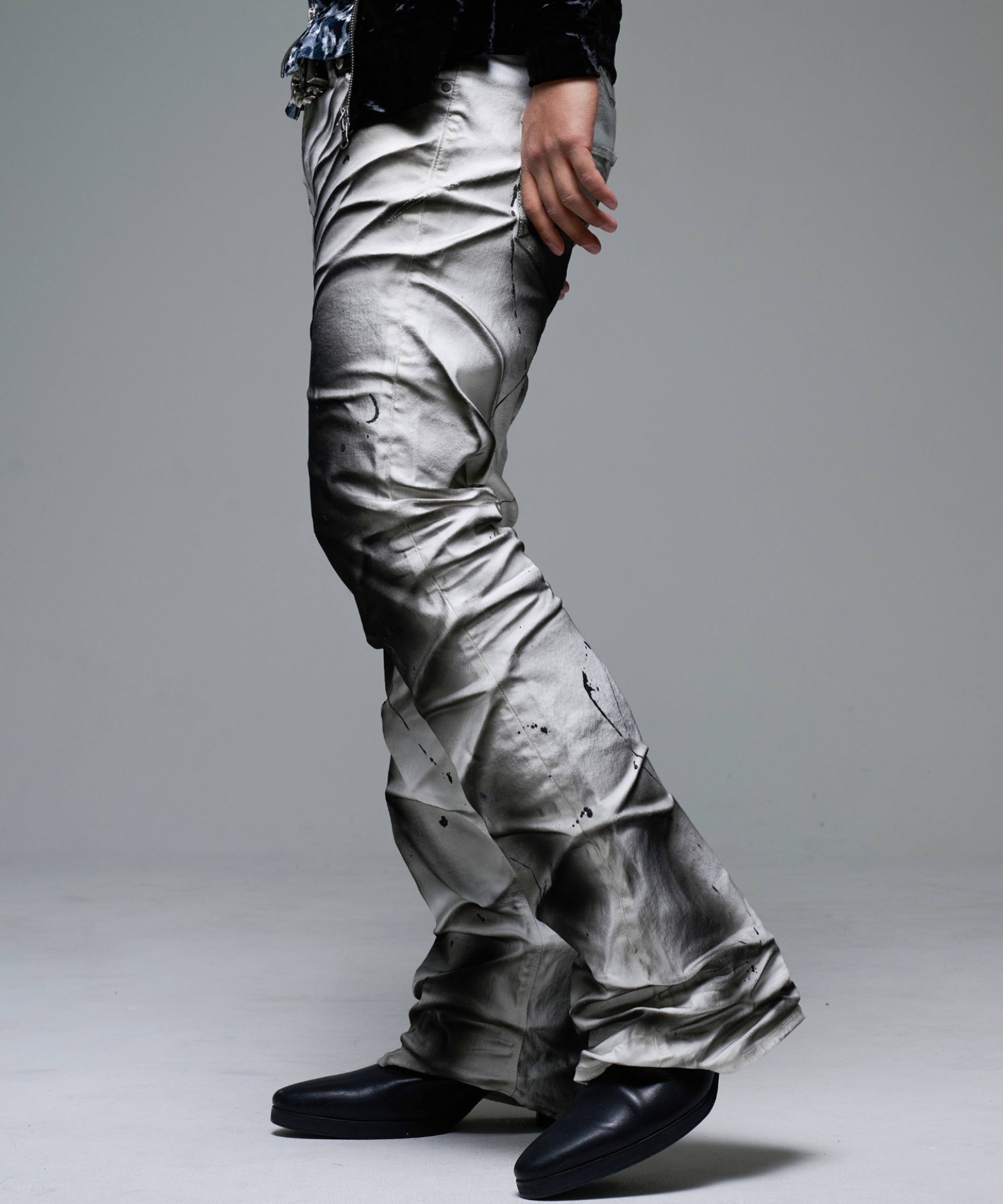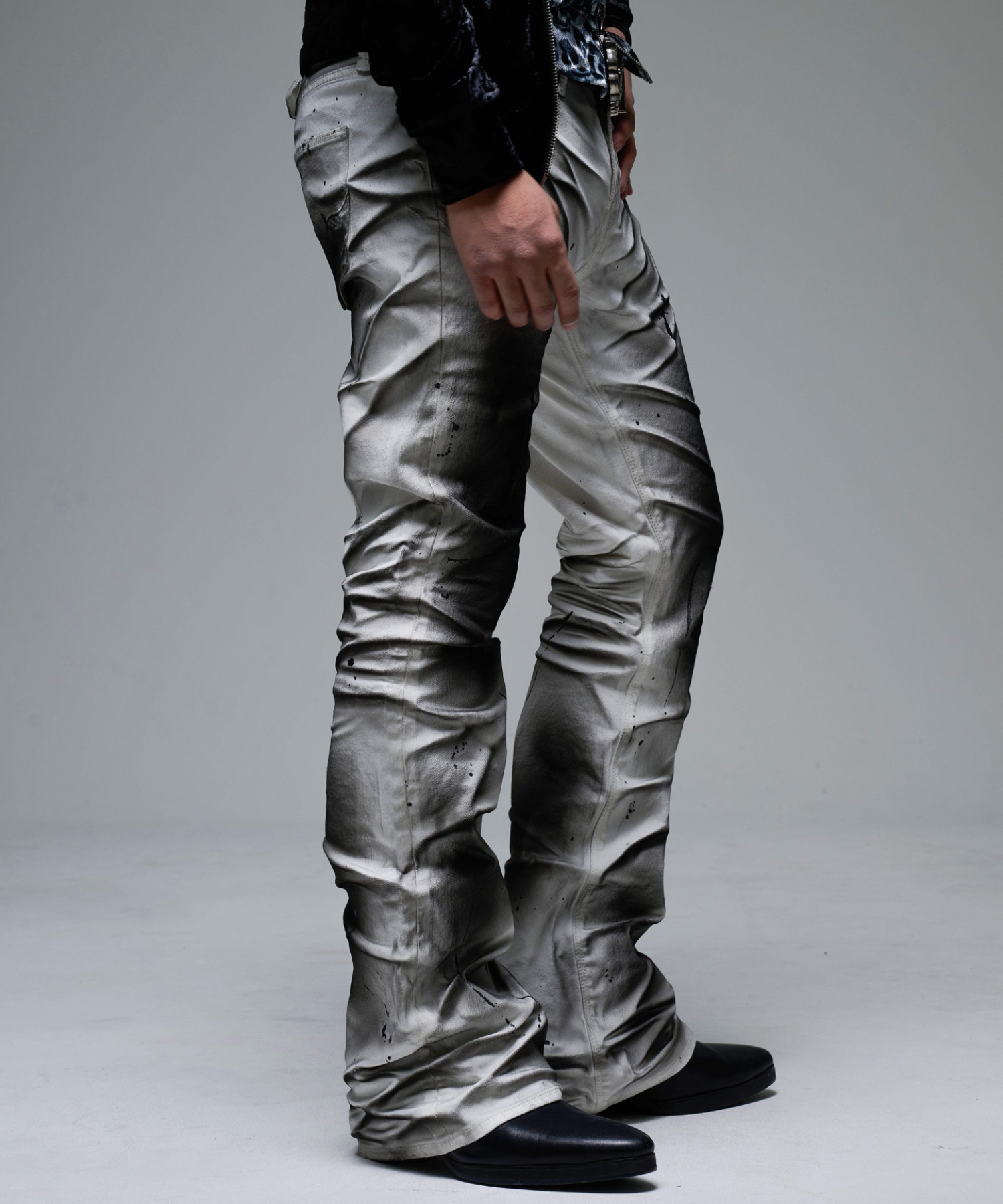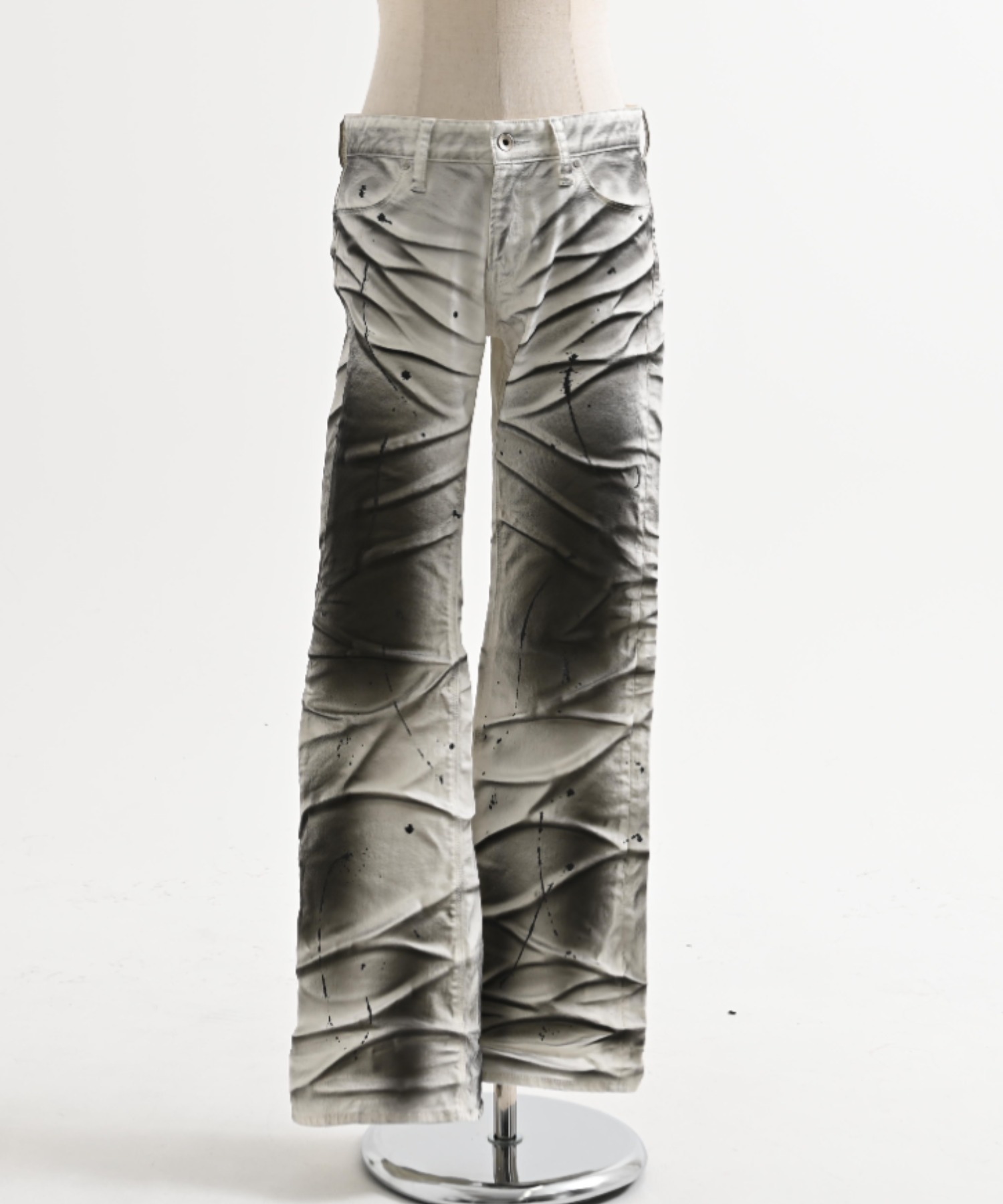 A pair of pants featuring a unique dimensional look created through two types of pigment coating and wrinkle processing.