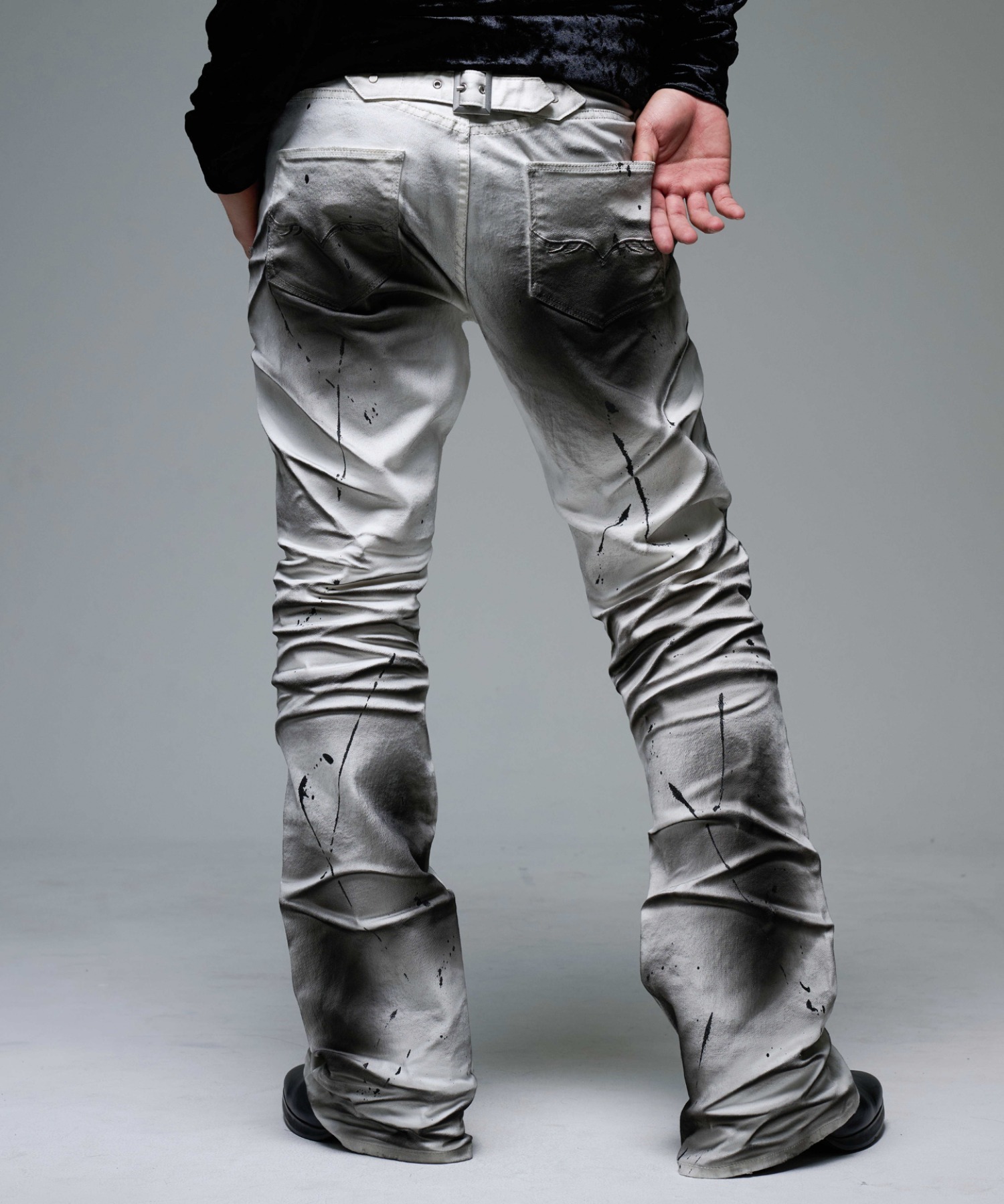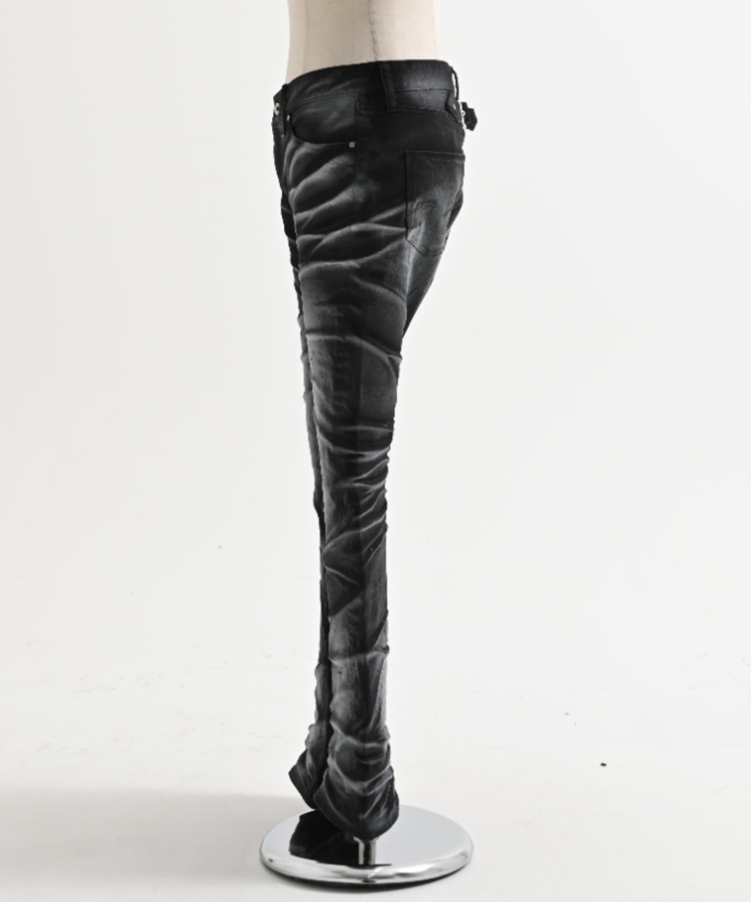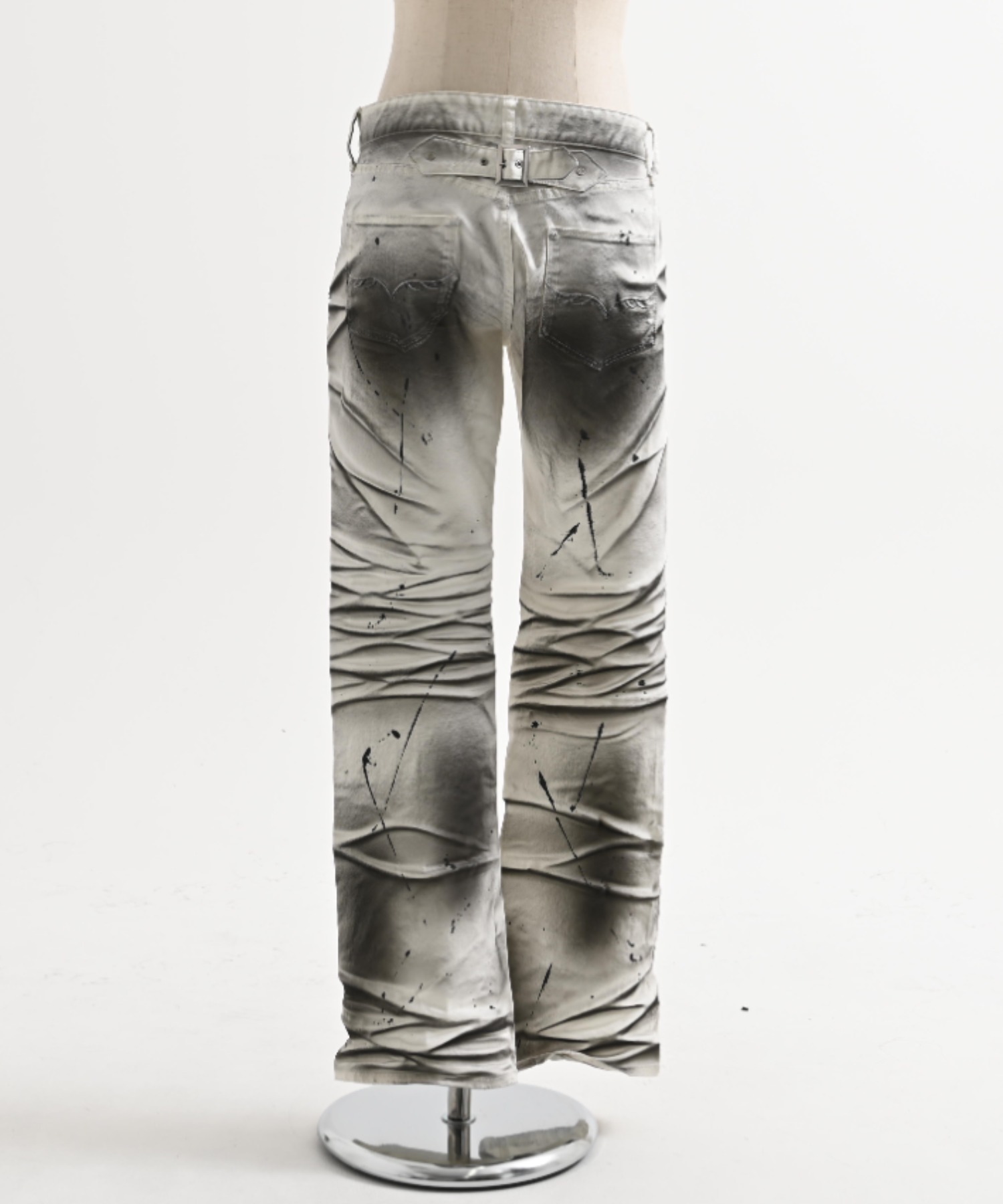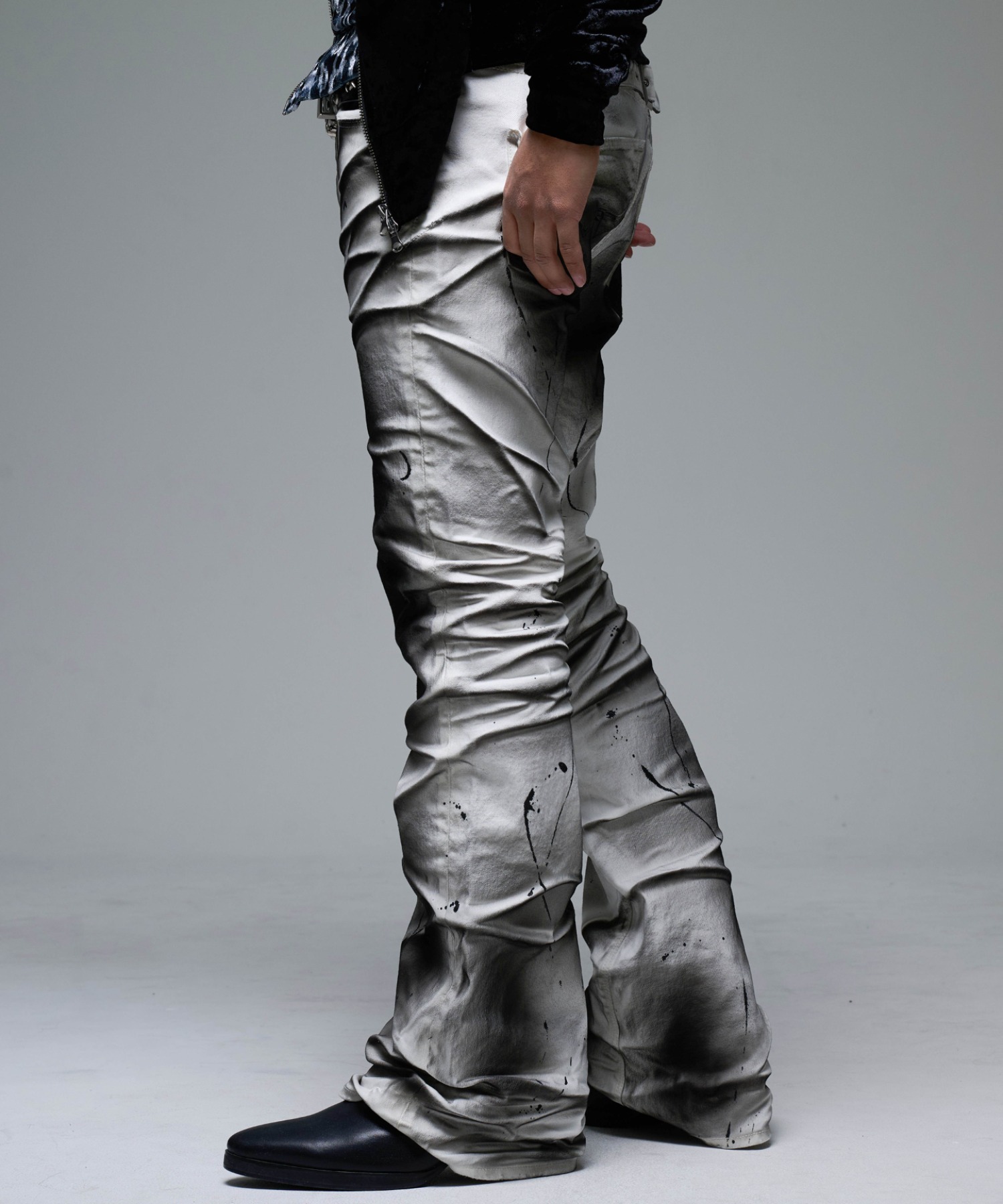 A pair of pants featuring a unique dimensional look created through two types of pigment coating and wrinkle processing.