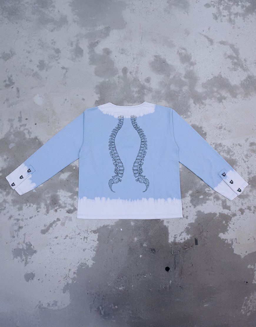 Each garment is hand-bleached, creating blurred gradients and organic irregularities that evoke a sense of decay and individuality.