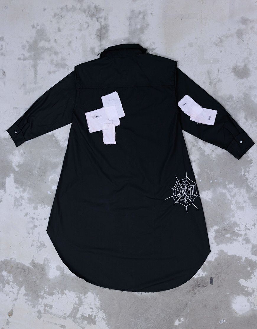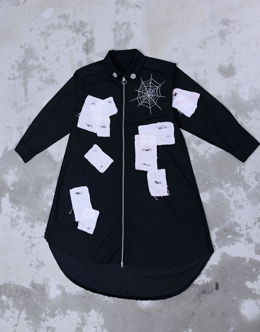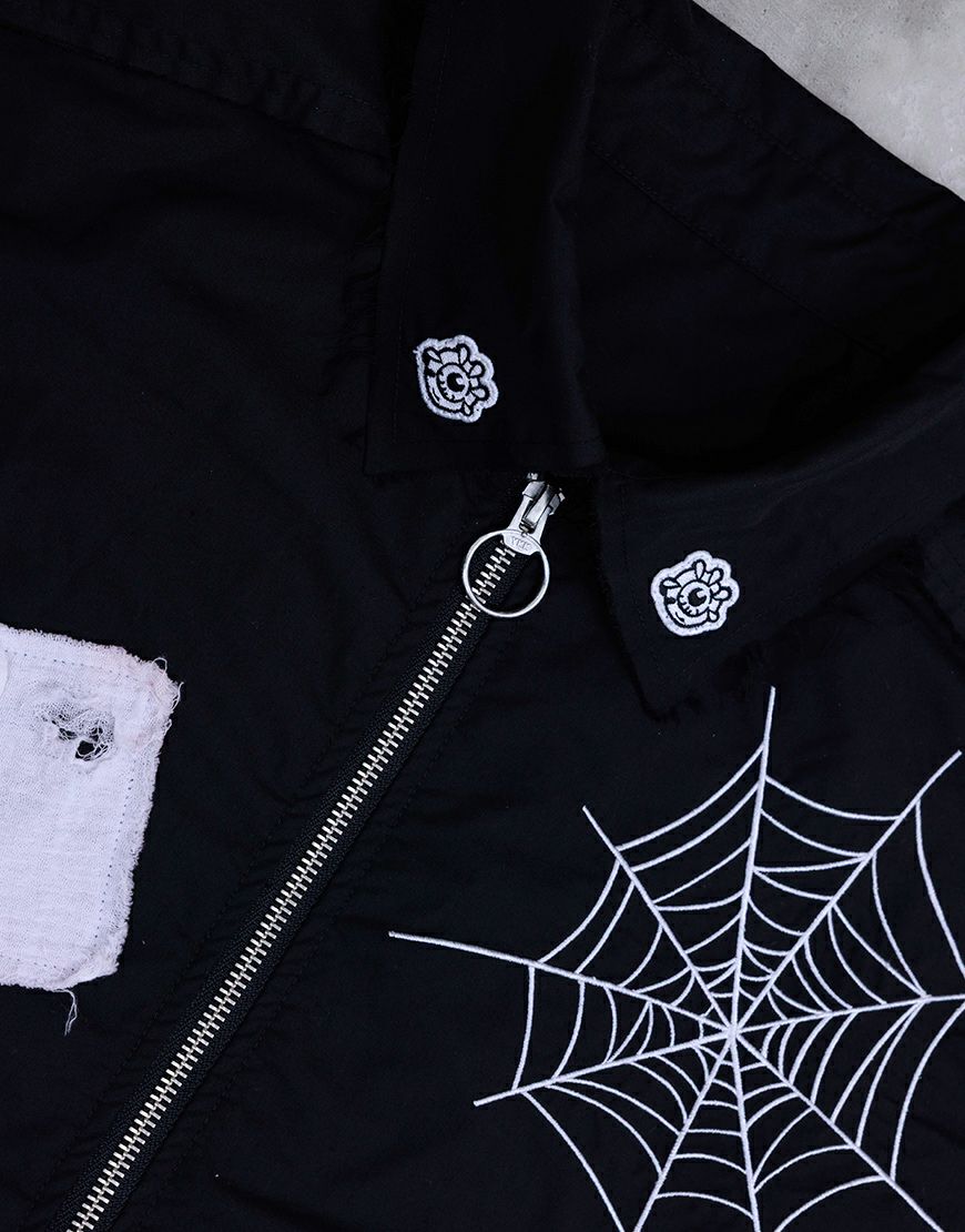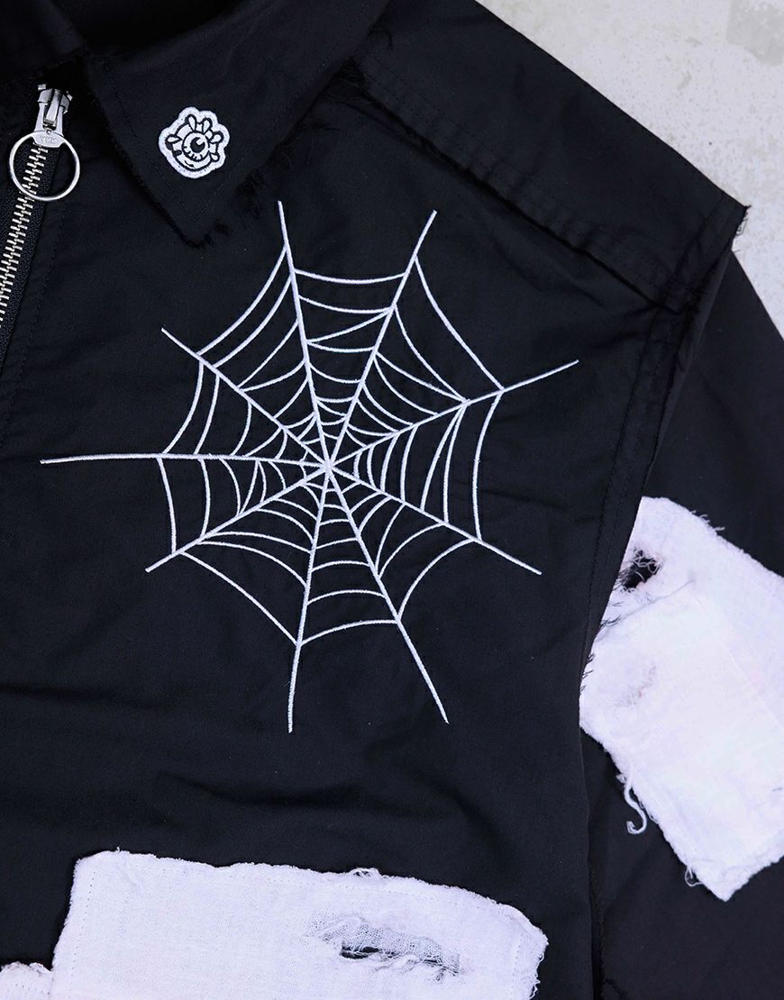 Embroidered spiderweb artwork extends across the front and back, symbolizing the entanglement of life and time.