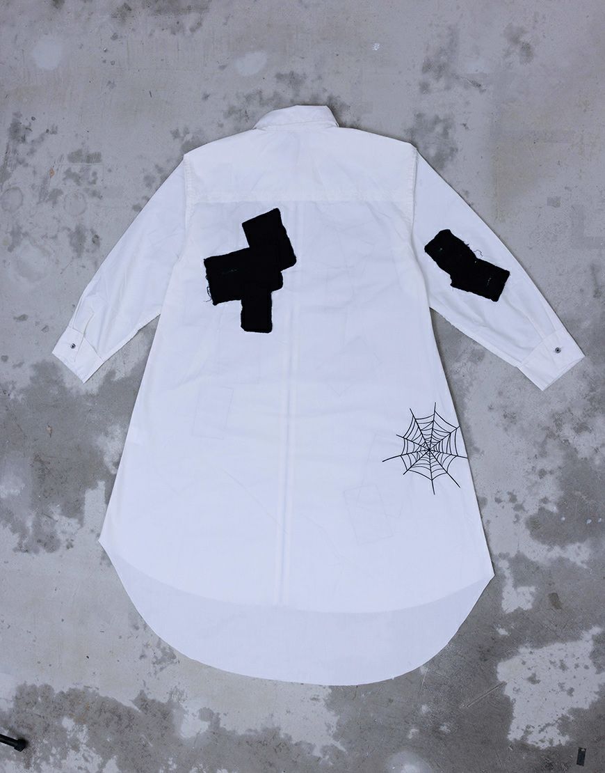 Distressed gauze fabric is randomly applied to a stark, industrial shirt base.