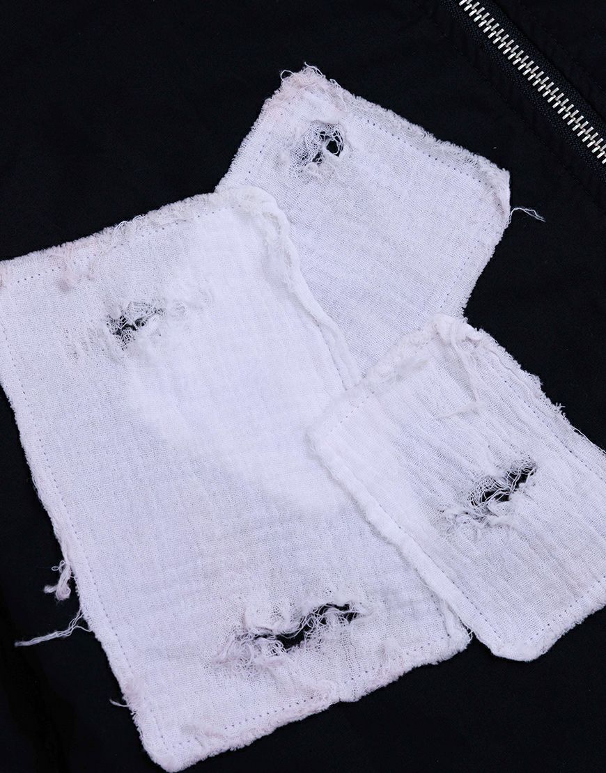 Raw-cut edges and roughly stitched gauze patches blur the line between craft and collapse, creating an art piece that exists in the tension between creation and decay.