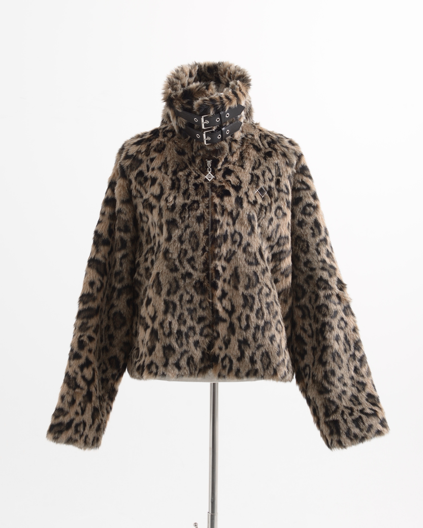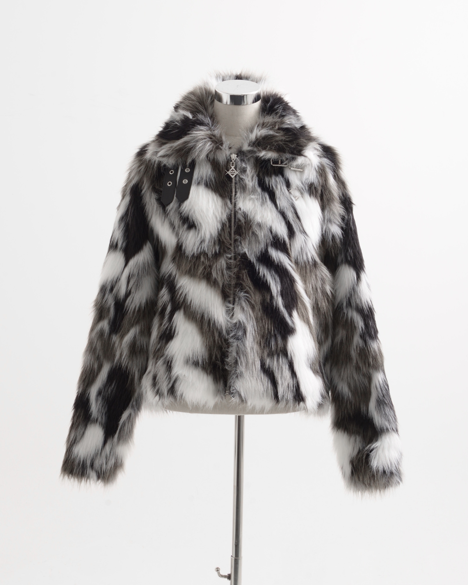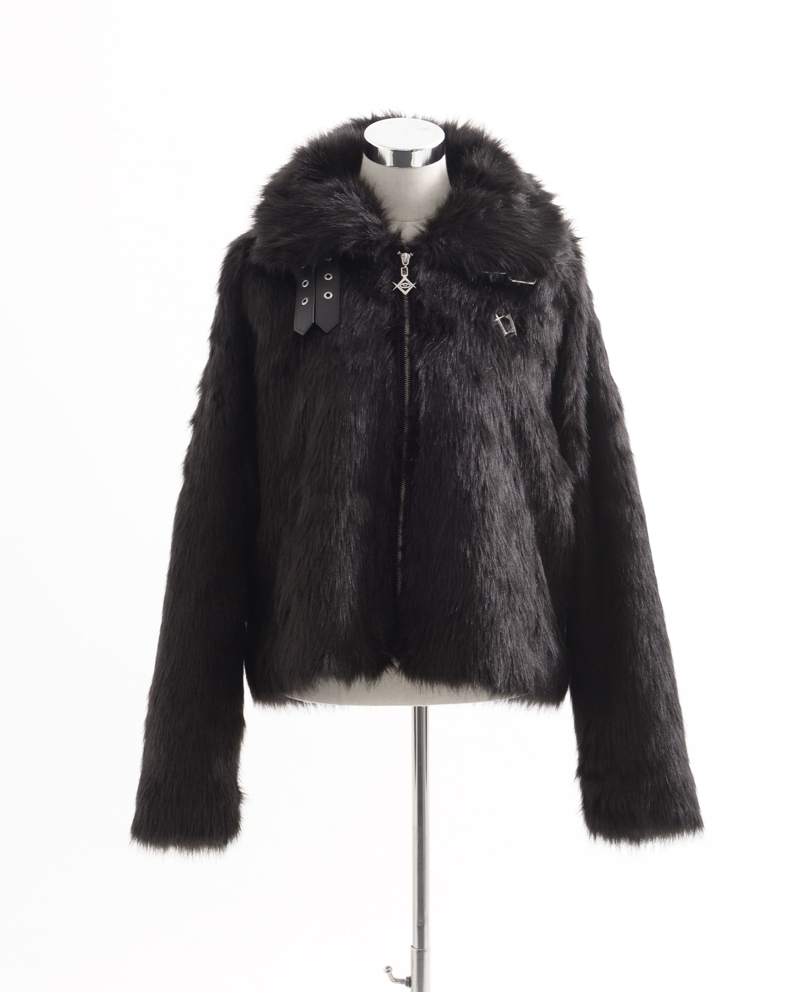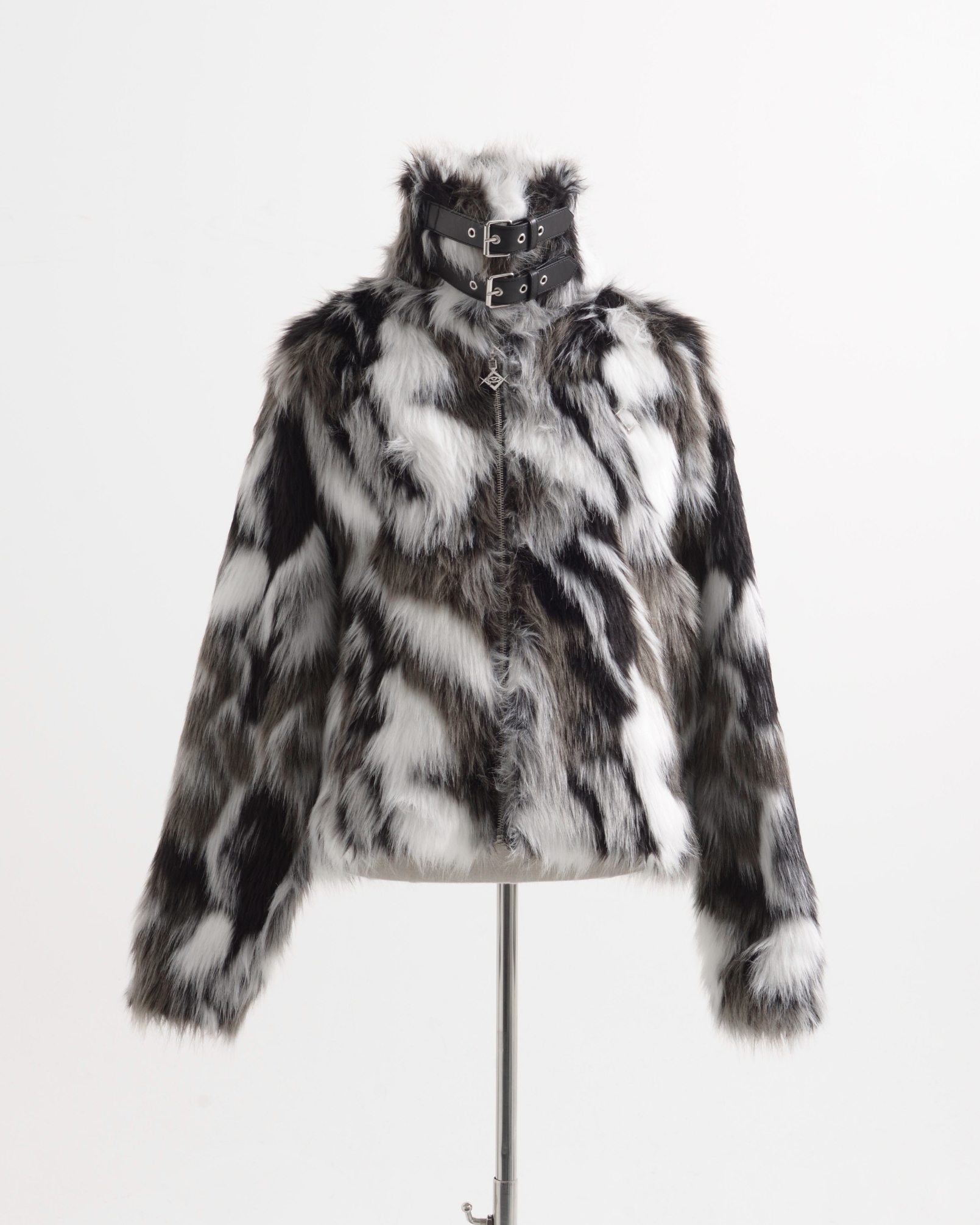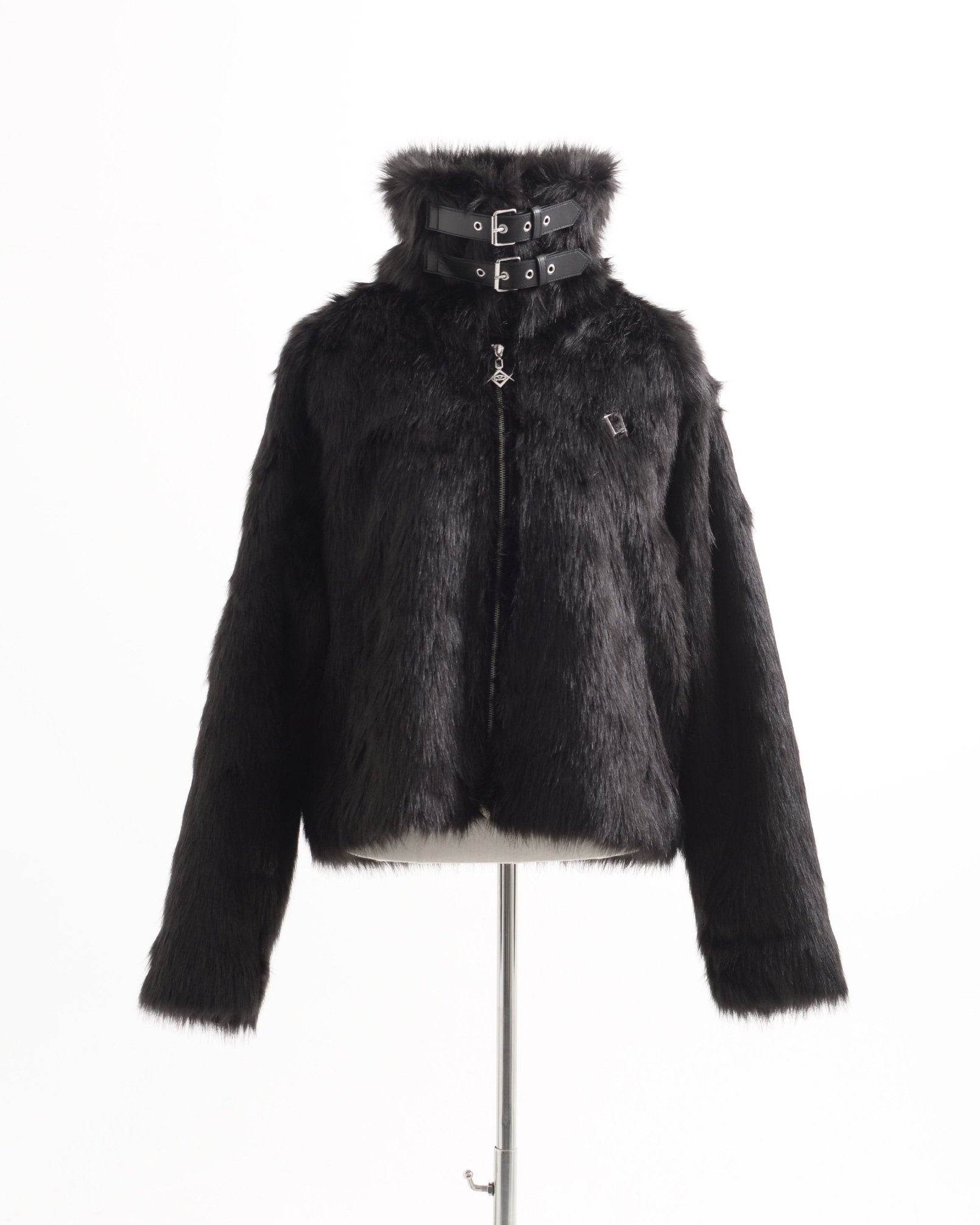 A short-length jacket made with long-pile faux fur, featuring collar belts.