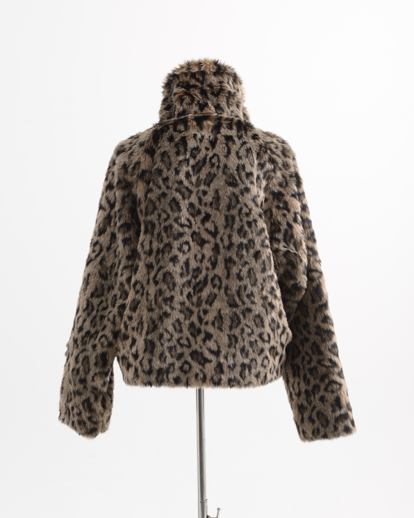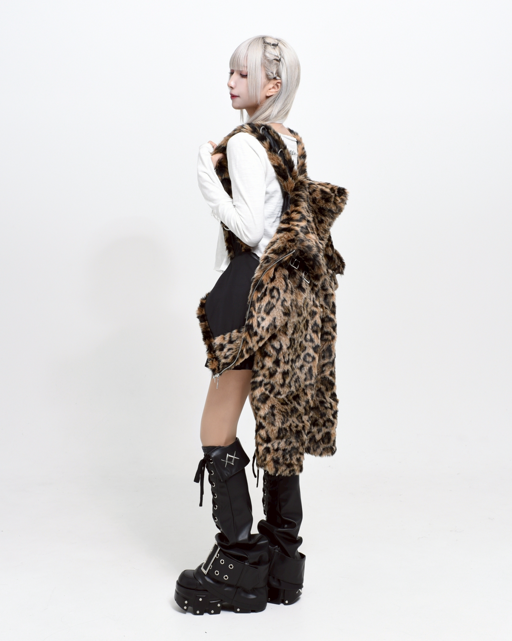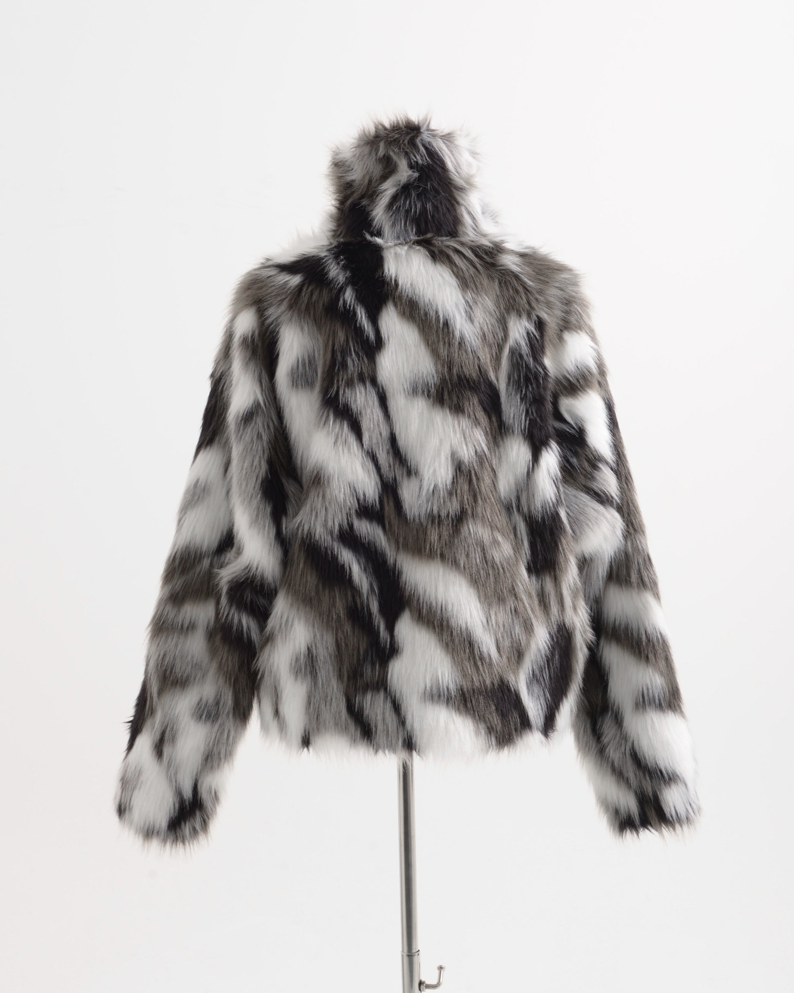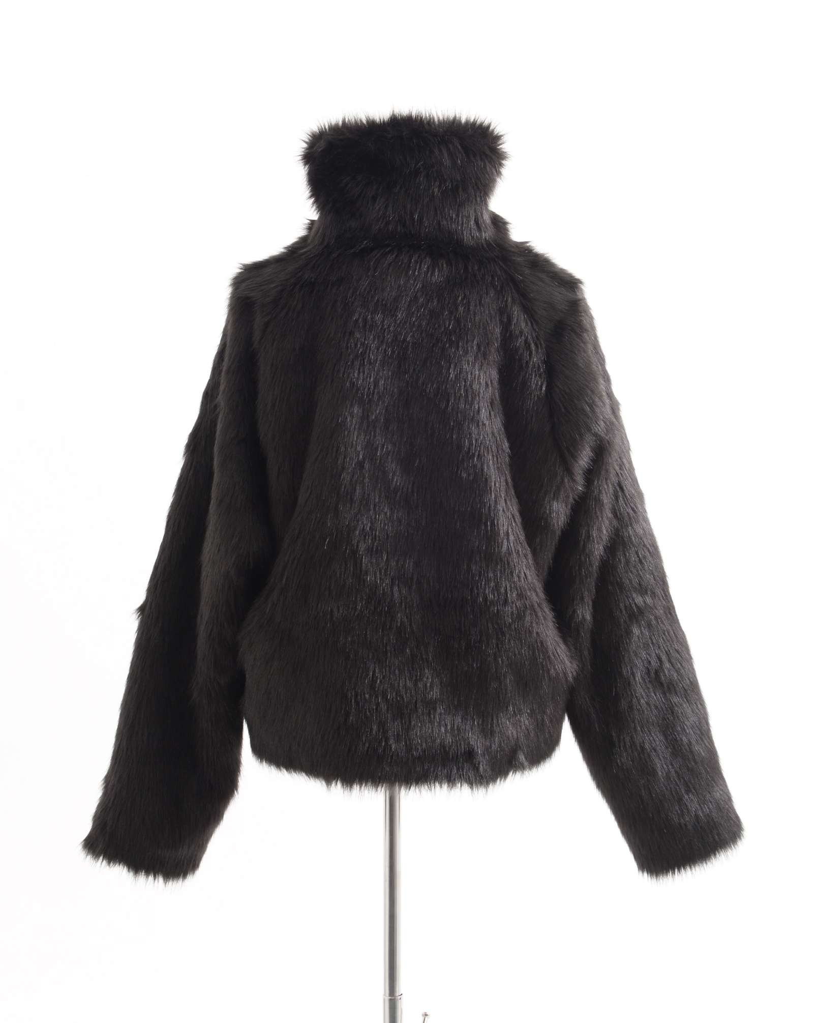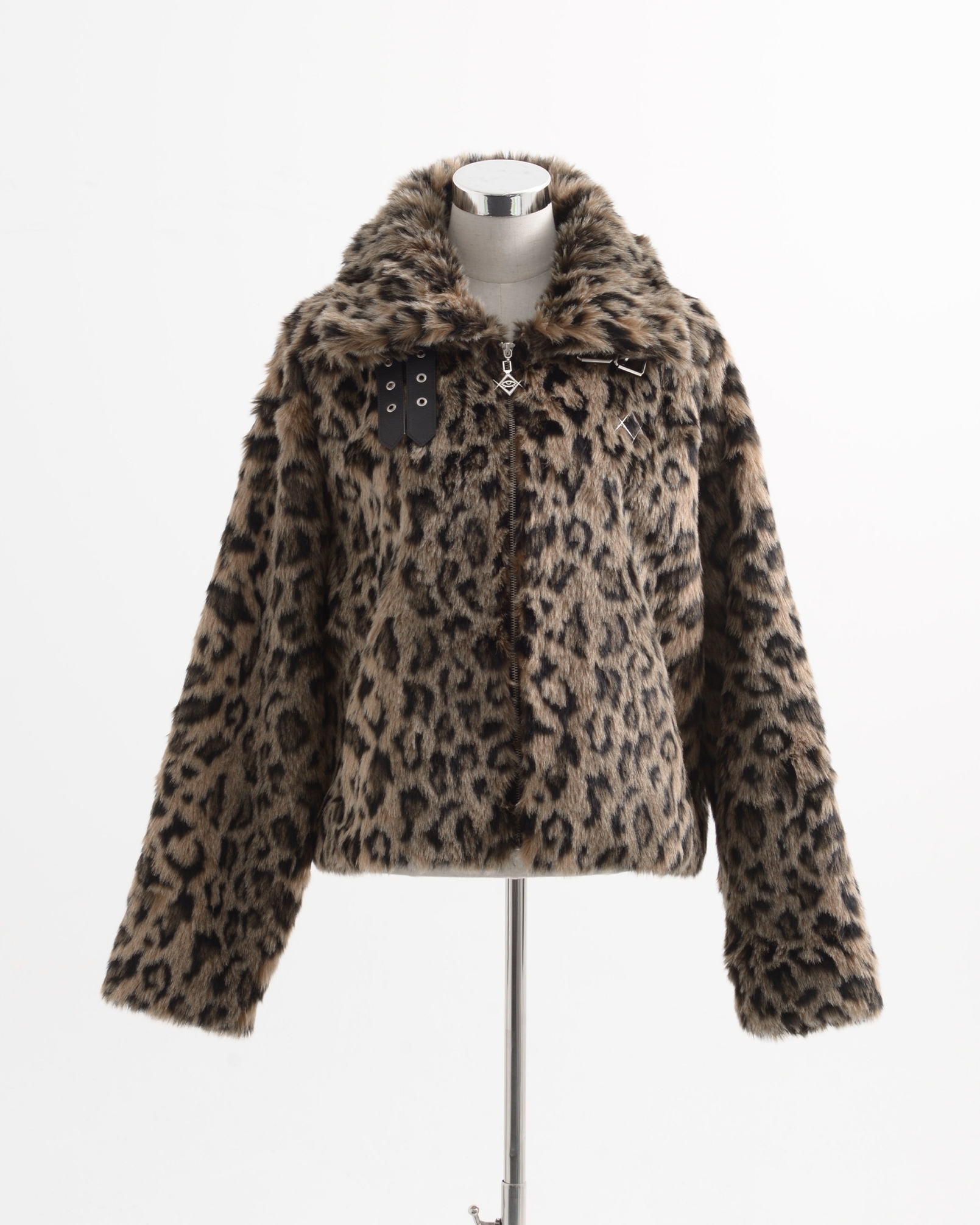 A short-length jacket made with long-pile faux fur, featuring collar belts.