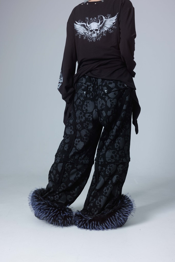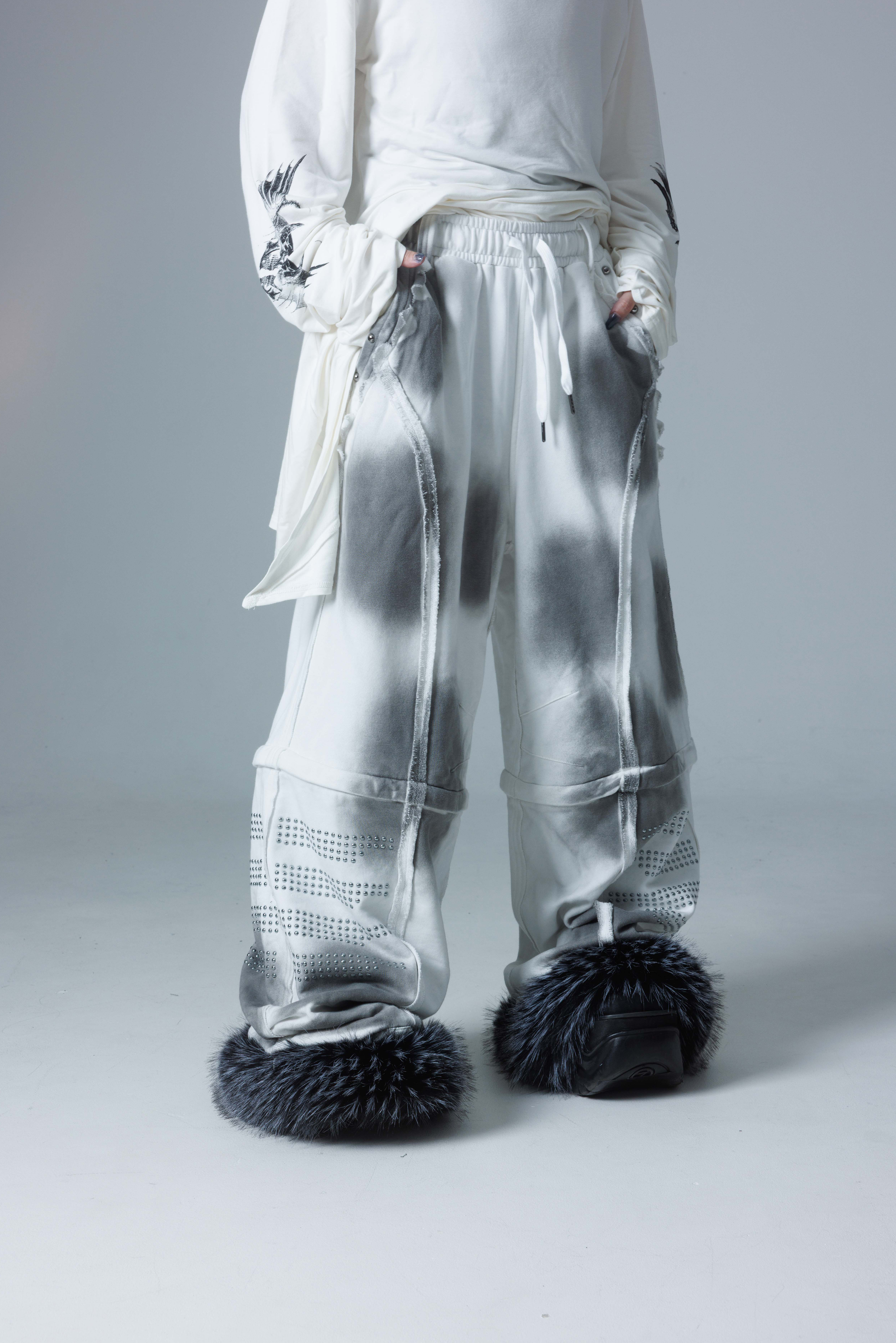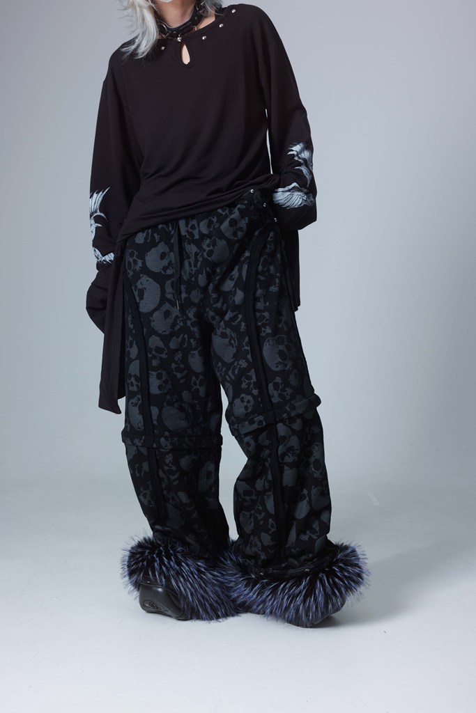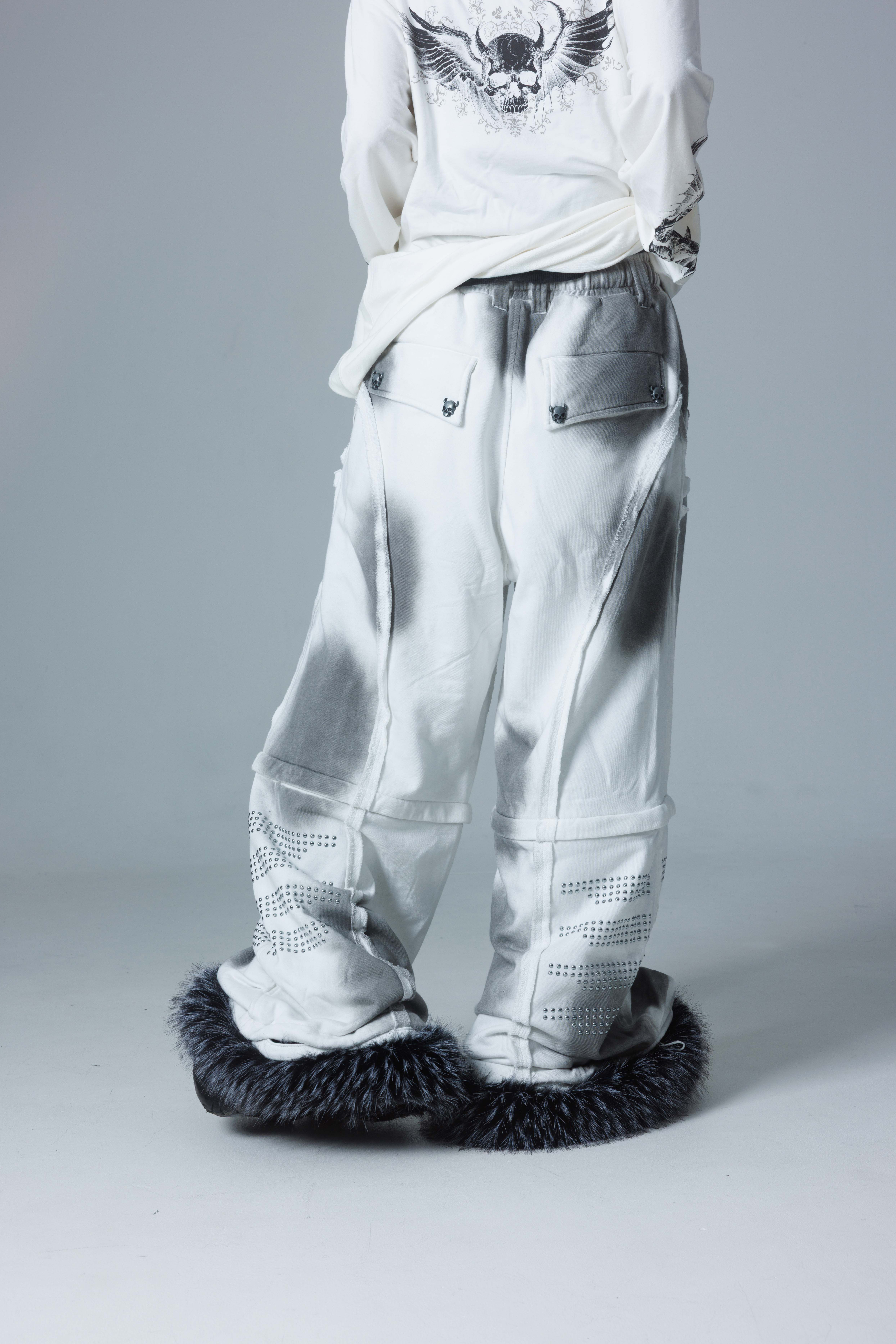 Gamchu’s decayed × zero-gravity world, made manifest — a standout pair of fur-trimmed convertible wide leg sweat cargo pants arrives with overwhelming presence.