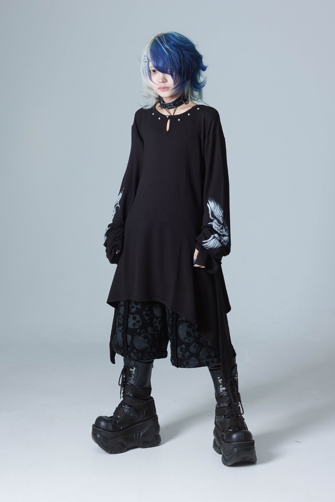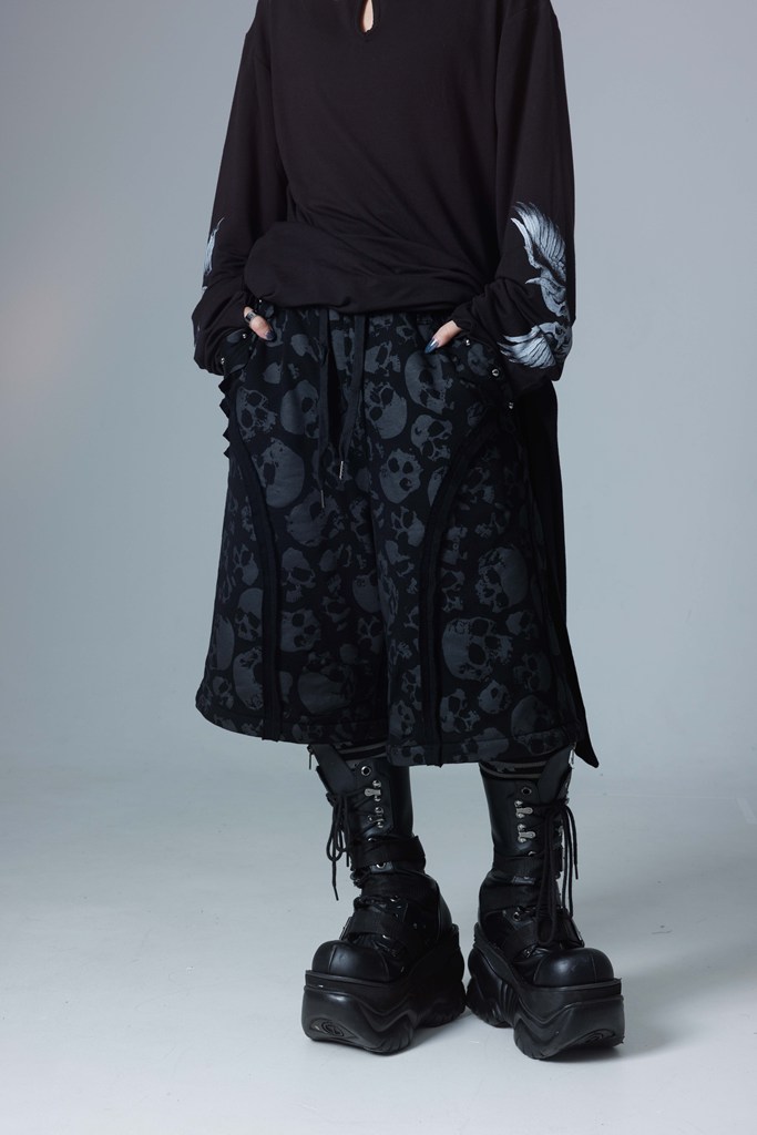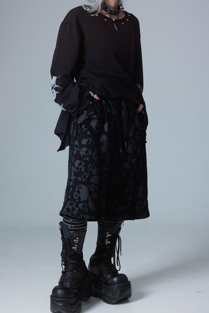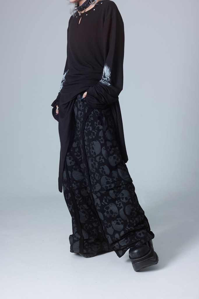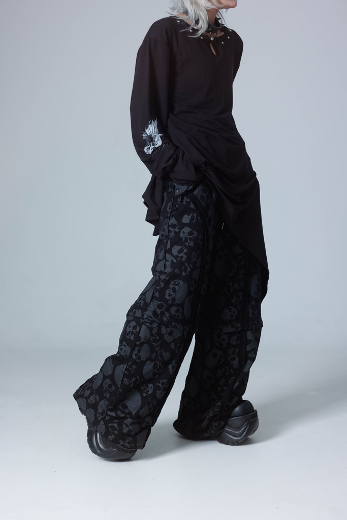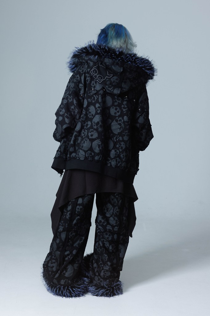 The back features a flap pocket with sculptural skull buttons, distilling Gamchu’s dark-youth energy into every detail.
