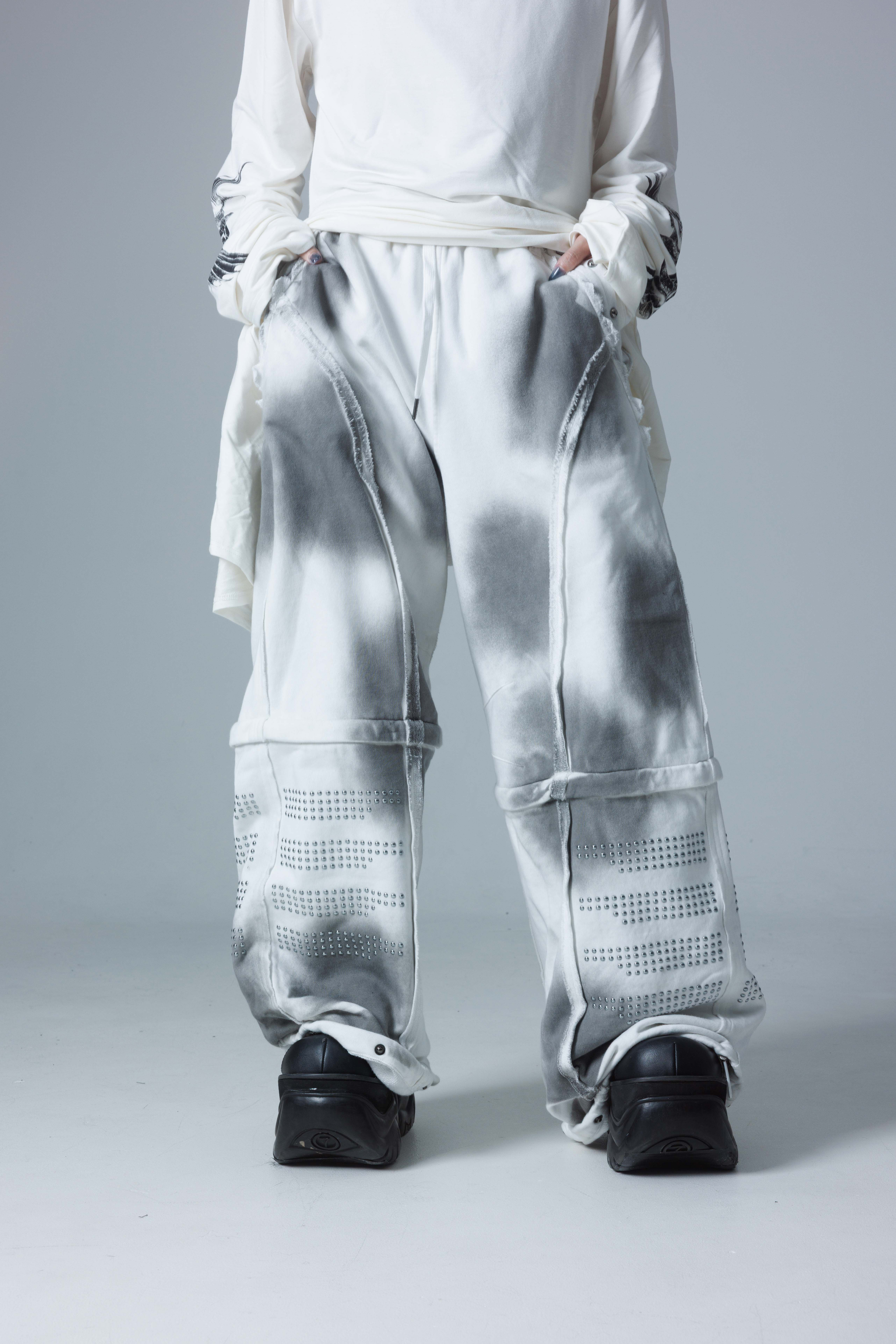 Design continuity lives in the rib-bone stud motif (using the same round metal studs as the “Fog-Shrouded Zone Fur-Trimmed Hoodie”) wrapping from side seams through the inseam, making it a set-friendly hero piece.