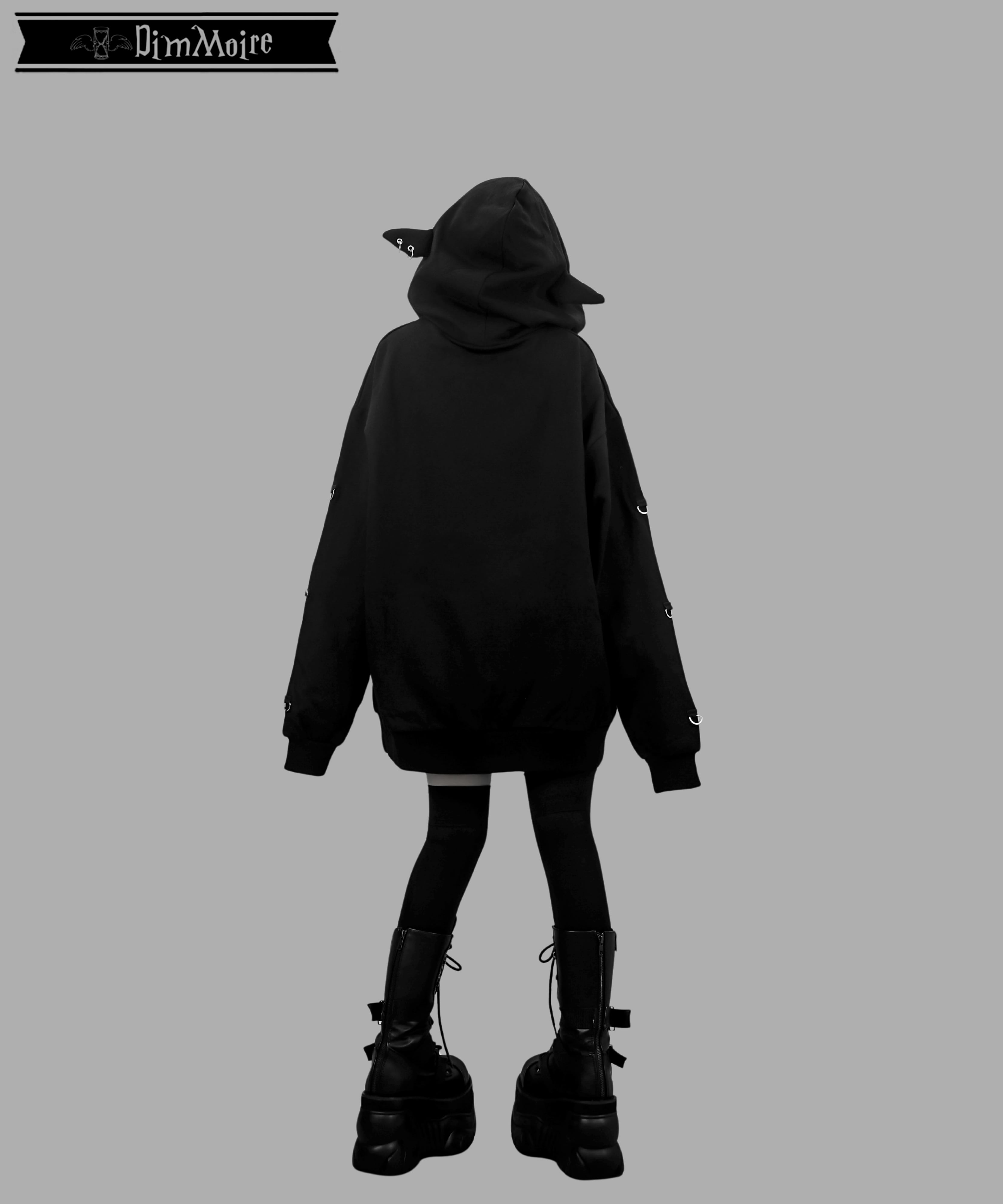 The hood is decorated with devil ears and London studs, giving the back view an adorably eerie silhouette.