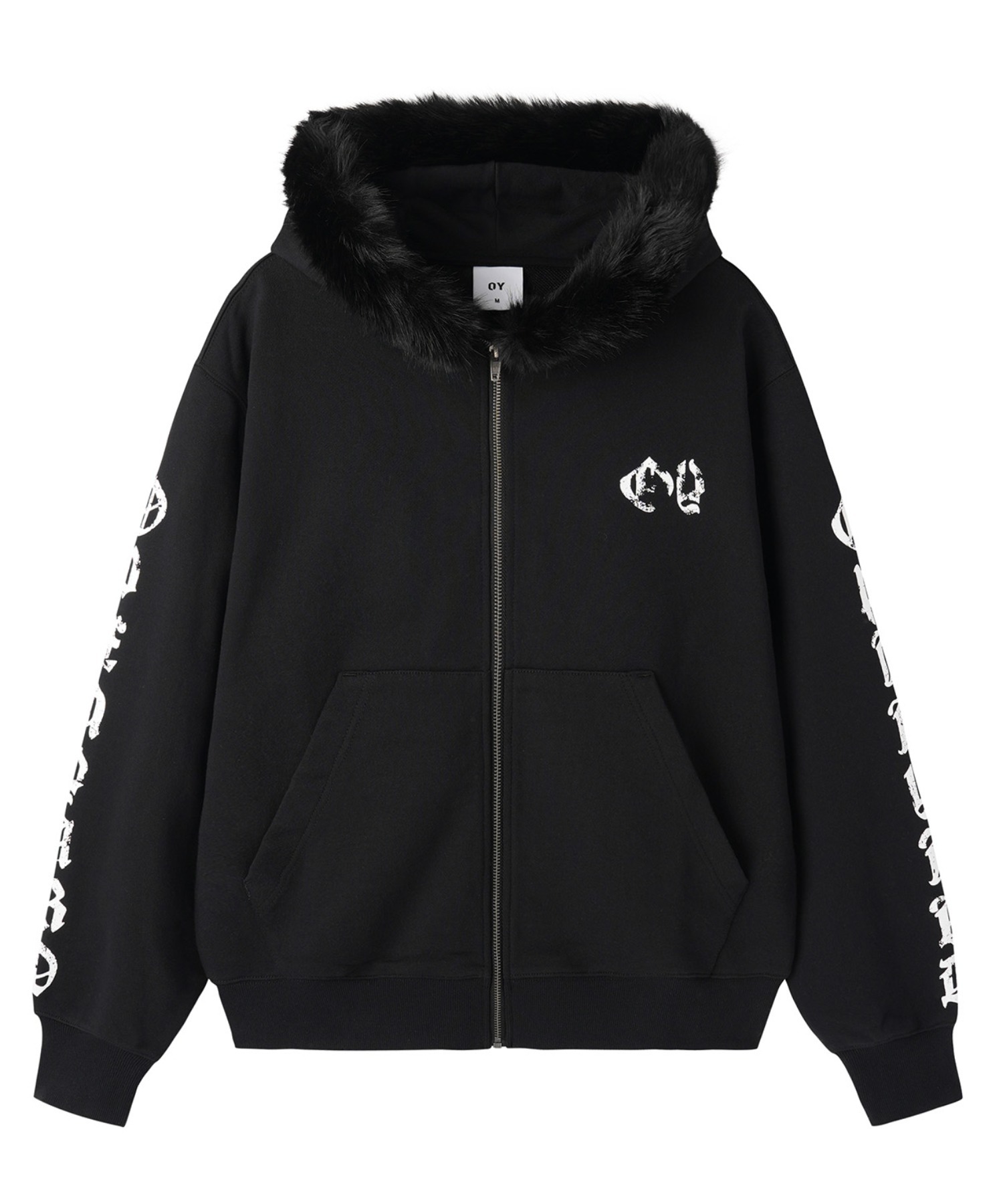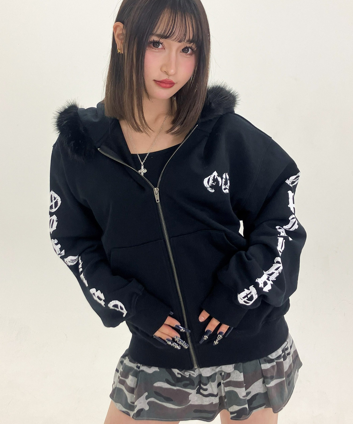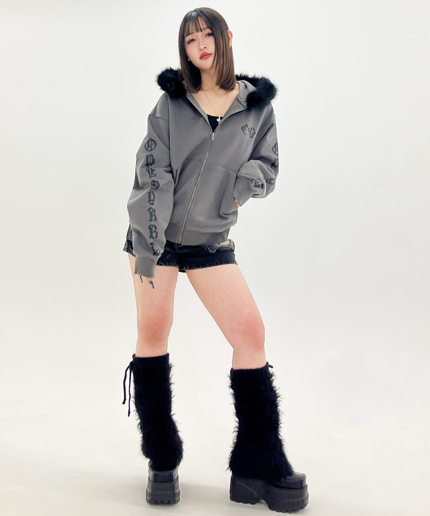 The hood is trimmed with high-quality faux fur, wrapping warmly around the neck while adding an edgy accent to the overall look.