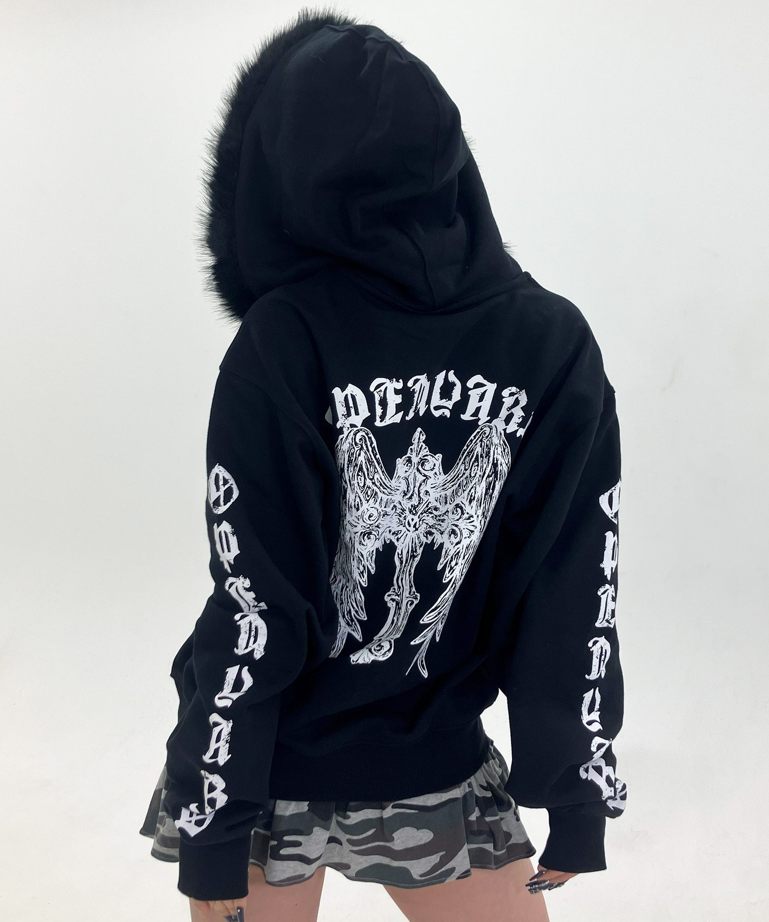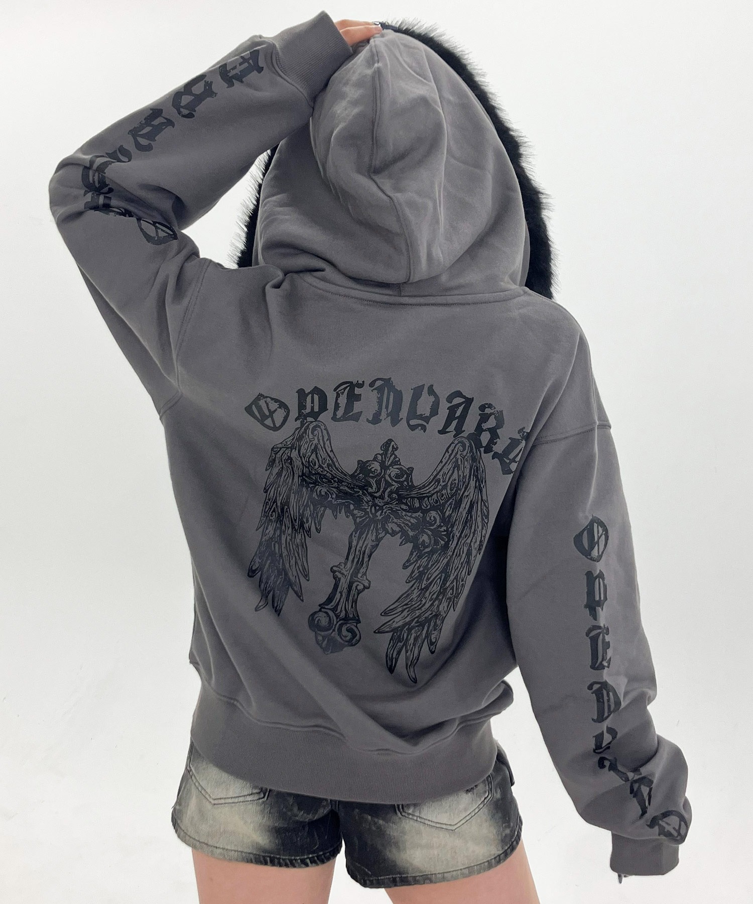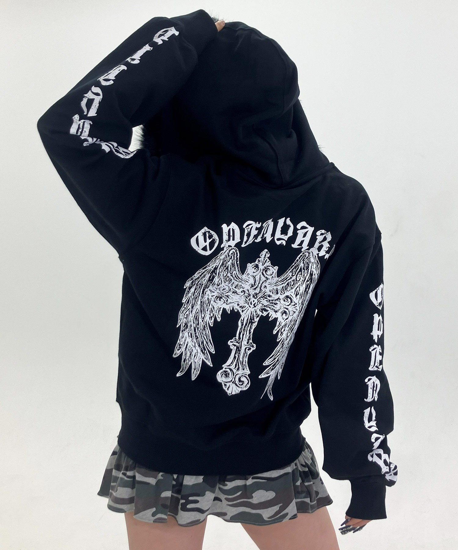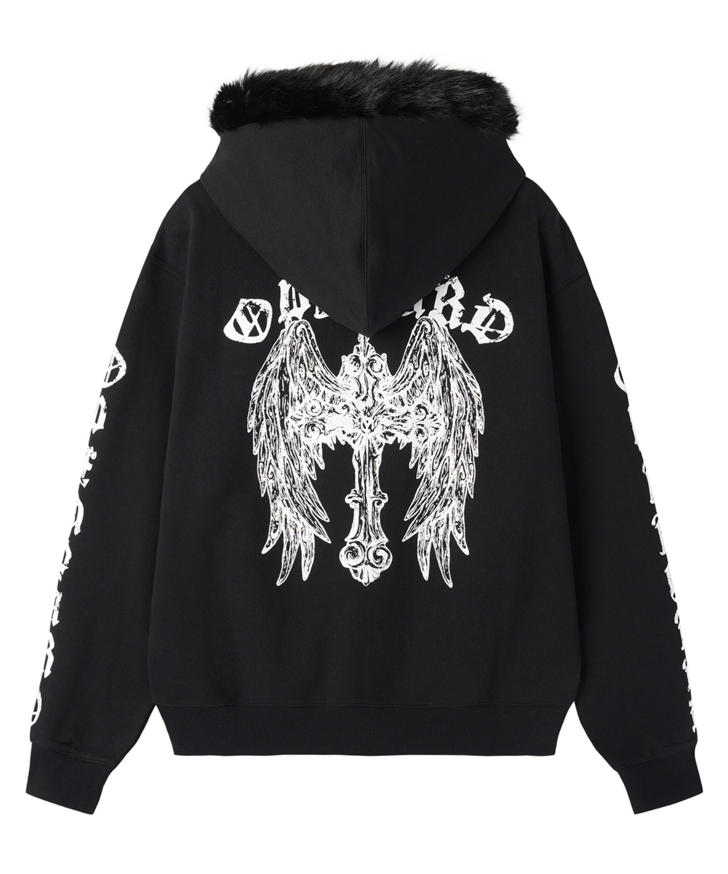 A zip-up hoodie featuring a bold gothic cross-wing graphic printed across the back.