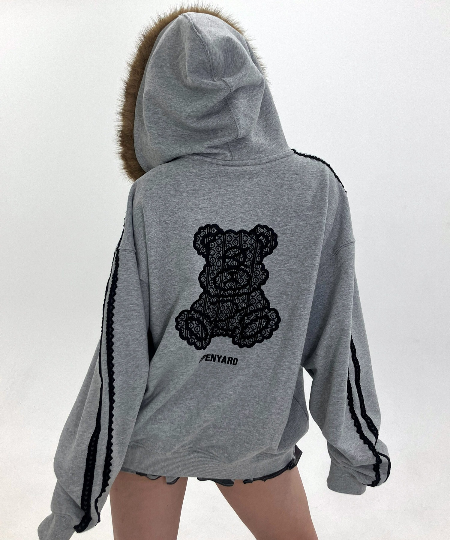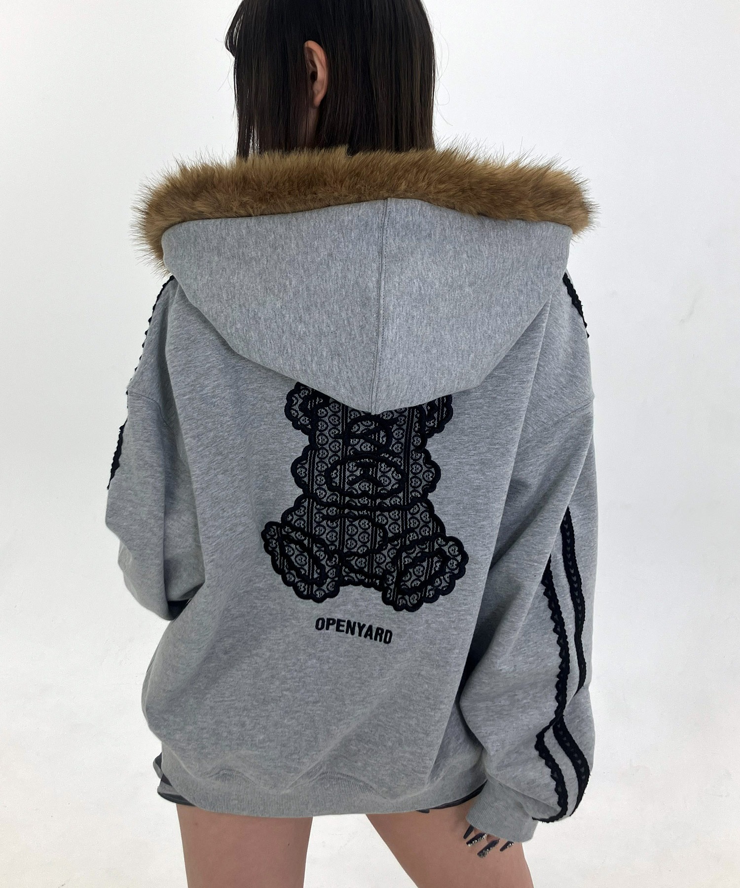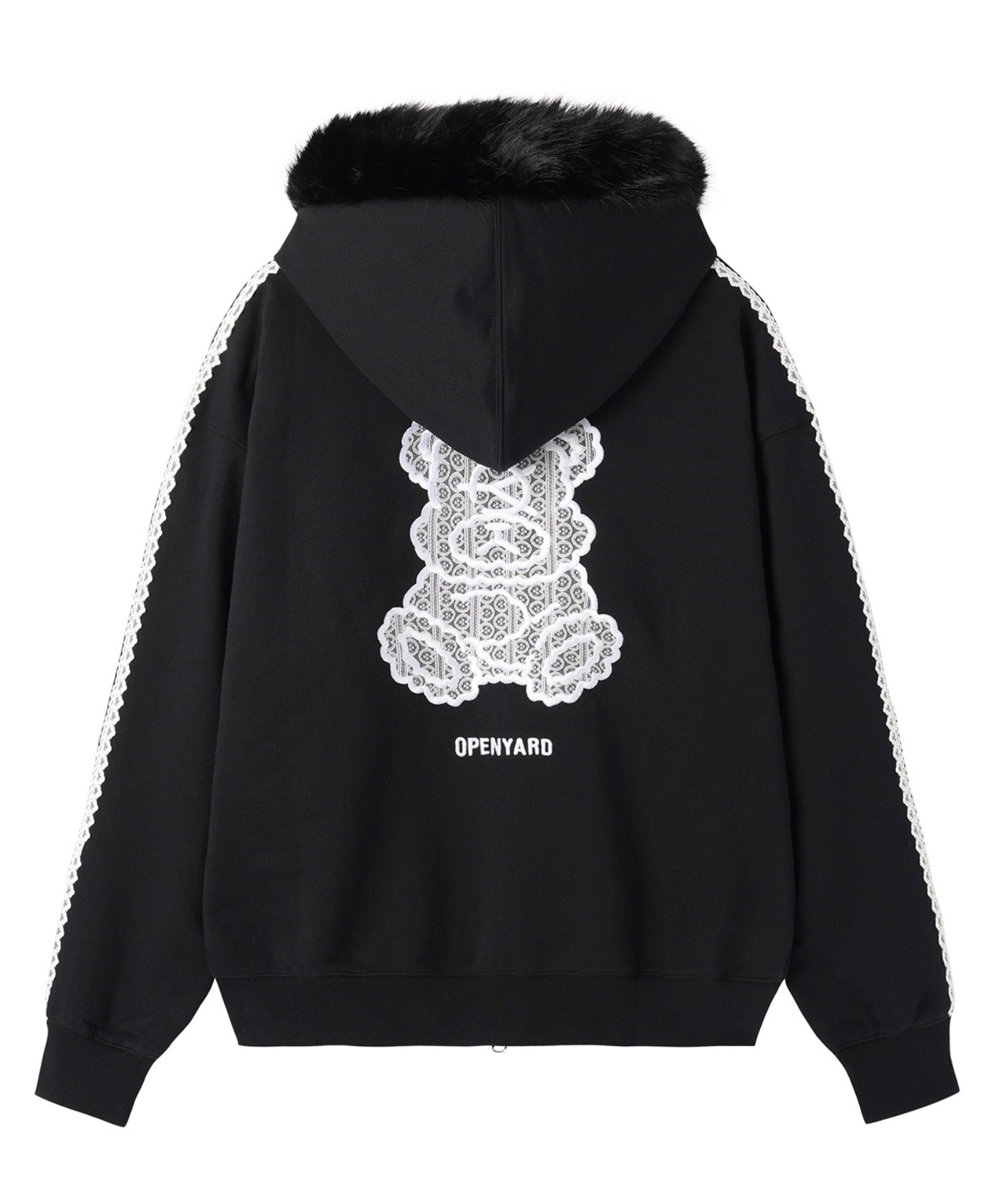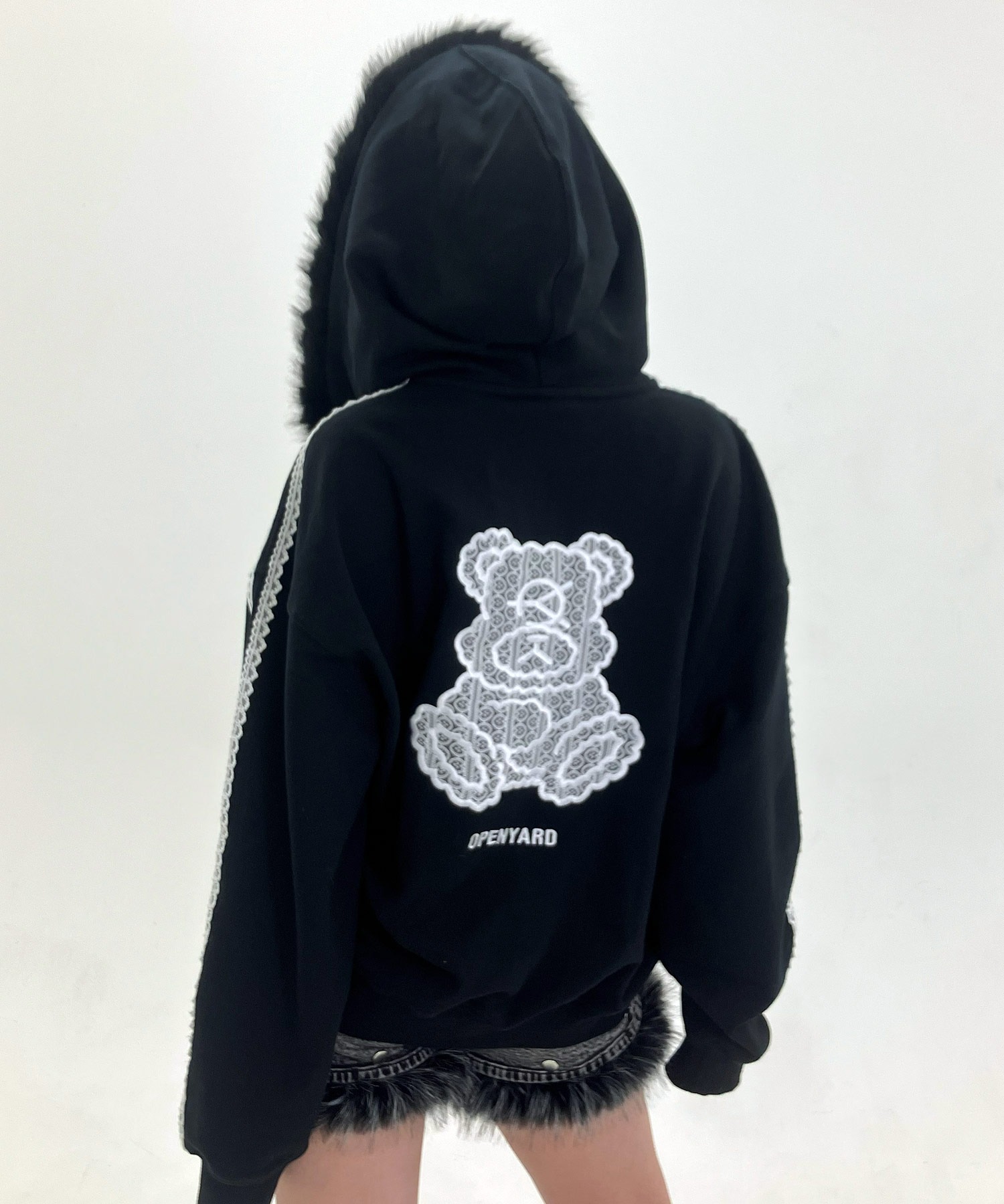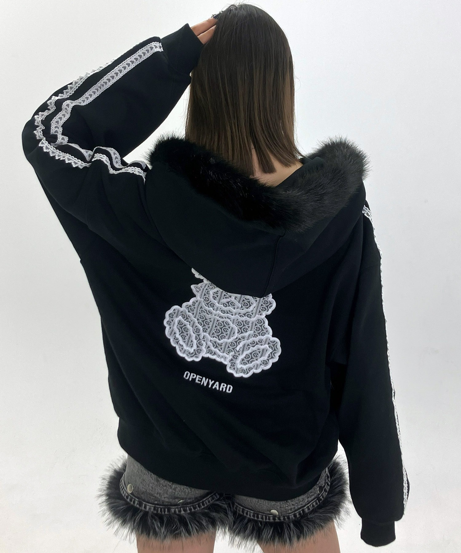 A fur-trim hoodie featuring an eye-catching back design boldly incorporating classic lace motifs.