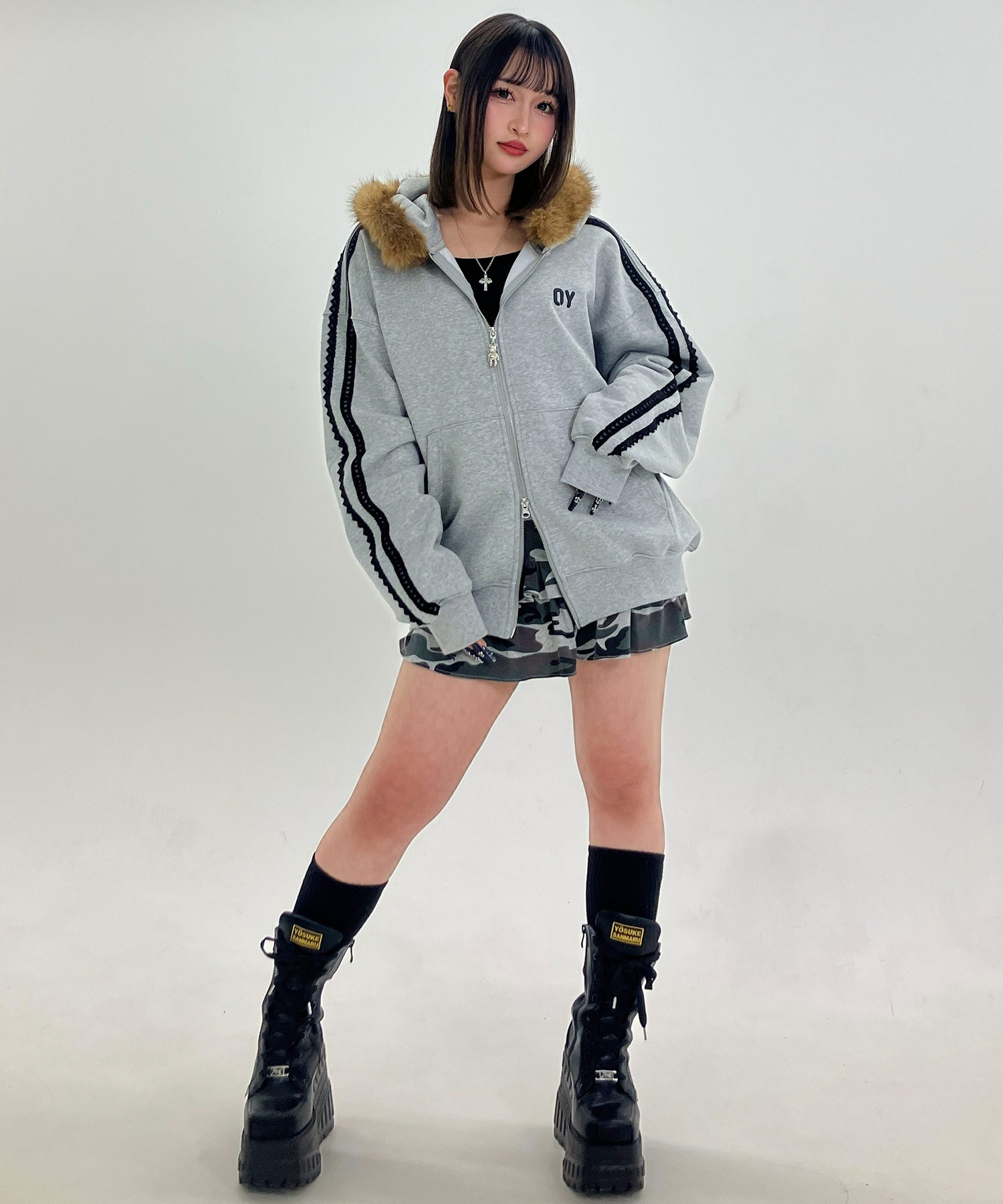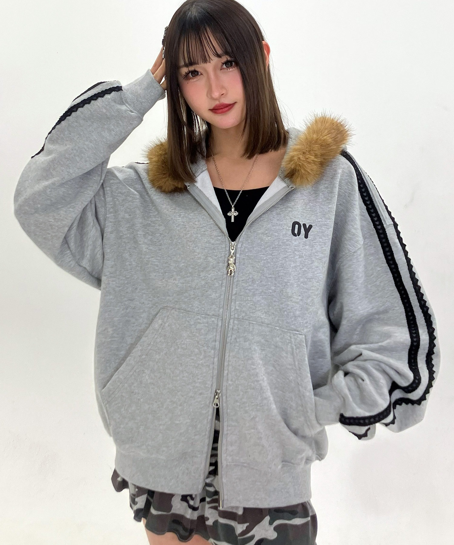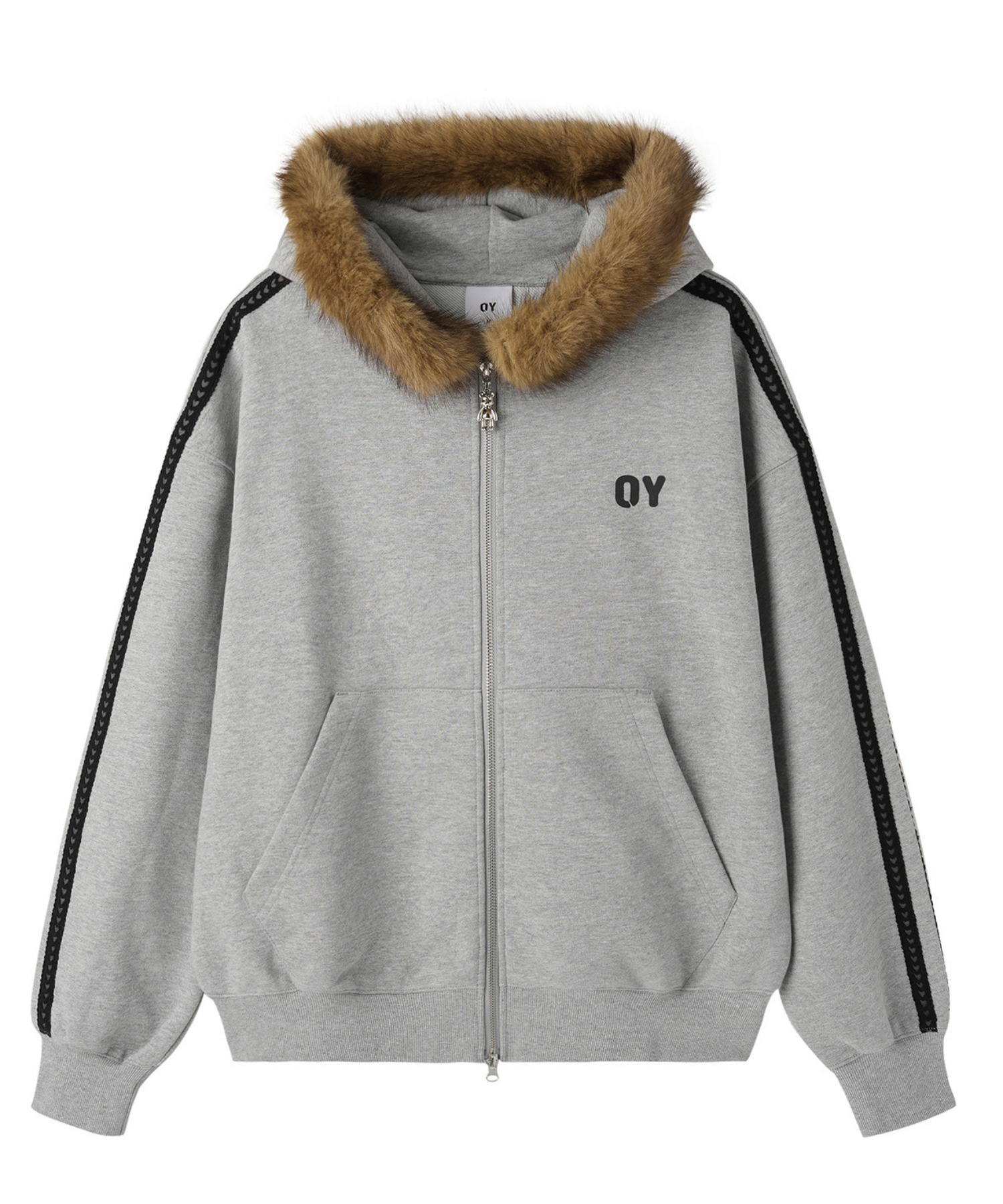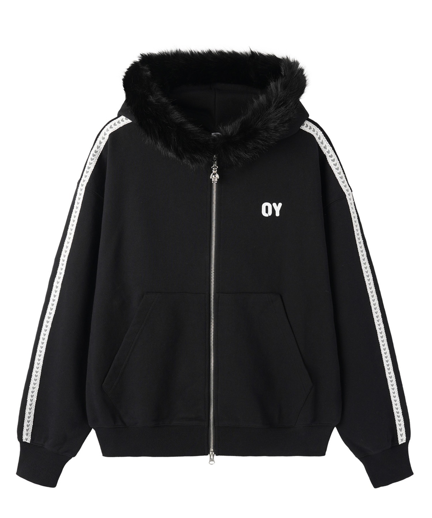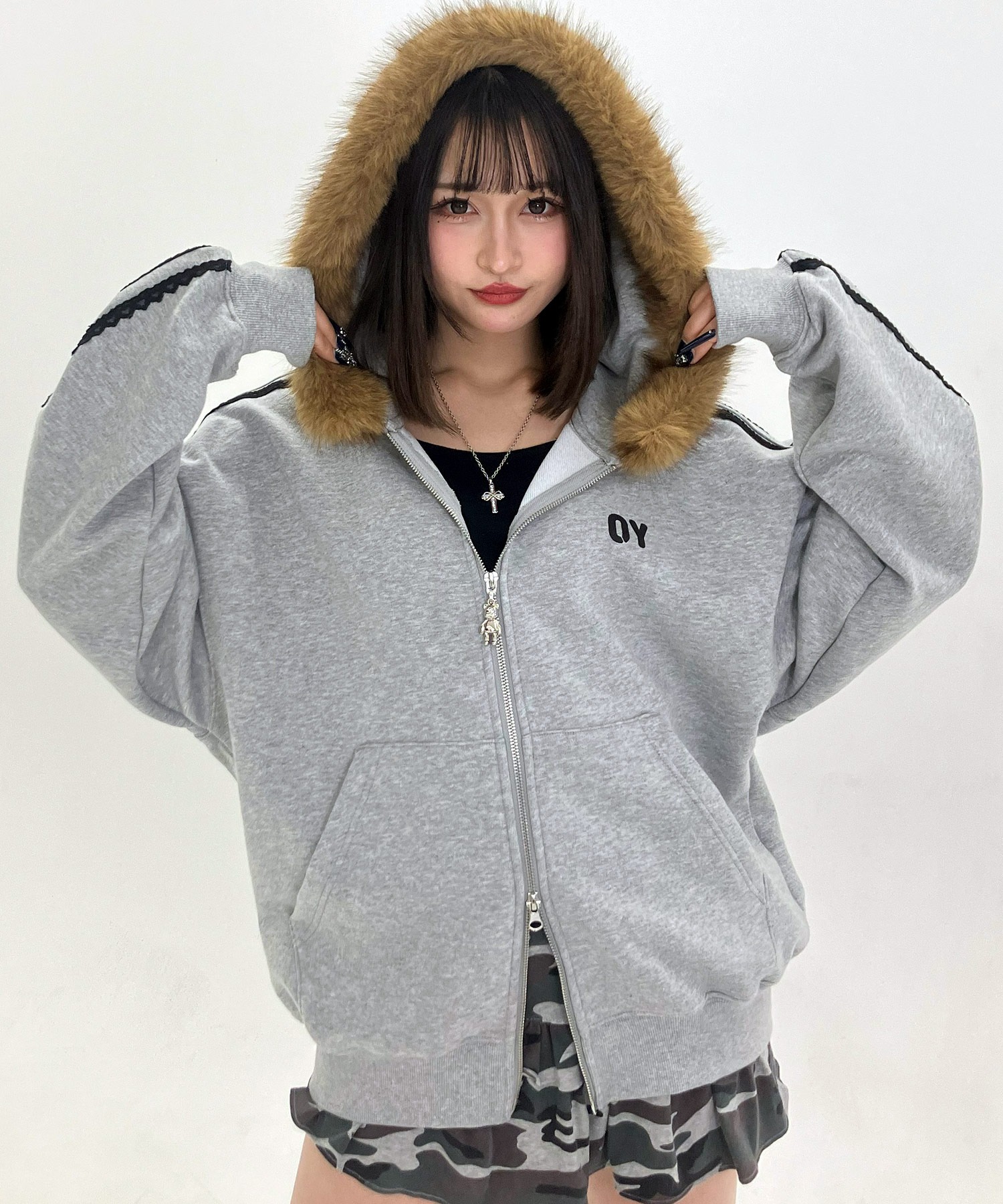 A fur-trim hoodie featuring an eye-catching back design boldly incorporating classic lace motifs.
