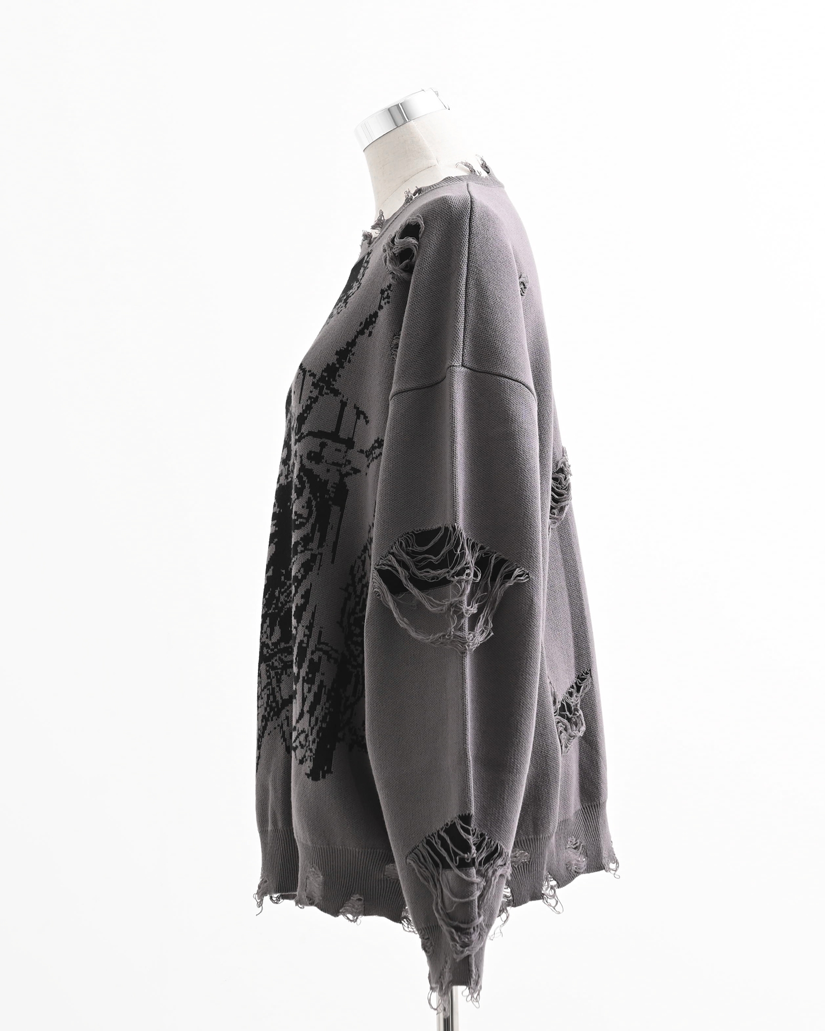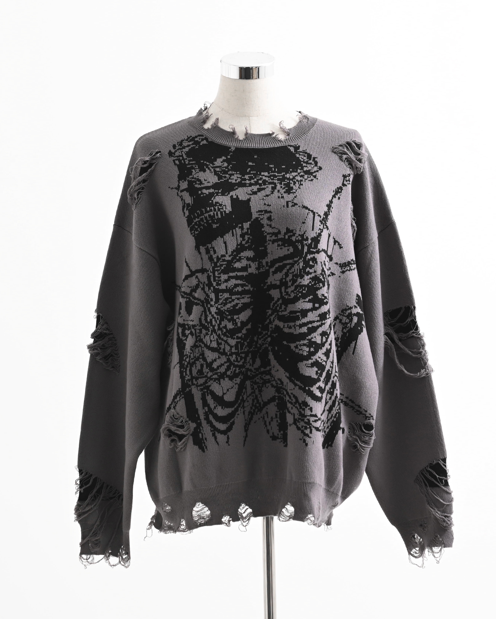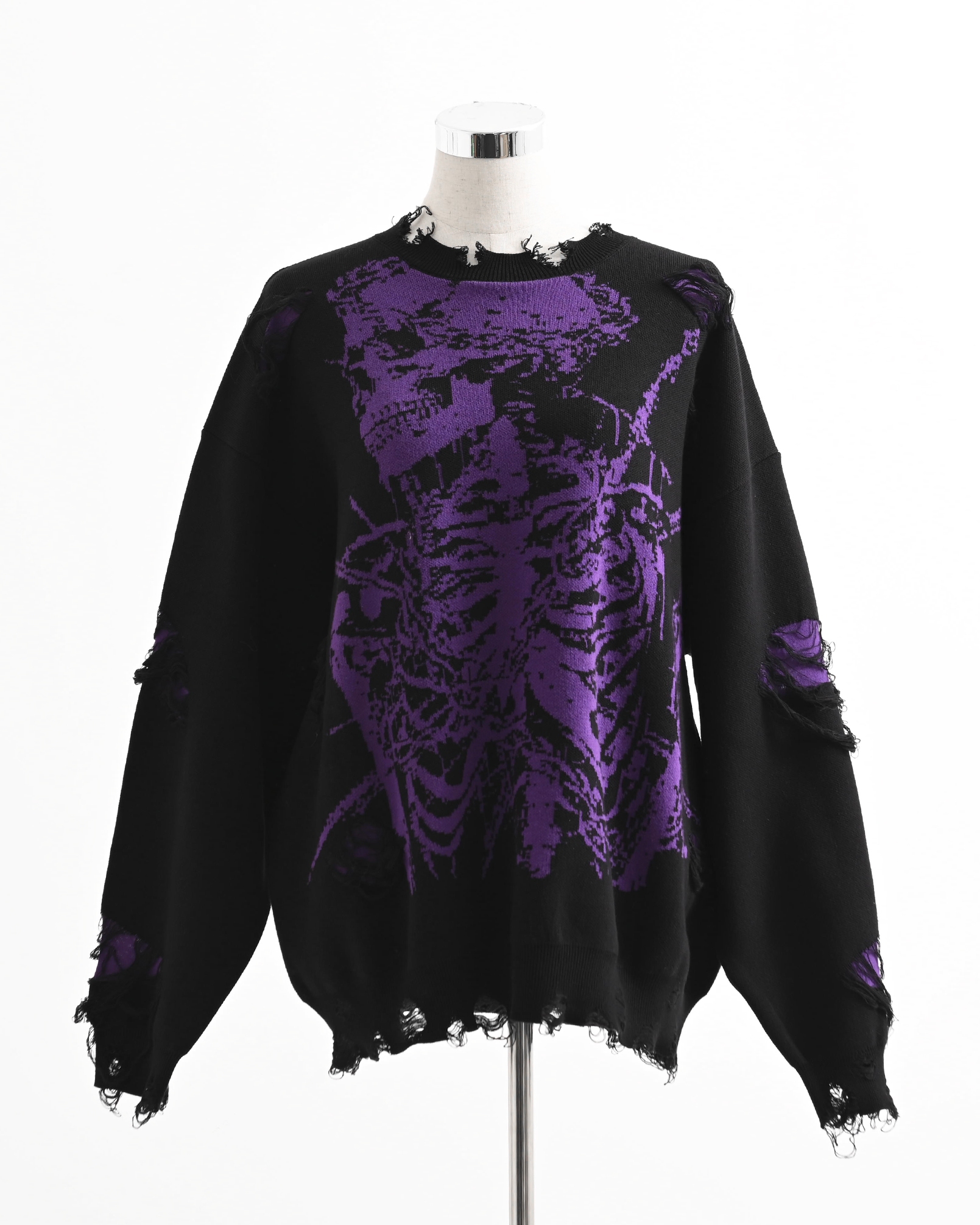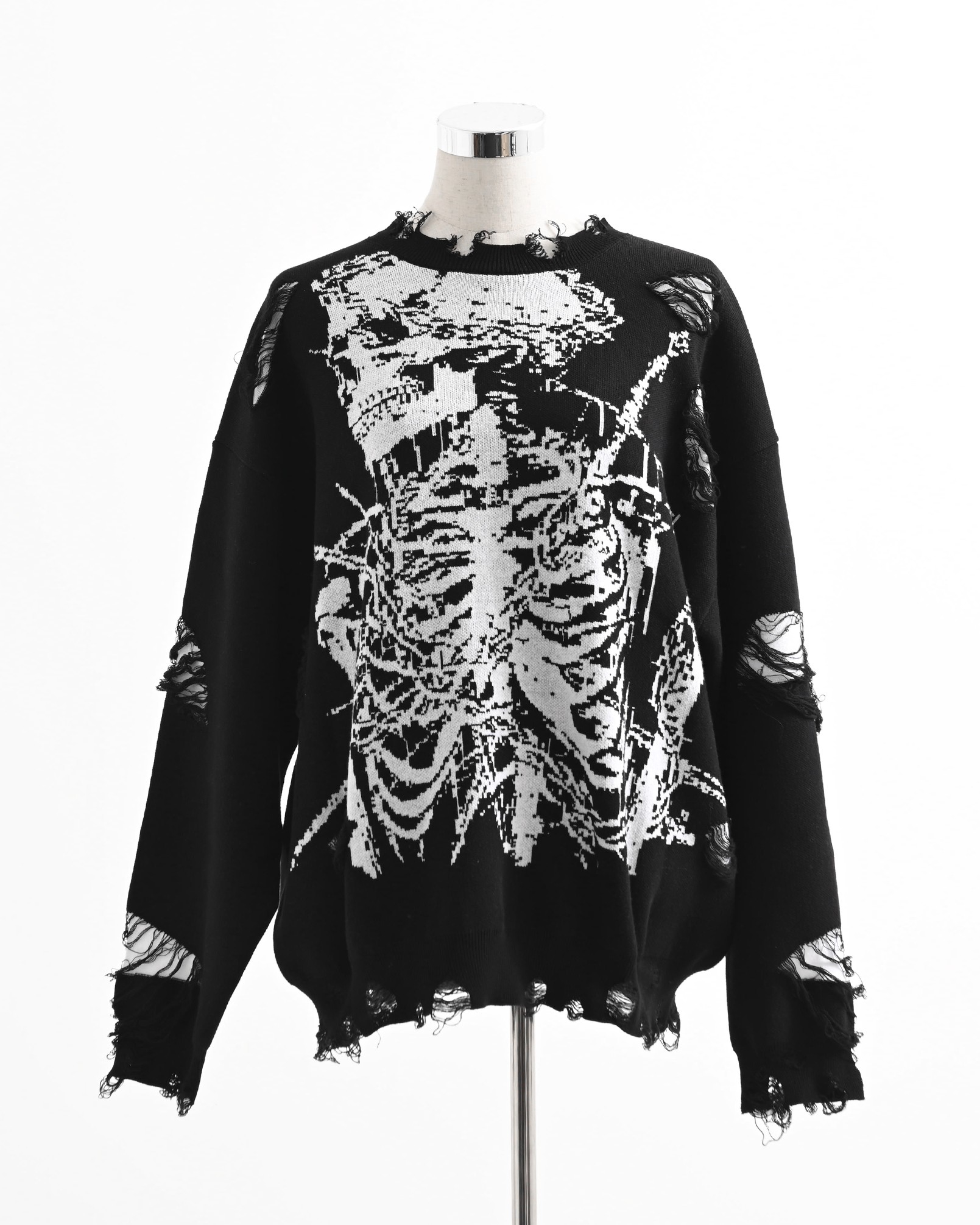 A pullover knit featuring skull artwork and distressed ""broken"" processing.