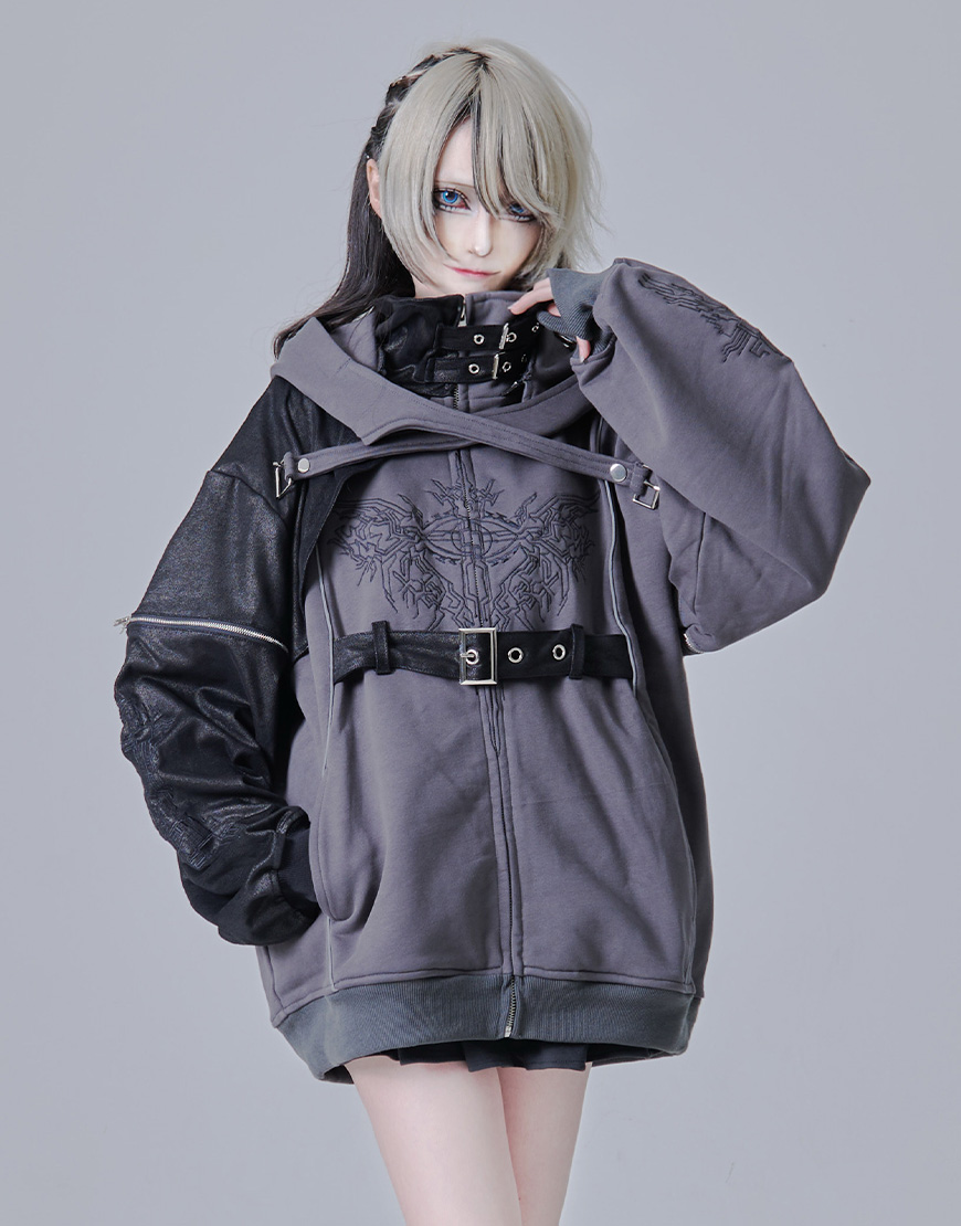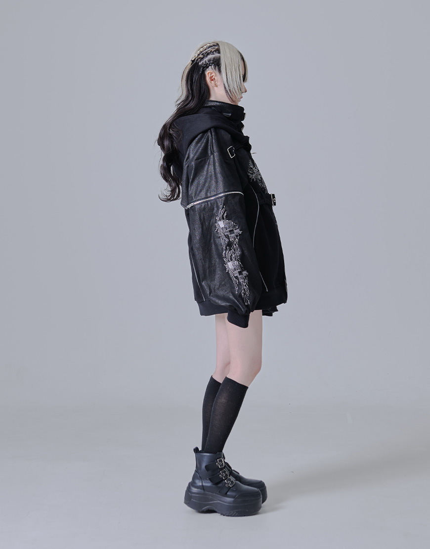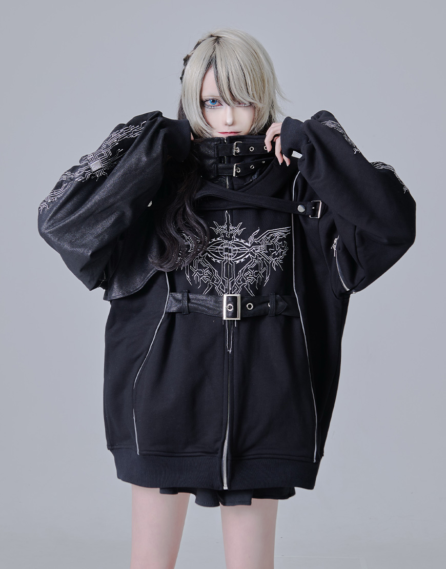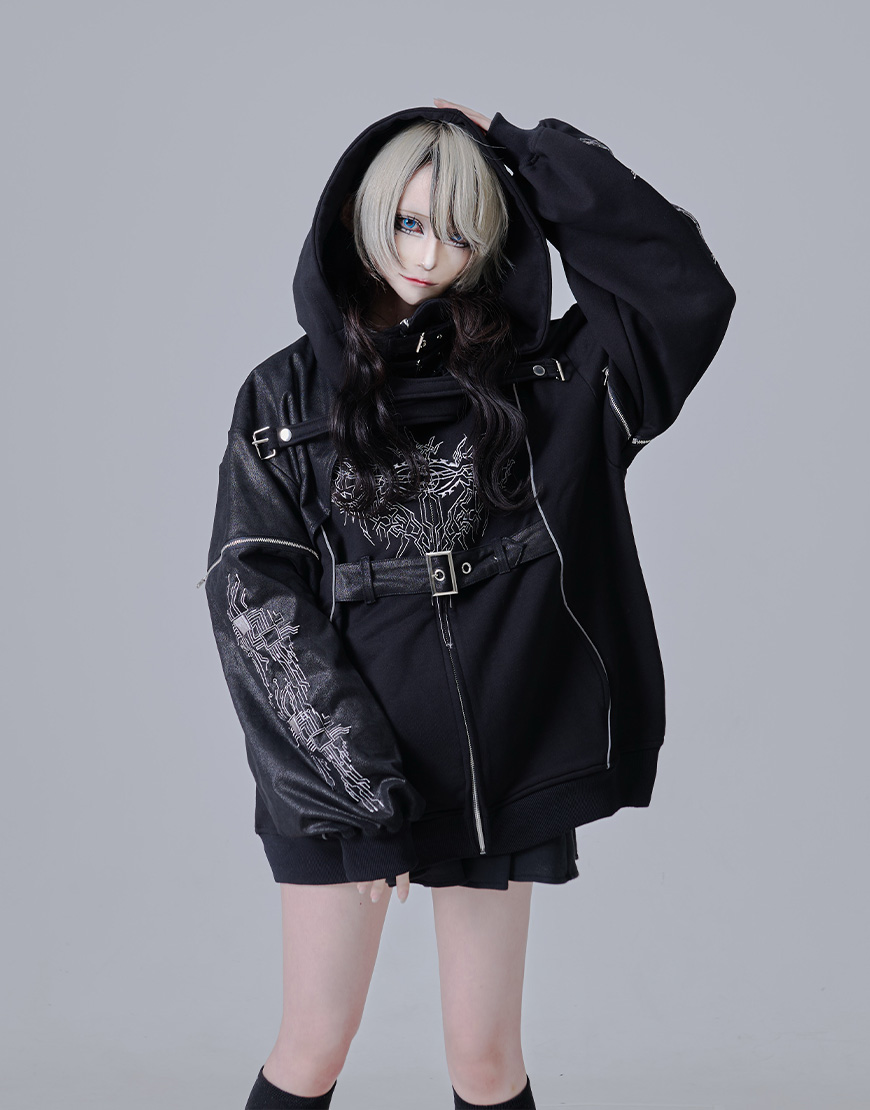 An iconic graphic is placed on the front, while harness belts, buckles, and panelled design elements are combined to emphasize ililil’s signature dark, decadent mood.