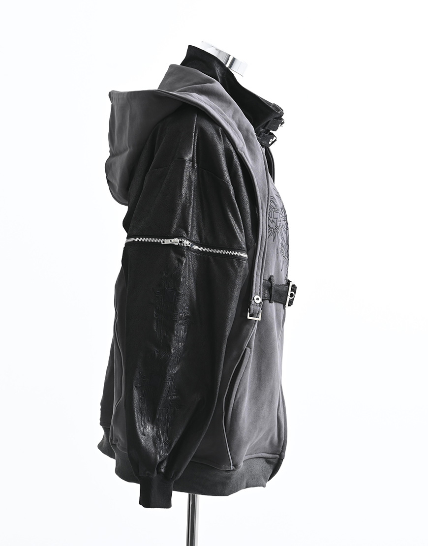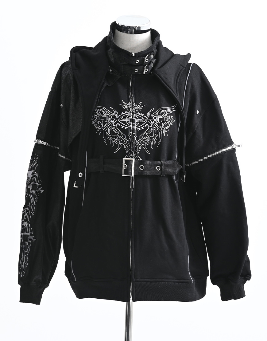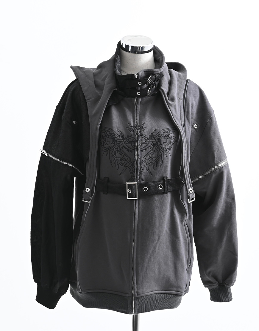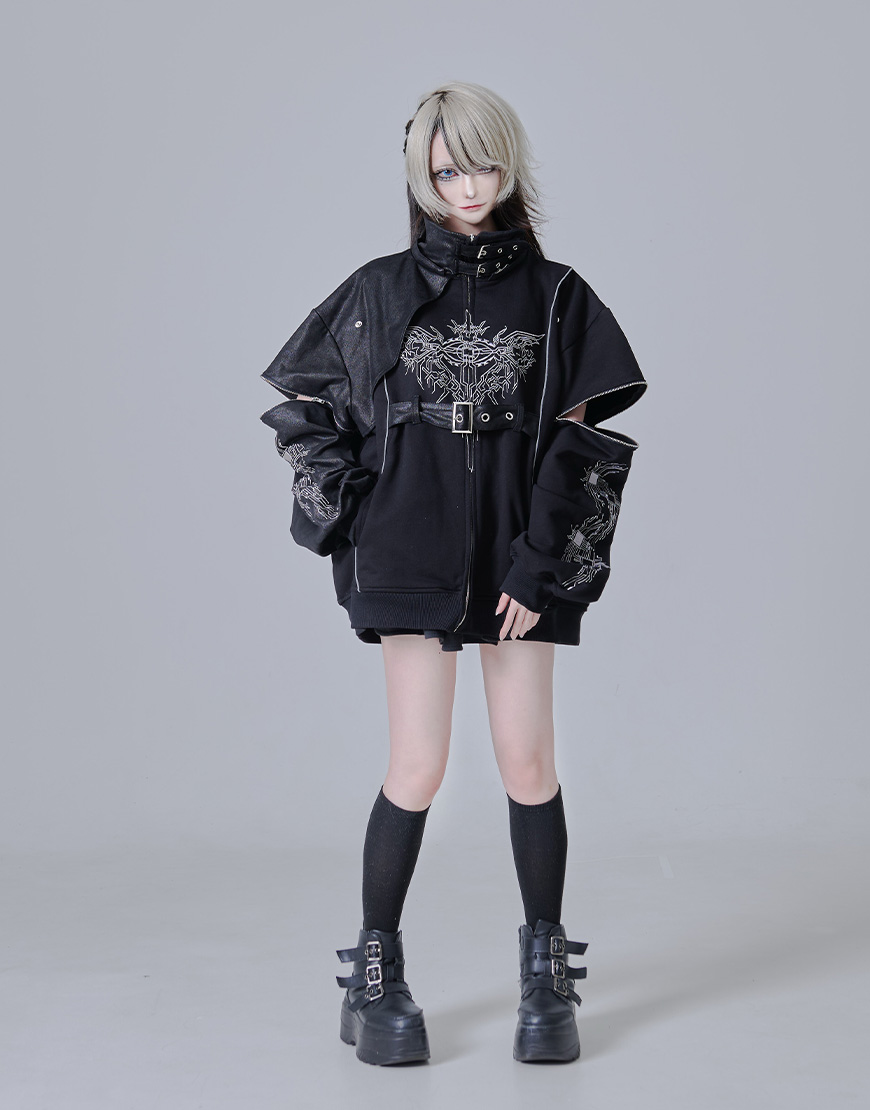 An iconic graphic is placed on the front, while harness belts, buckles, and panelled design elements are combined to emphasize ililil’s signature dark, decadent mood.