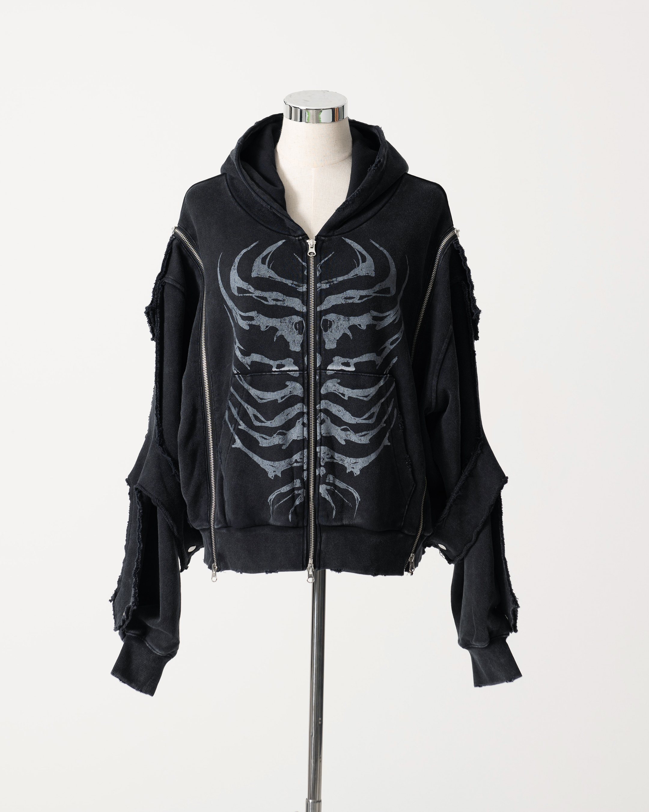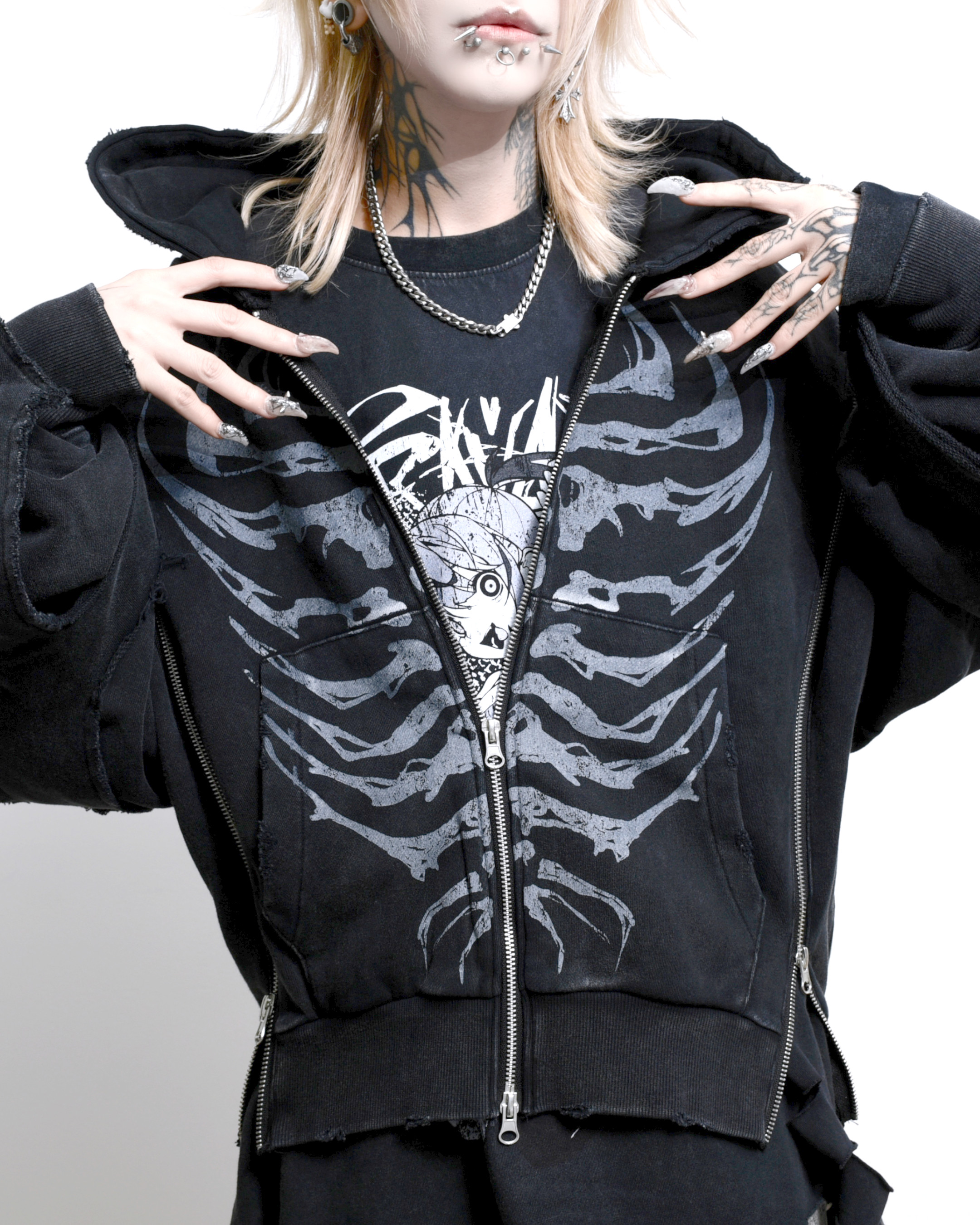 Featuring bone-inspired artwork and grunge-infused detailing, this piece stands out with a strong visual identity.