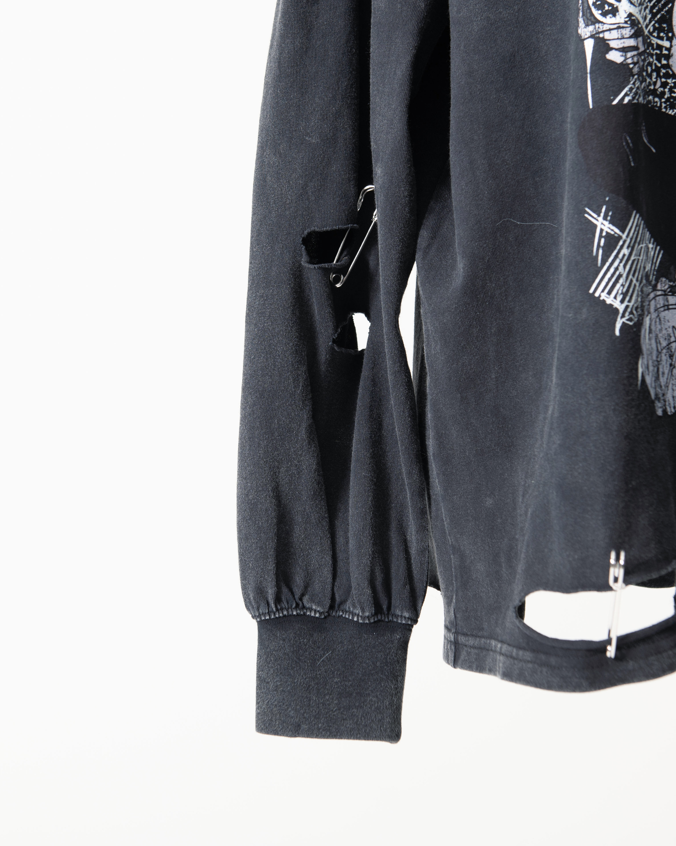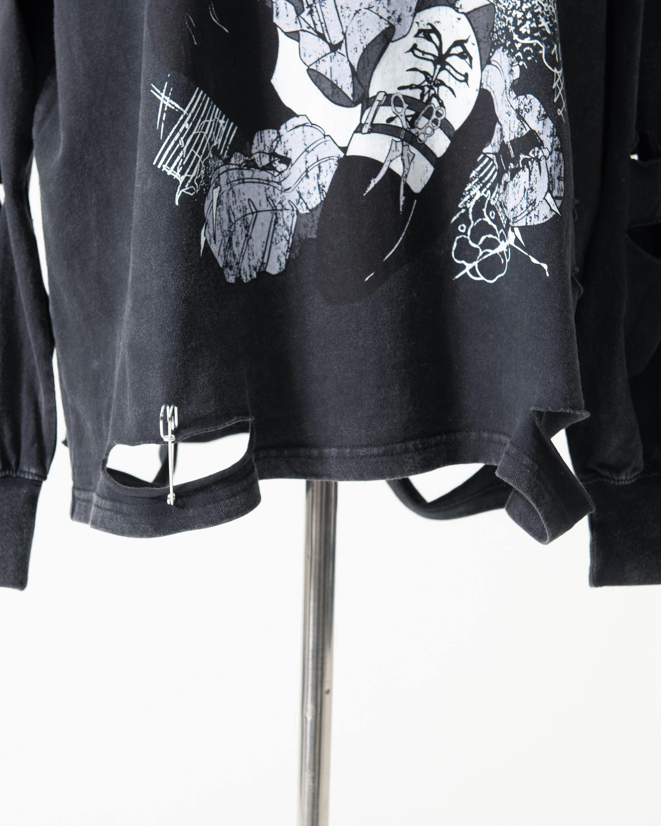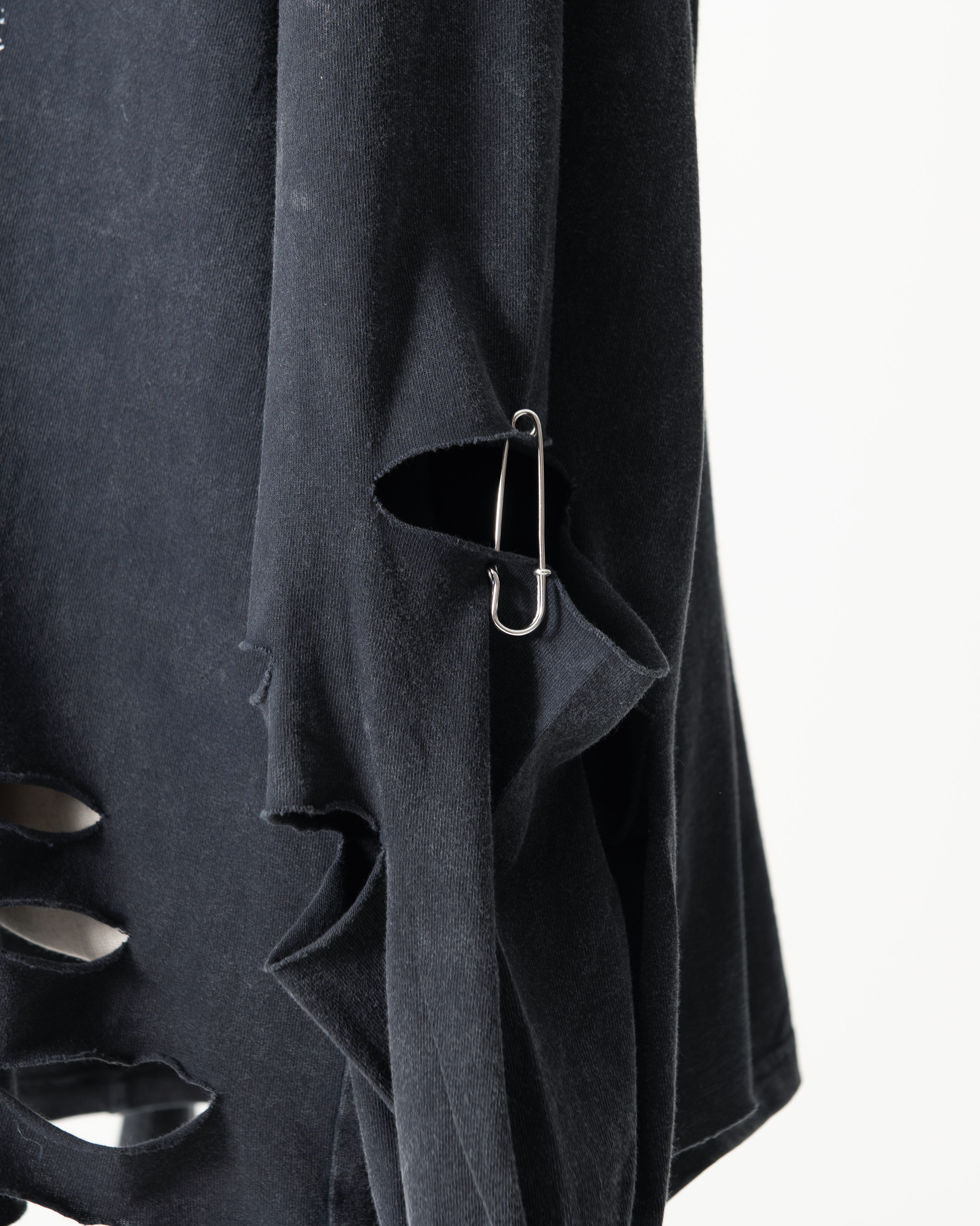 ■Cut-and-distressed detailing applied to both sleeves and the hems of the front and back body.