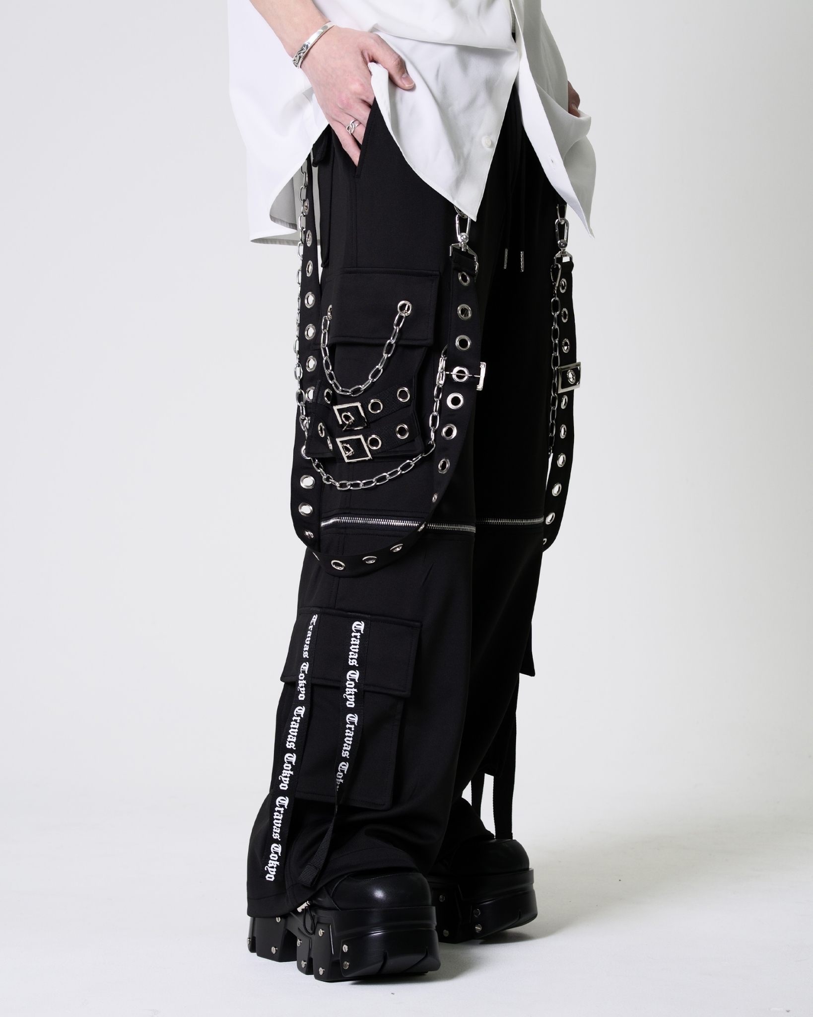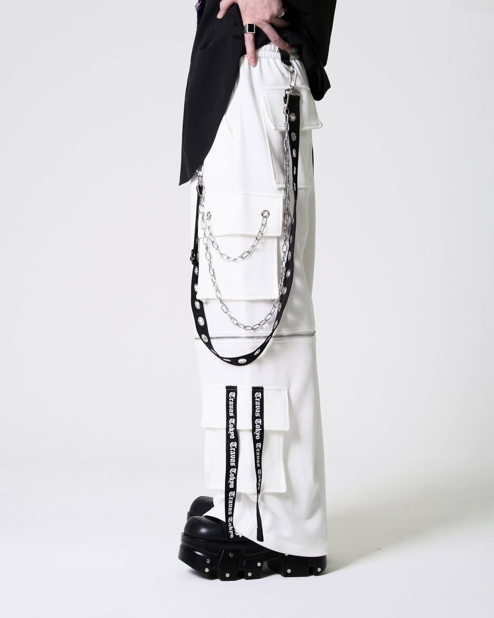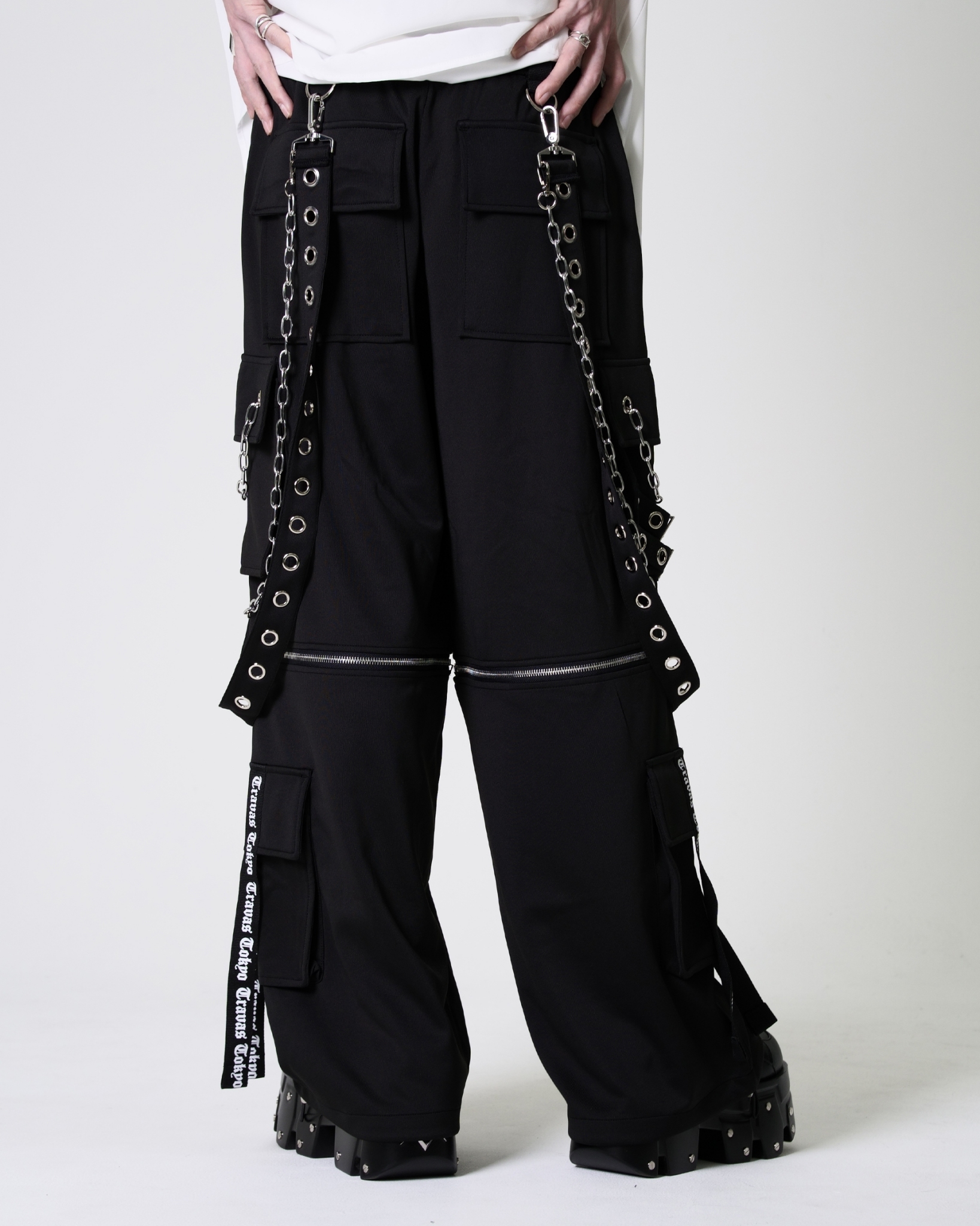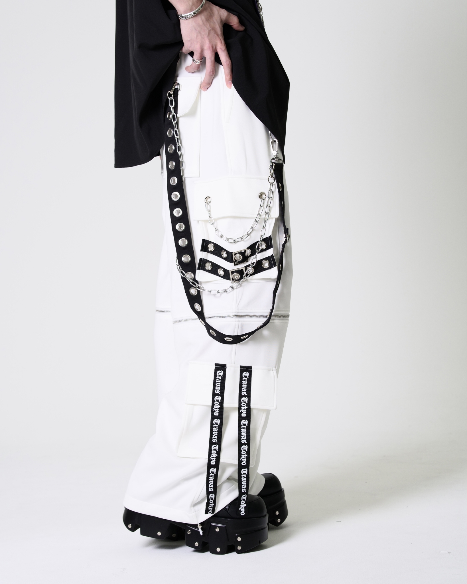 TRAVAS original cargo pants featuring distinctive side suspenders and logo tape details.