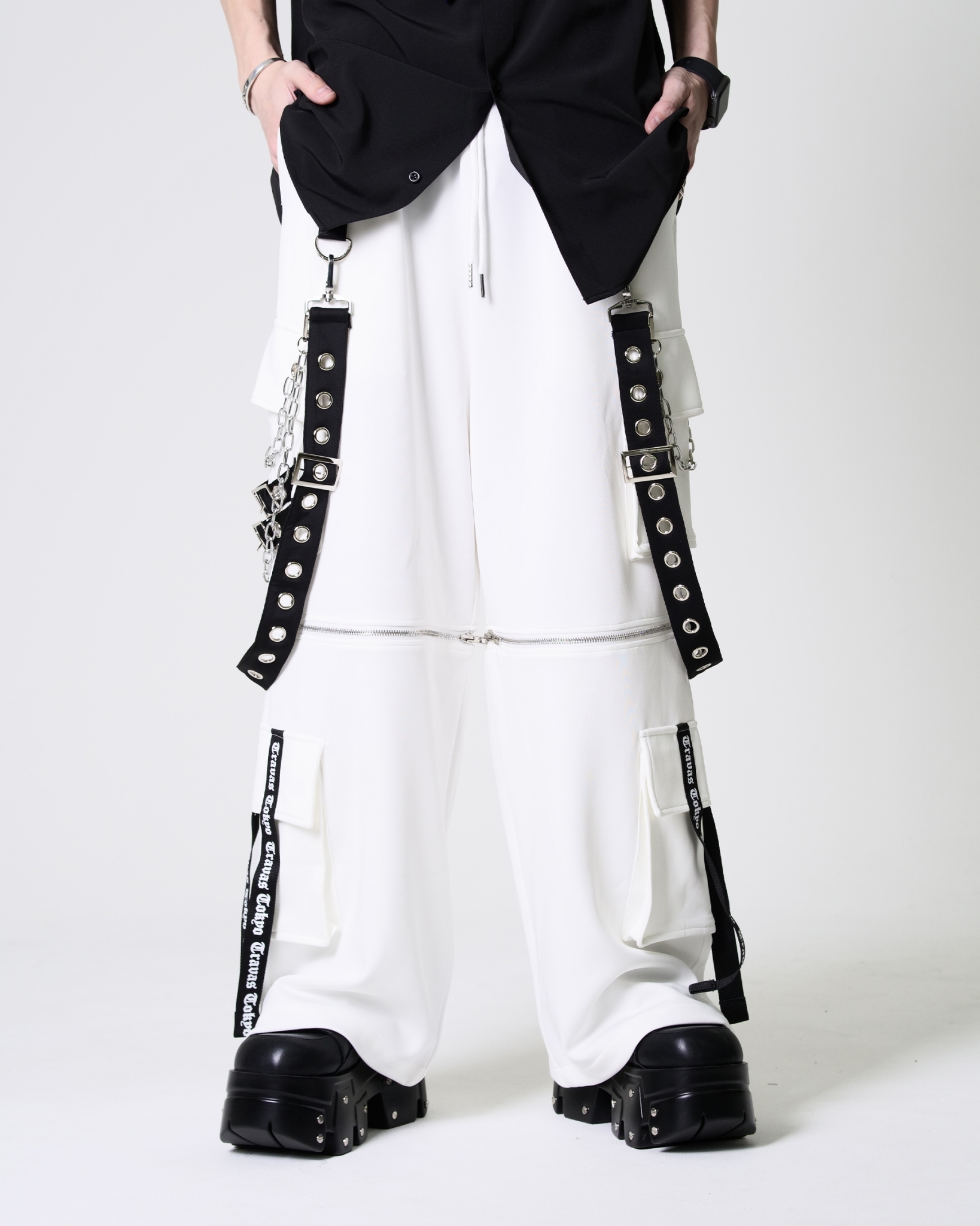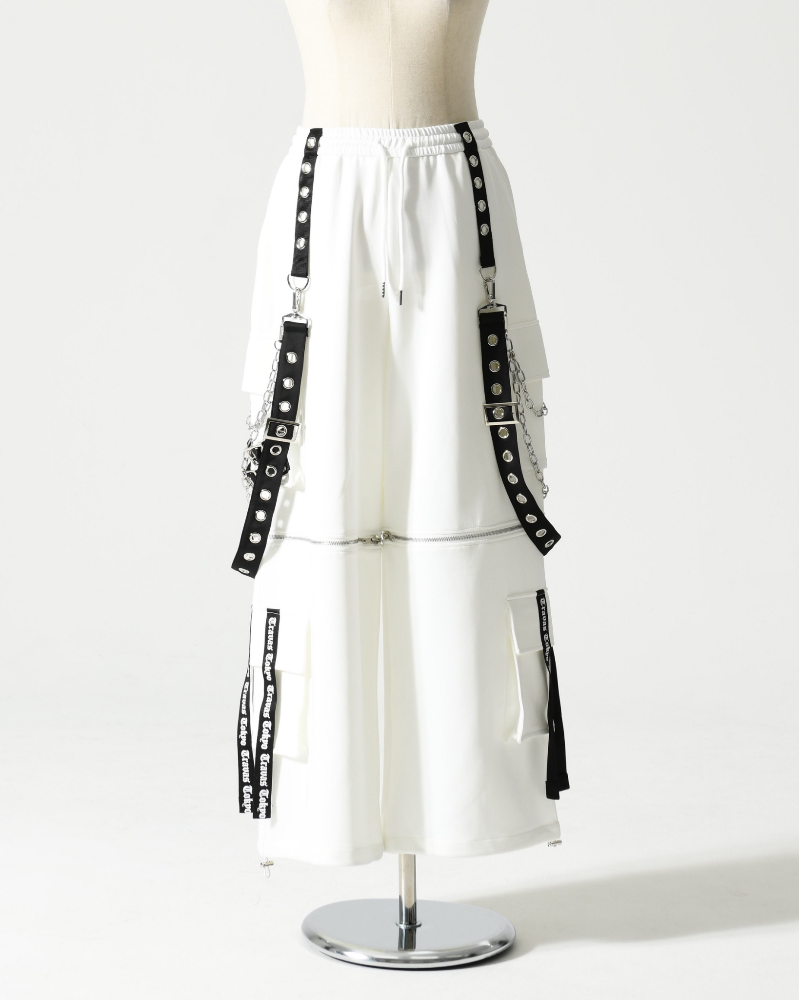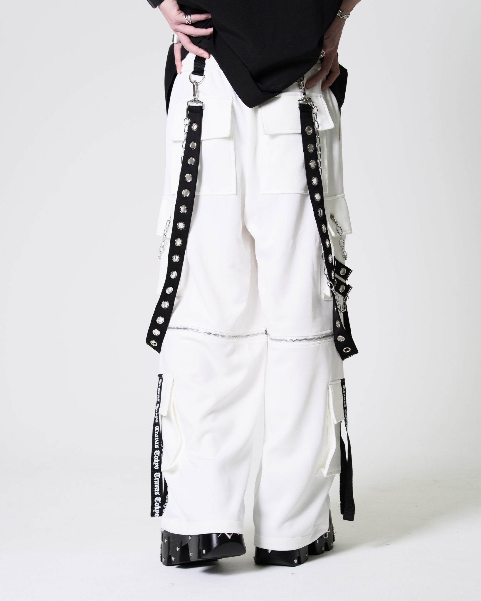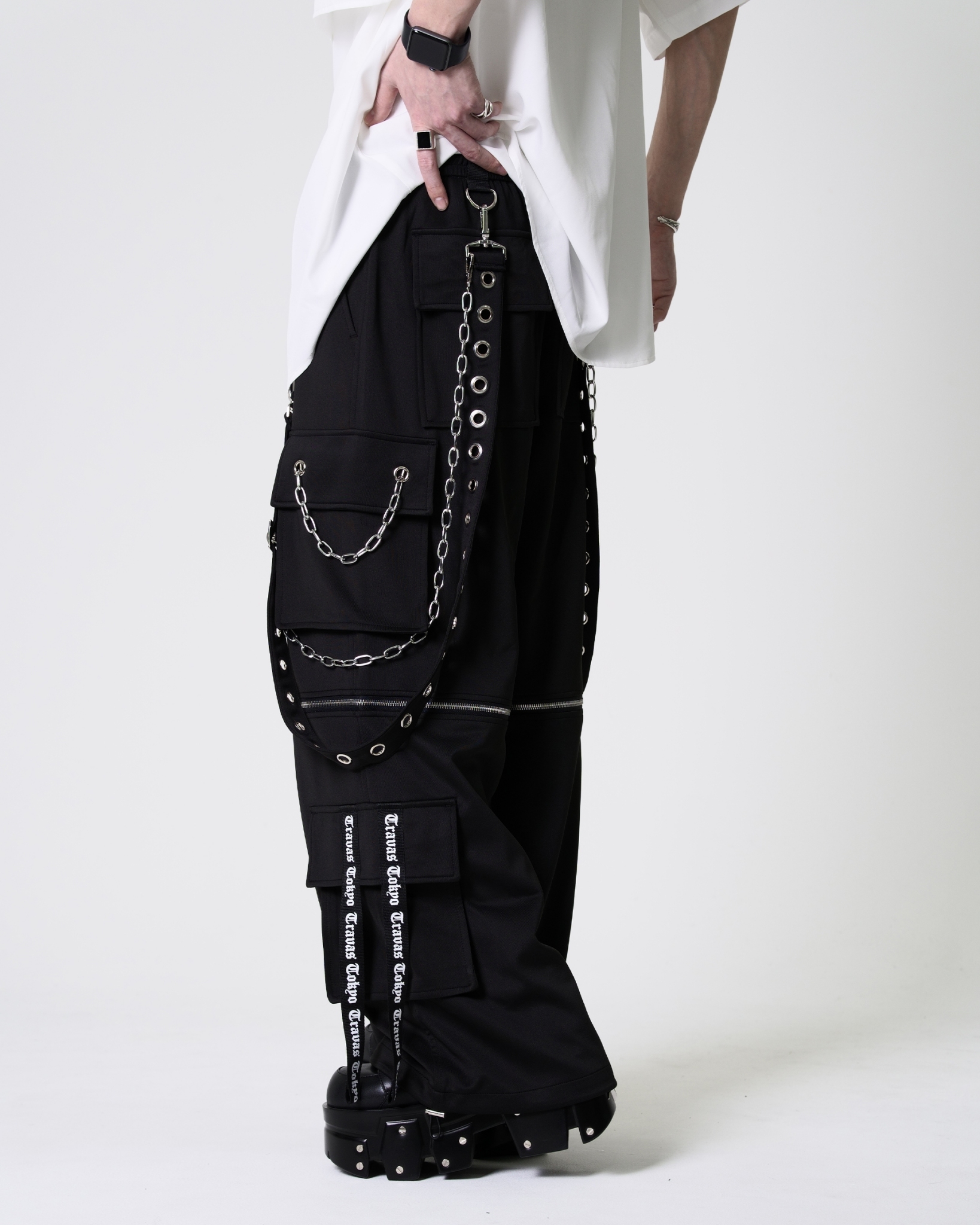 TRAVAS original cargo pants featuring distinctive side suspenders and logo tape details.