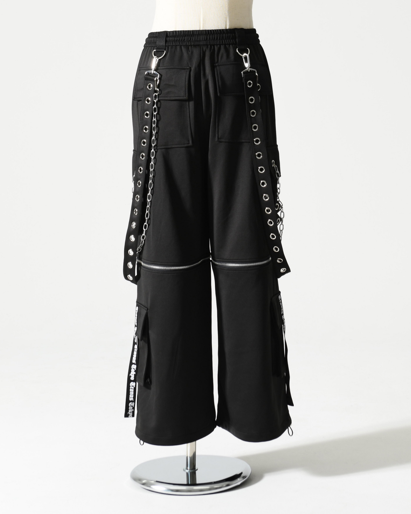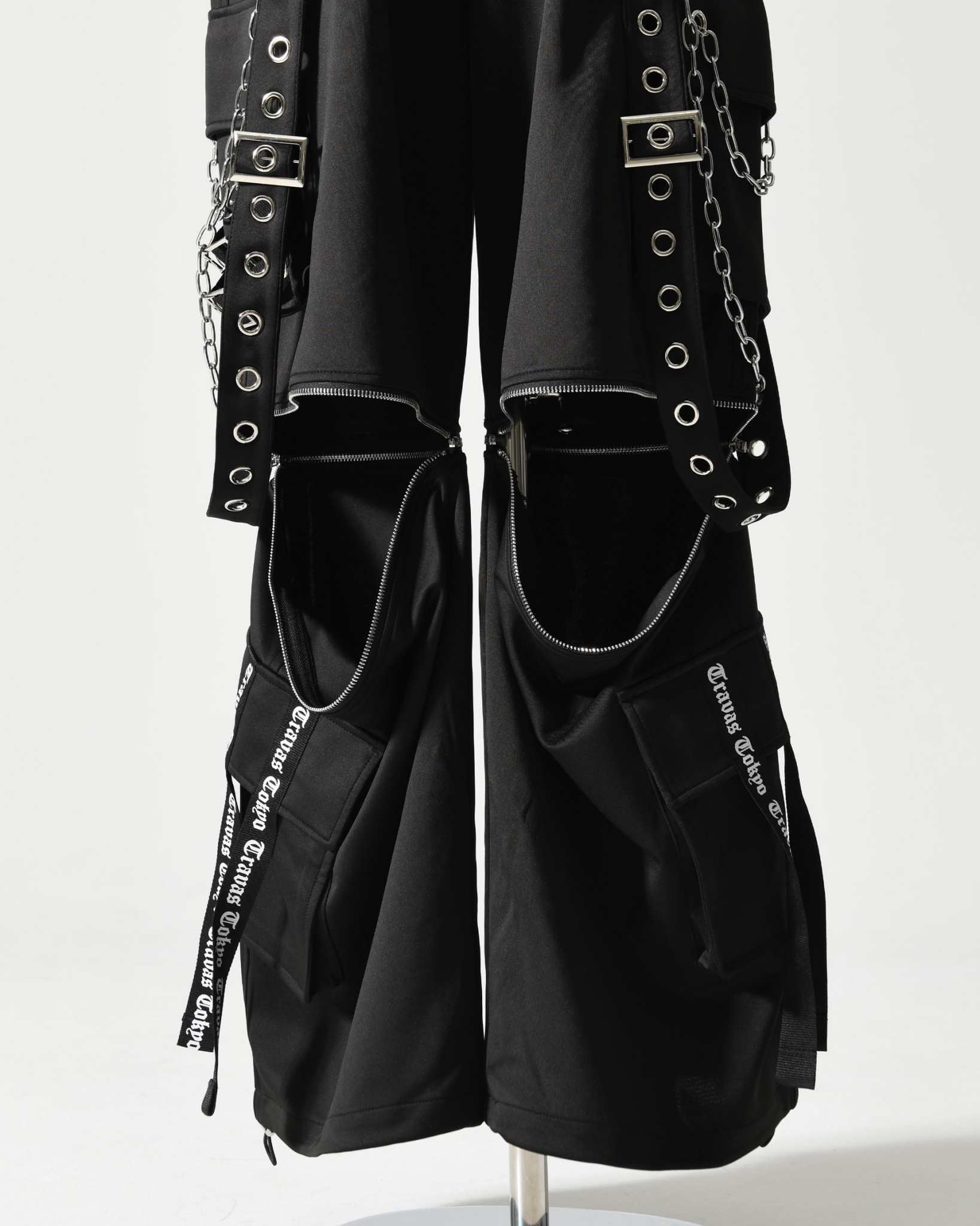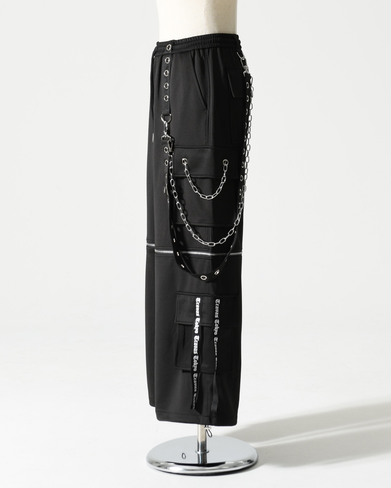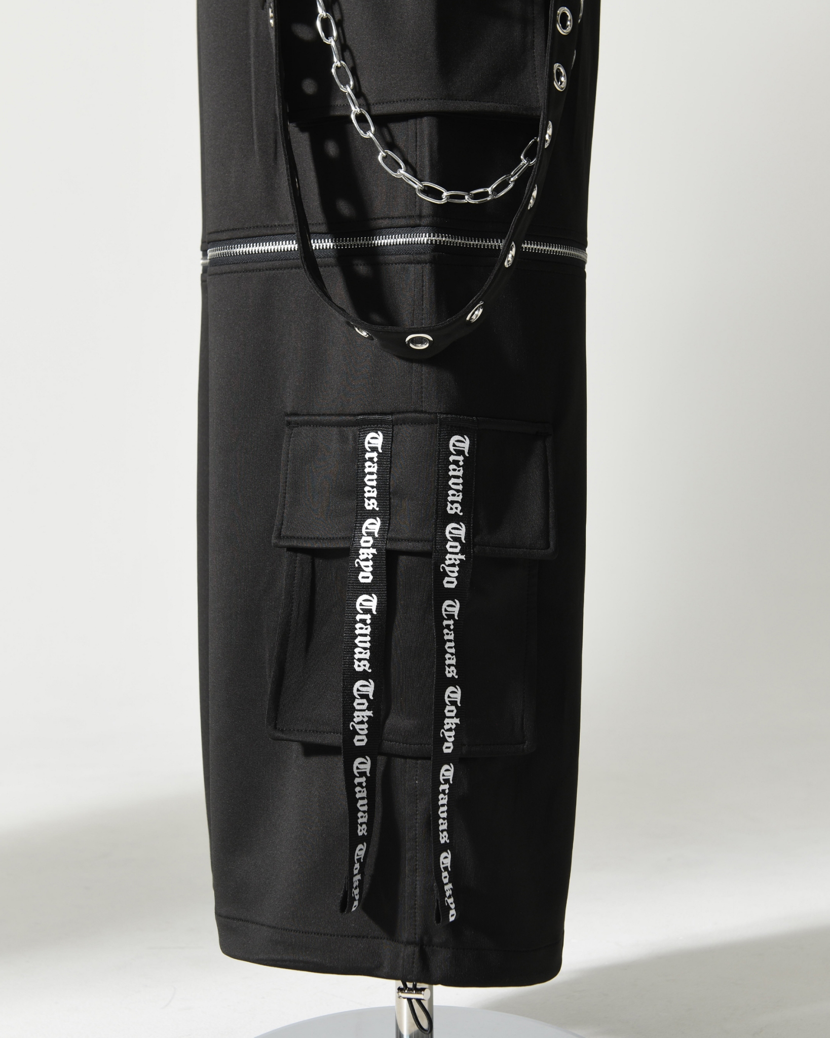 TRAVAS original cargo pants featuring distinctive side suspenders and logo tape details.