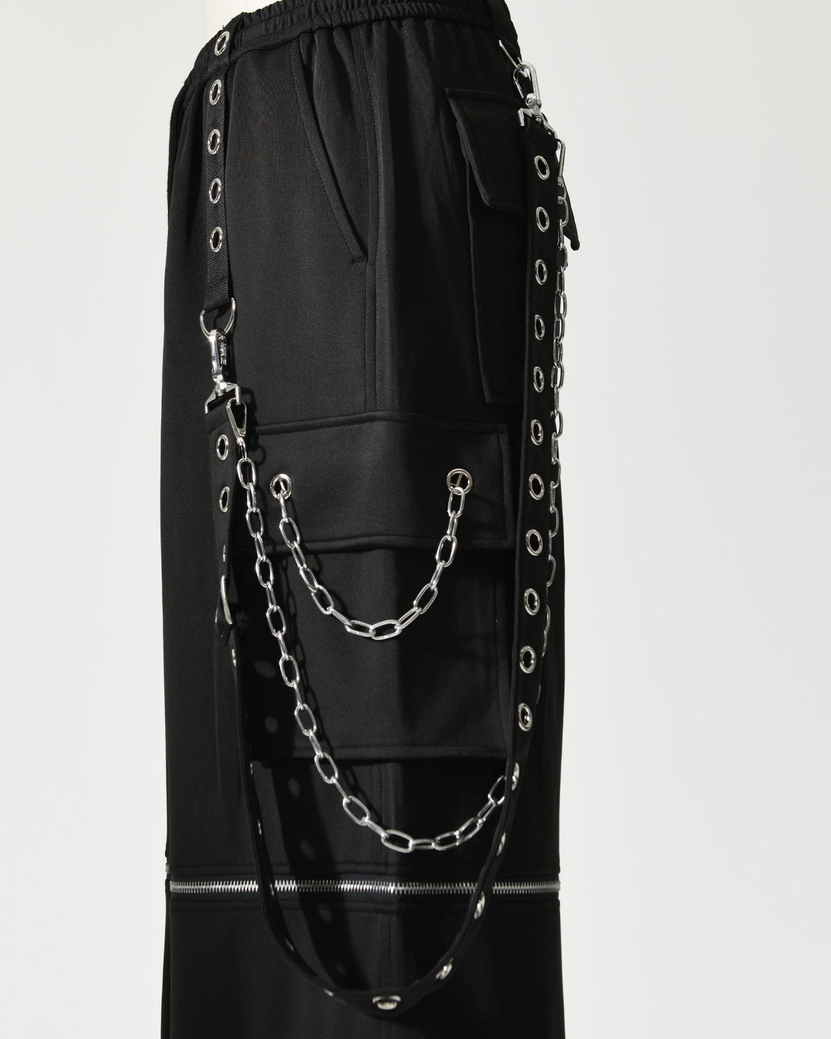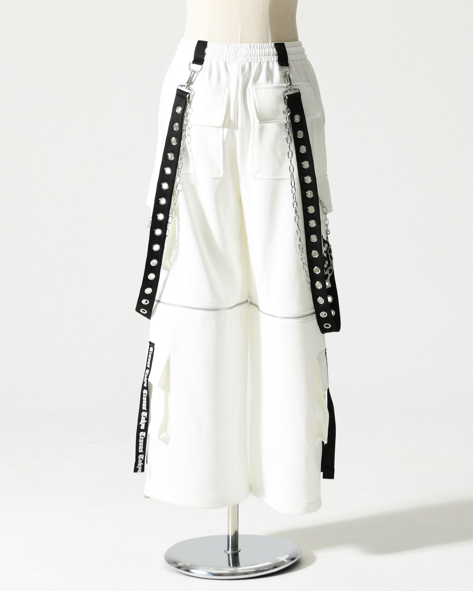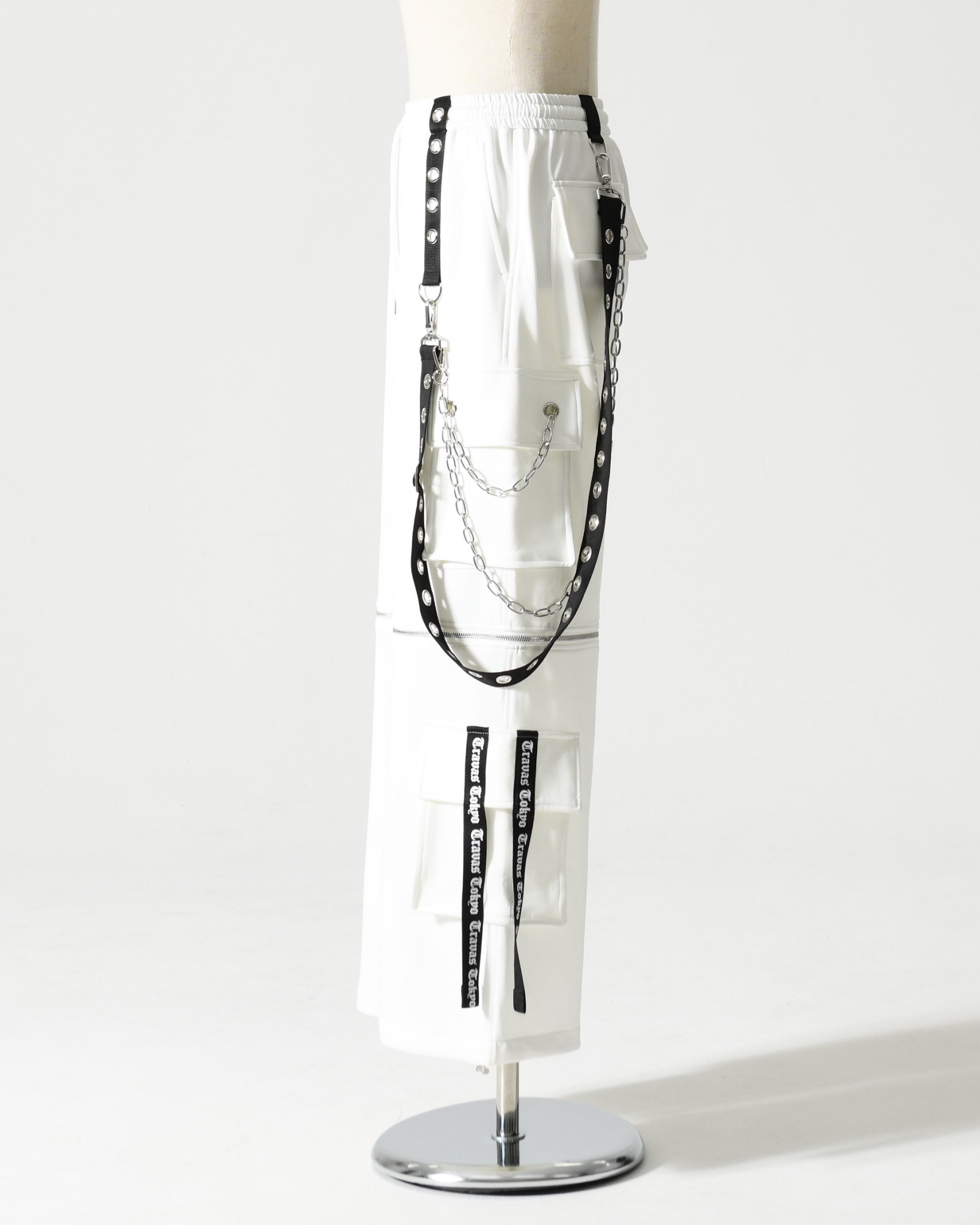 TRAVAS original cargo pants featuring distinctive side suspenders and logo tape details.