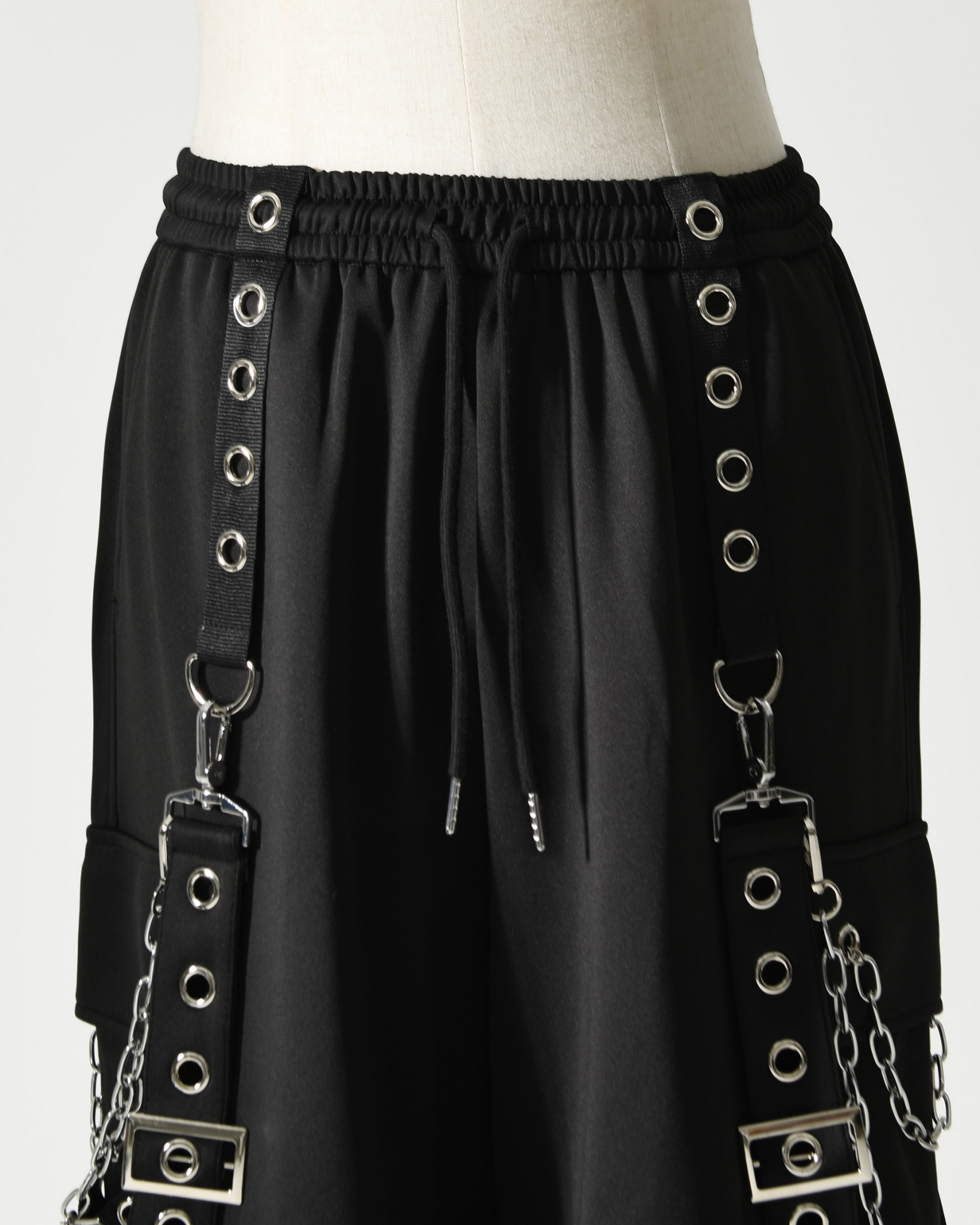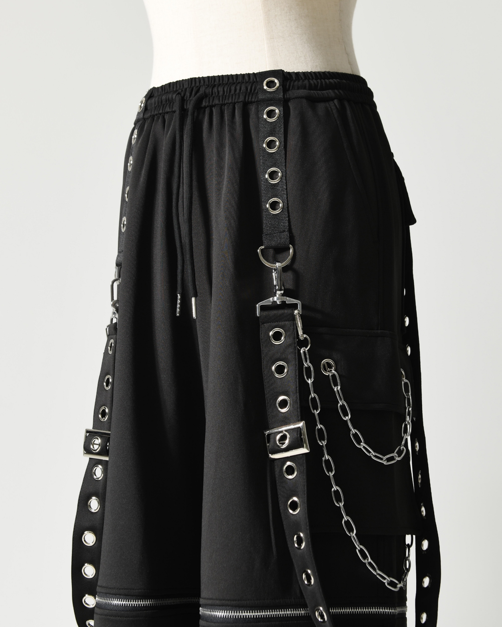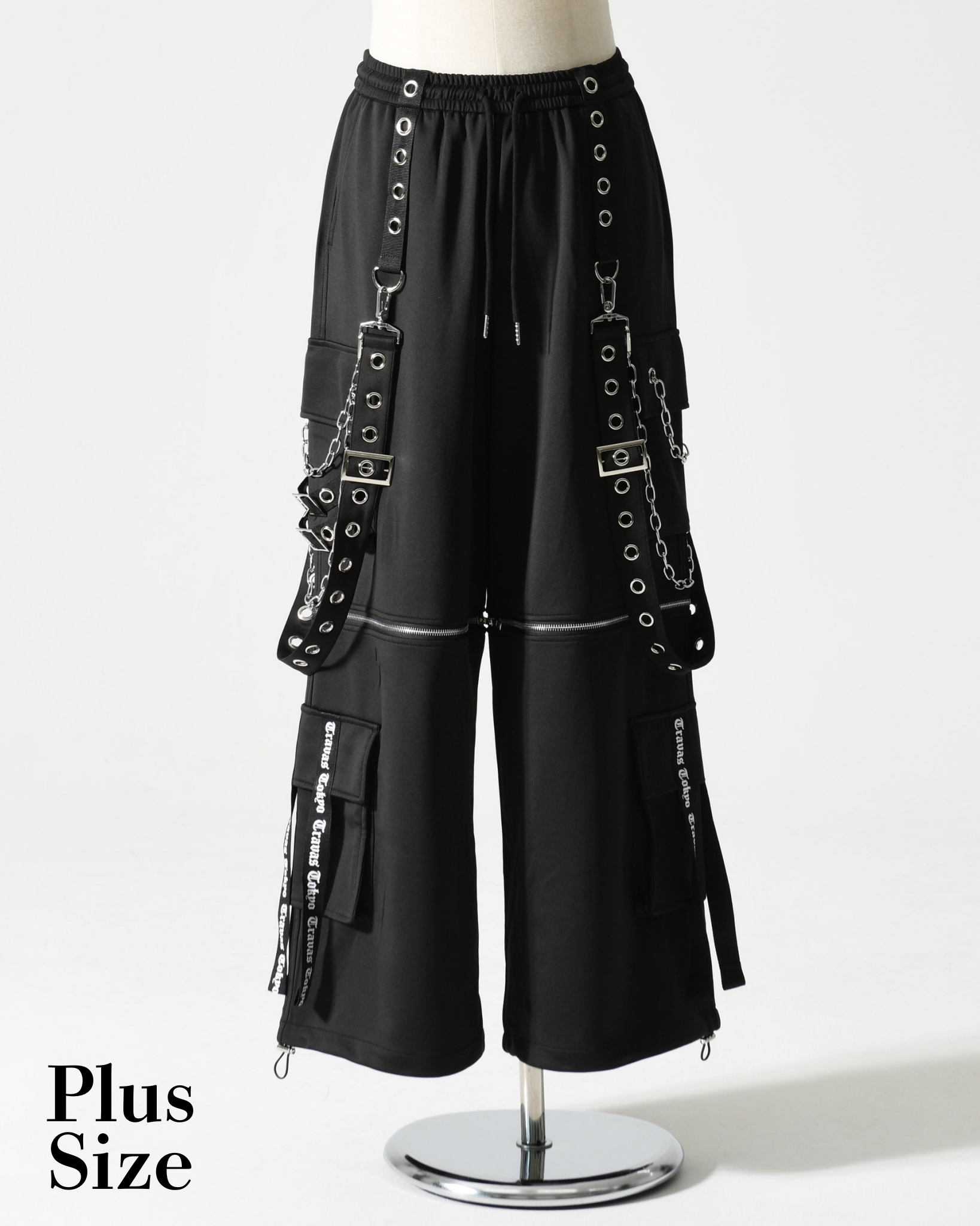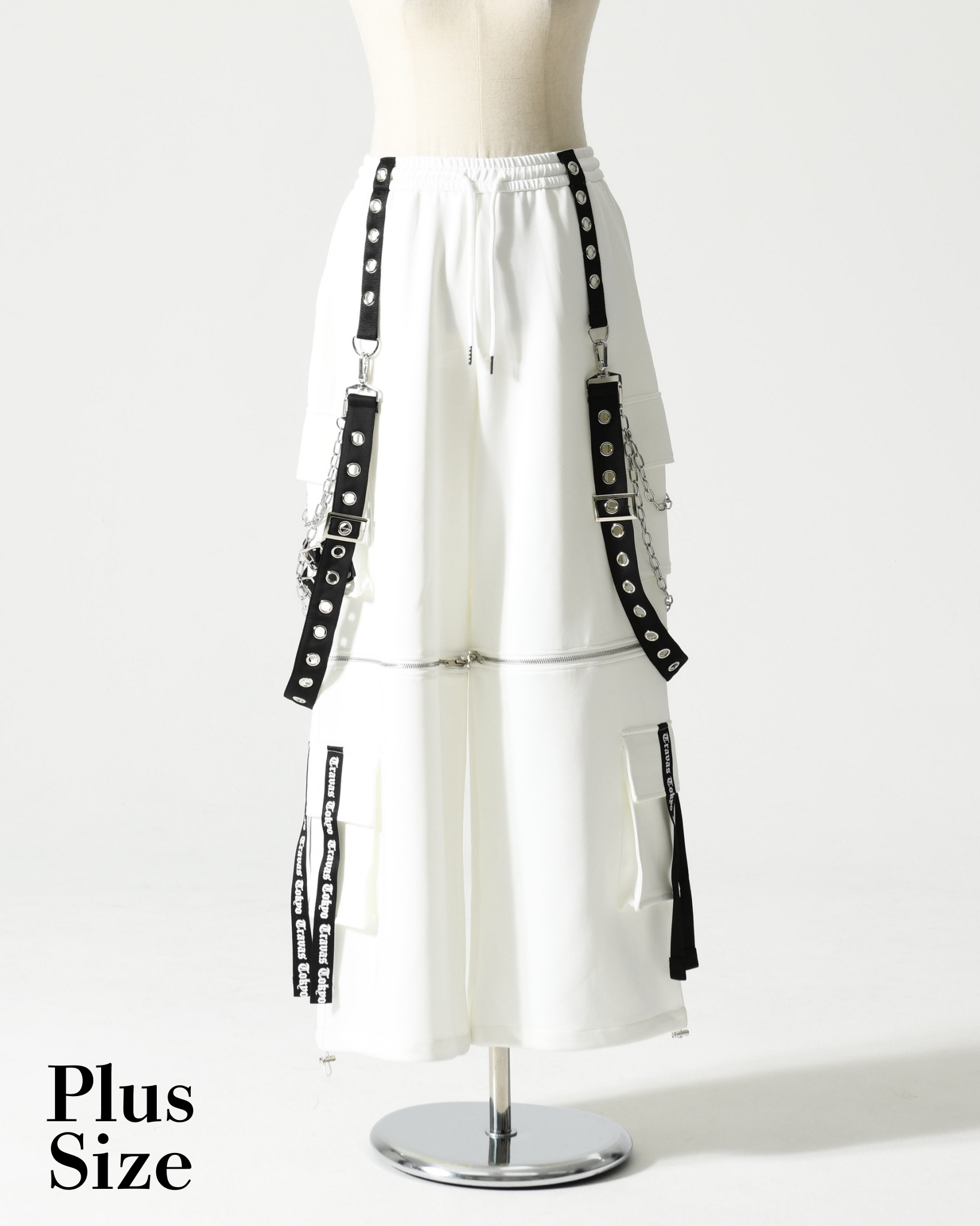 TRAVAS original cargo pants featuring distinctive side suspenders and logo tape details.