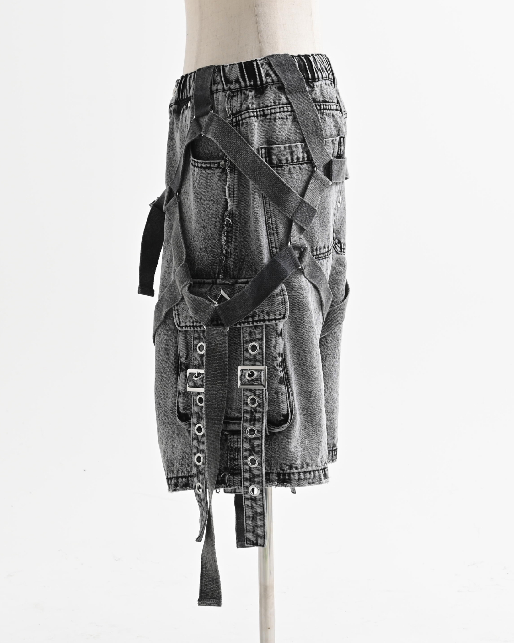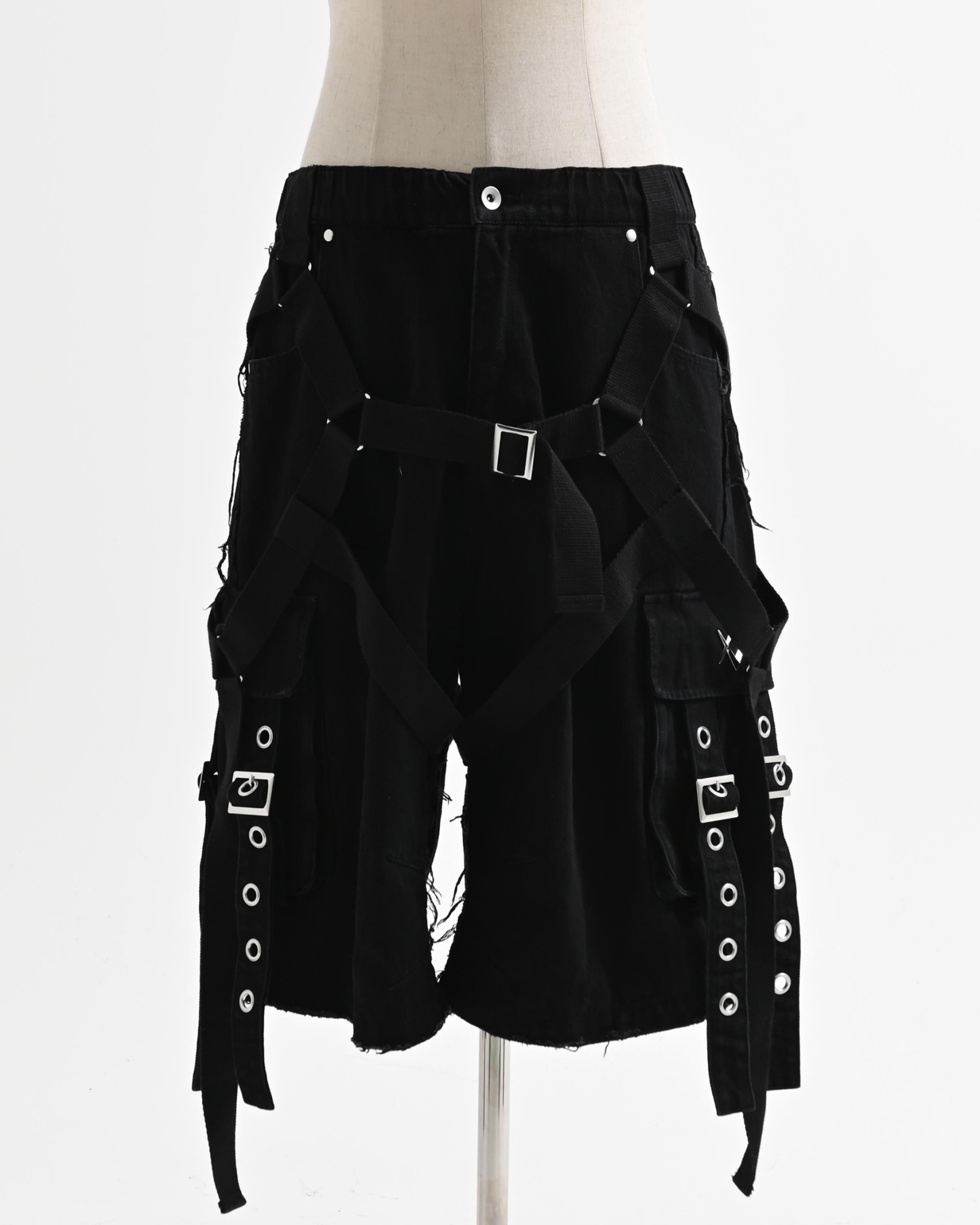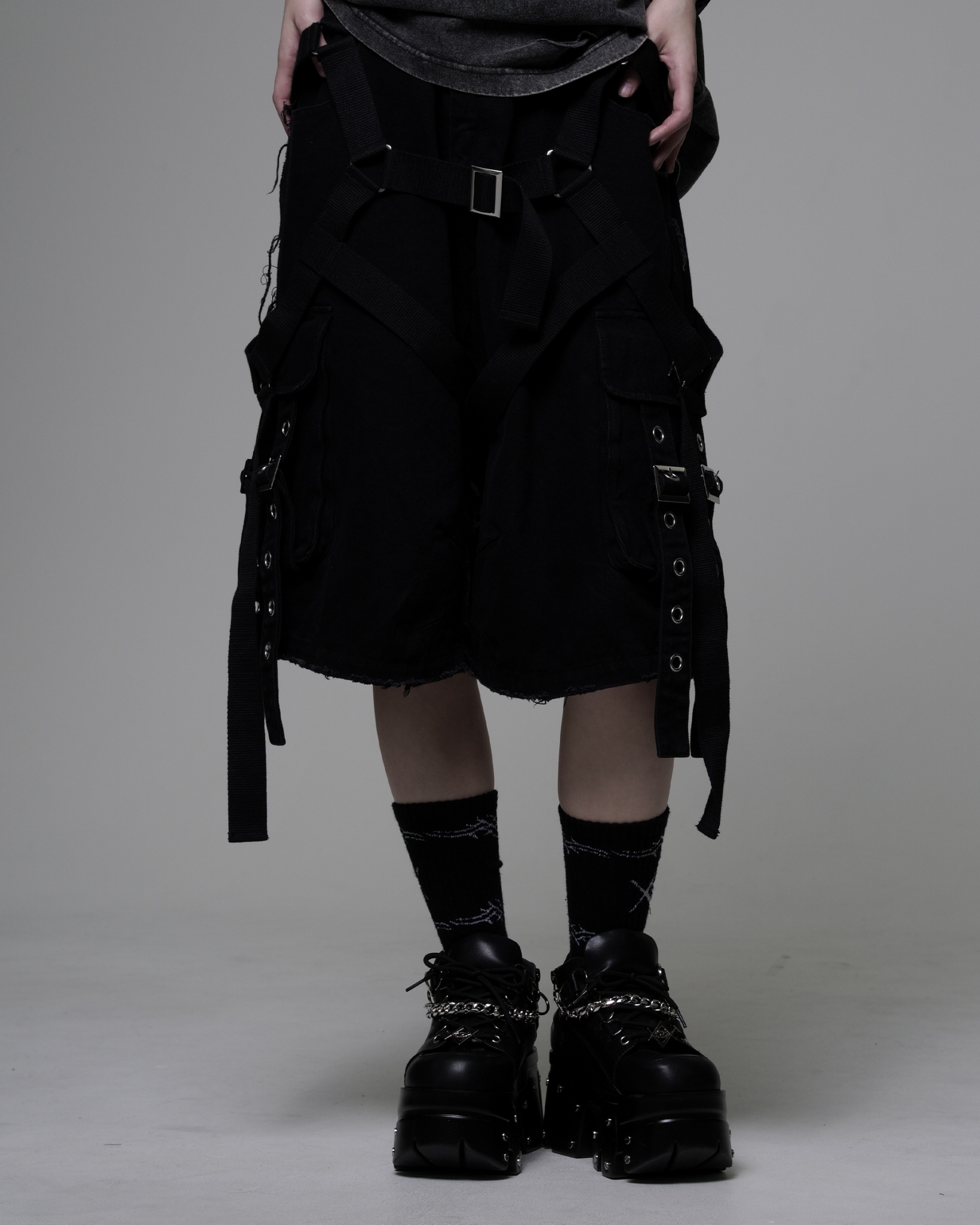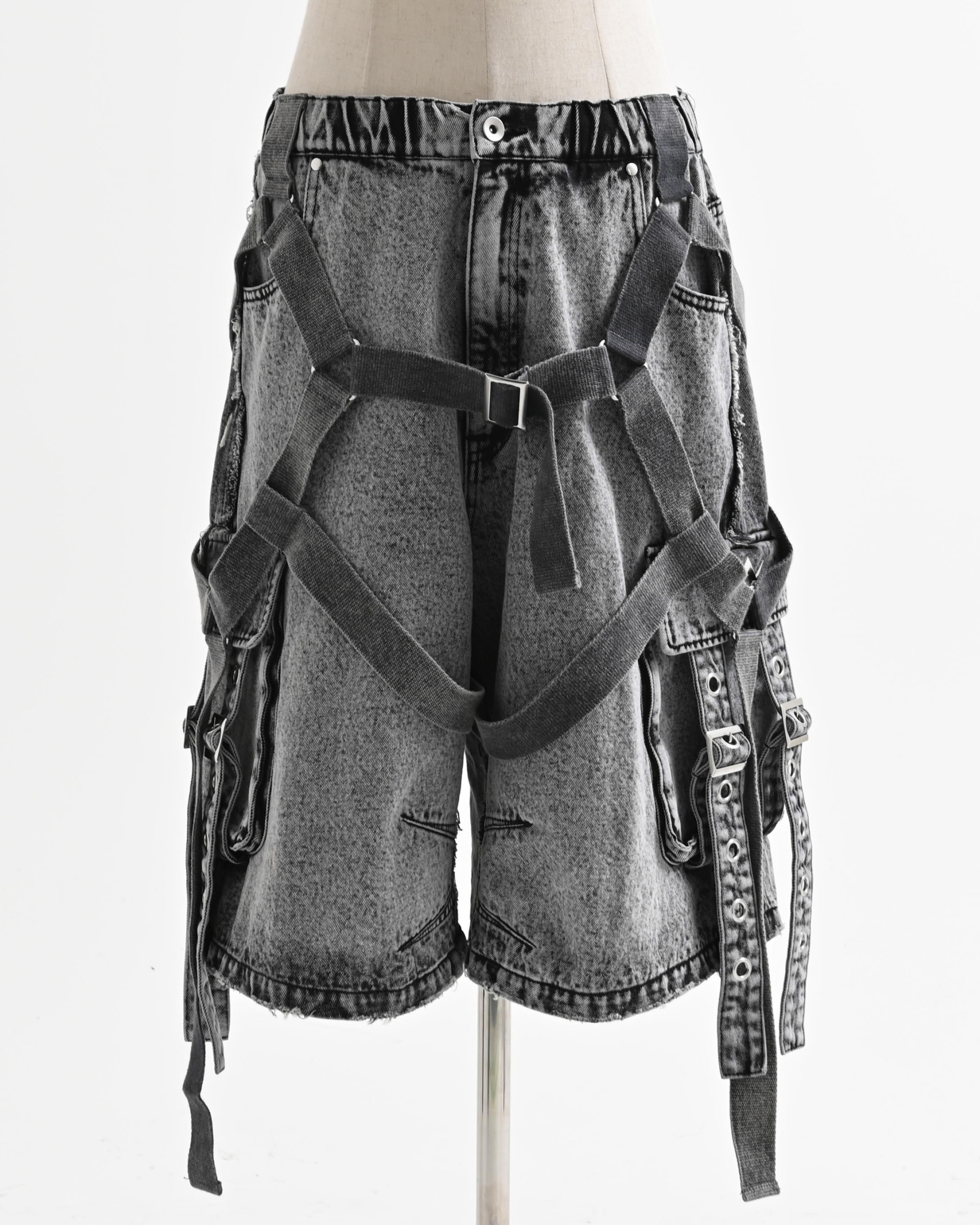 This piece stands out with various details, including belts, straps, and metal parts that create contrast against the monochromatic background.