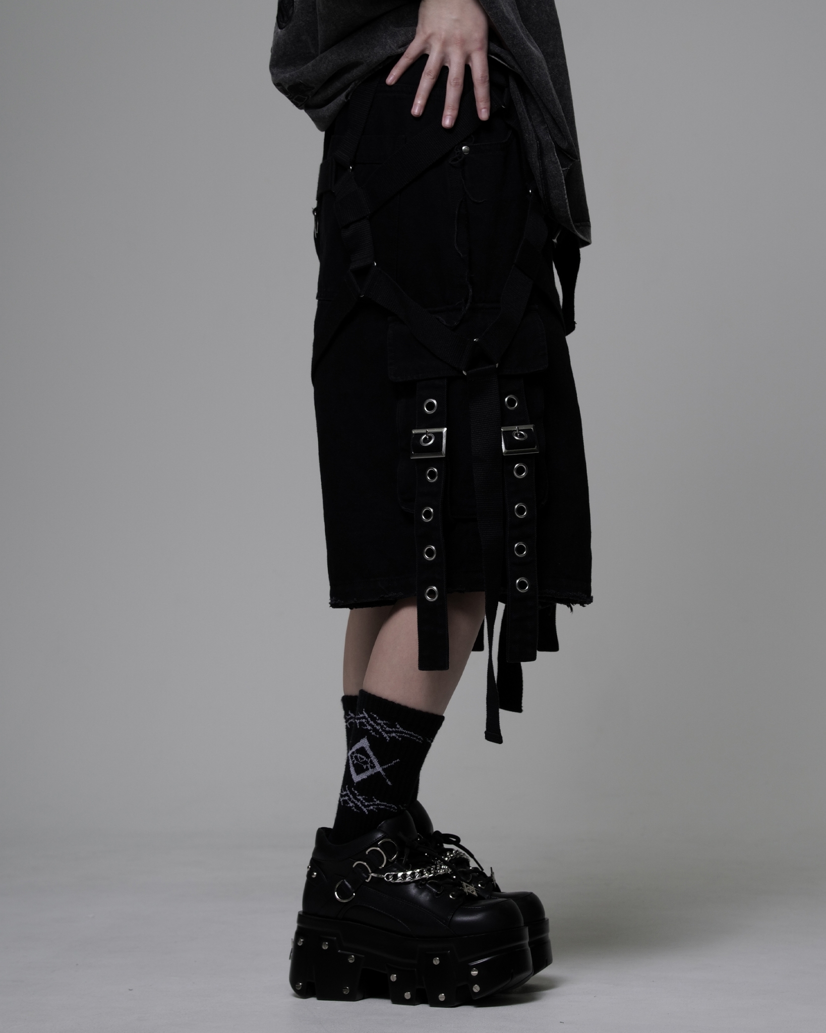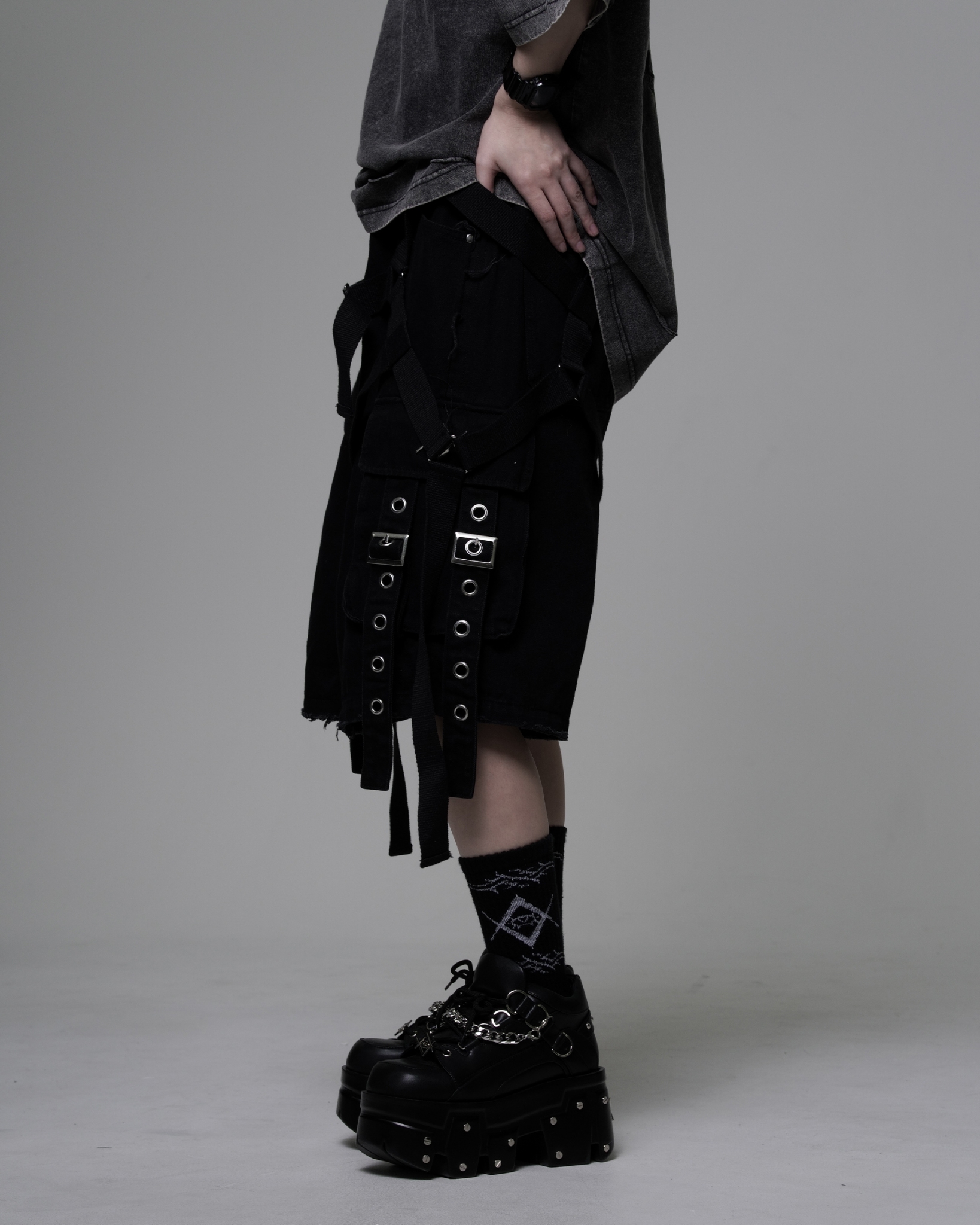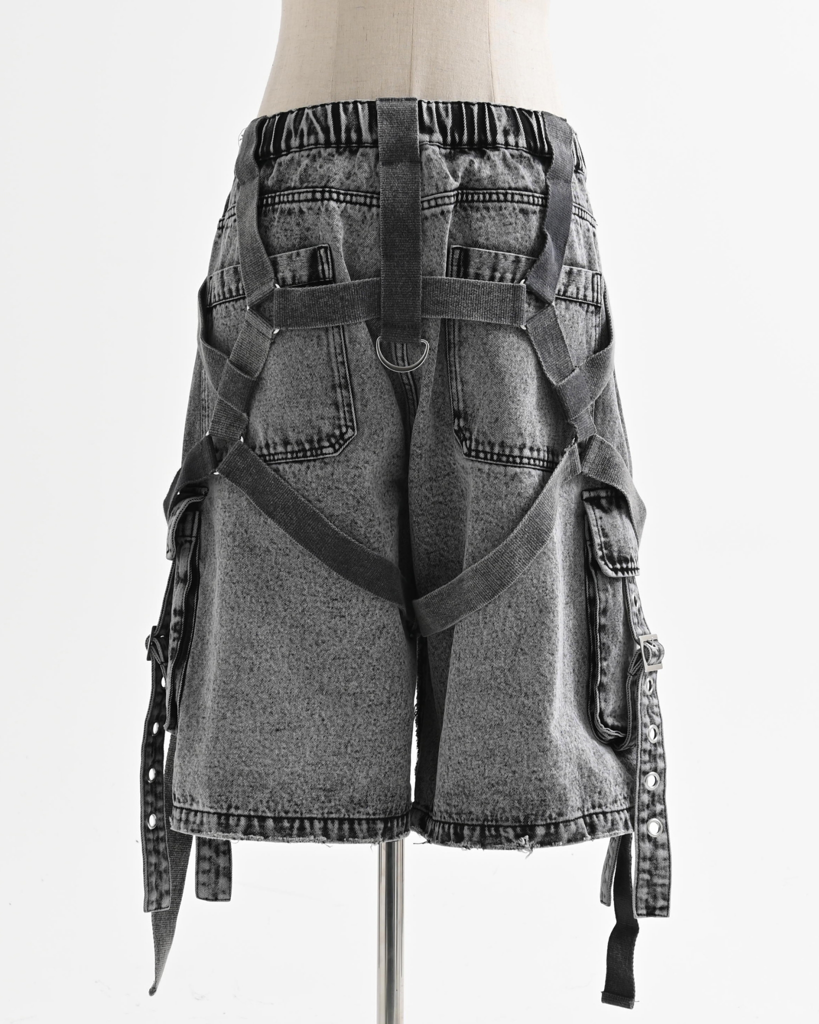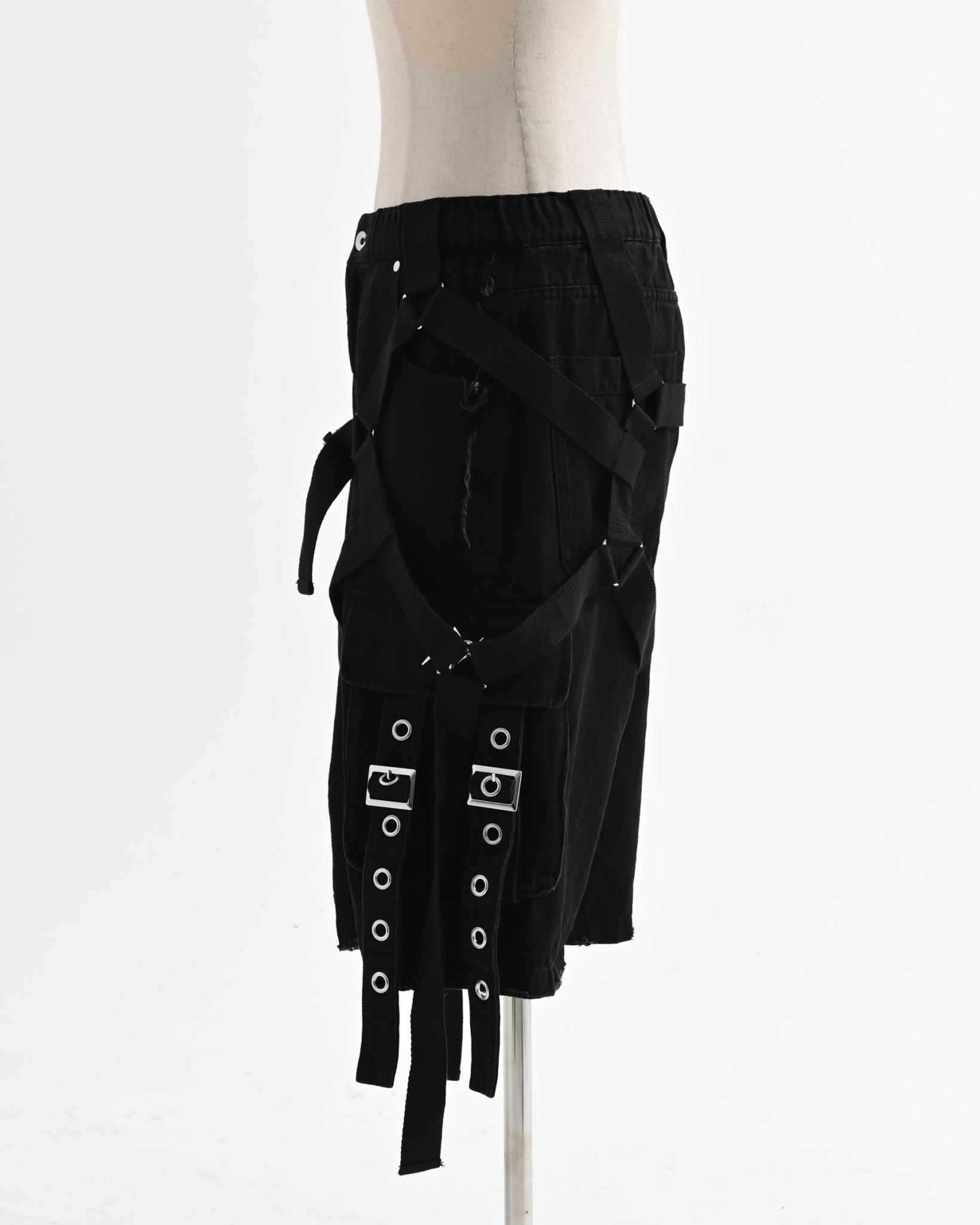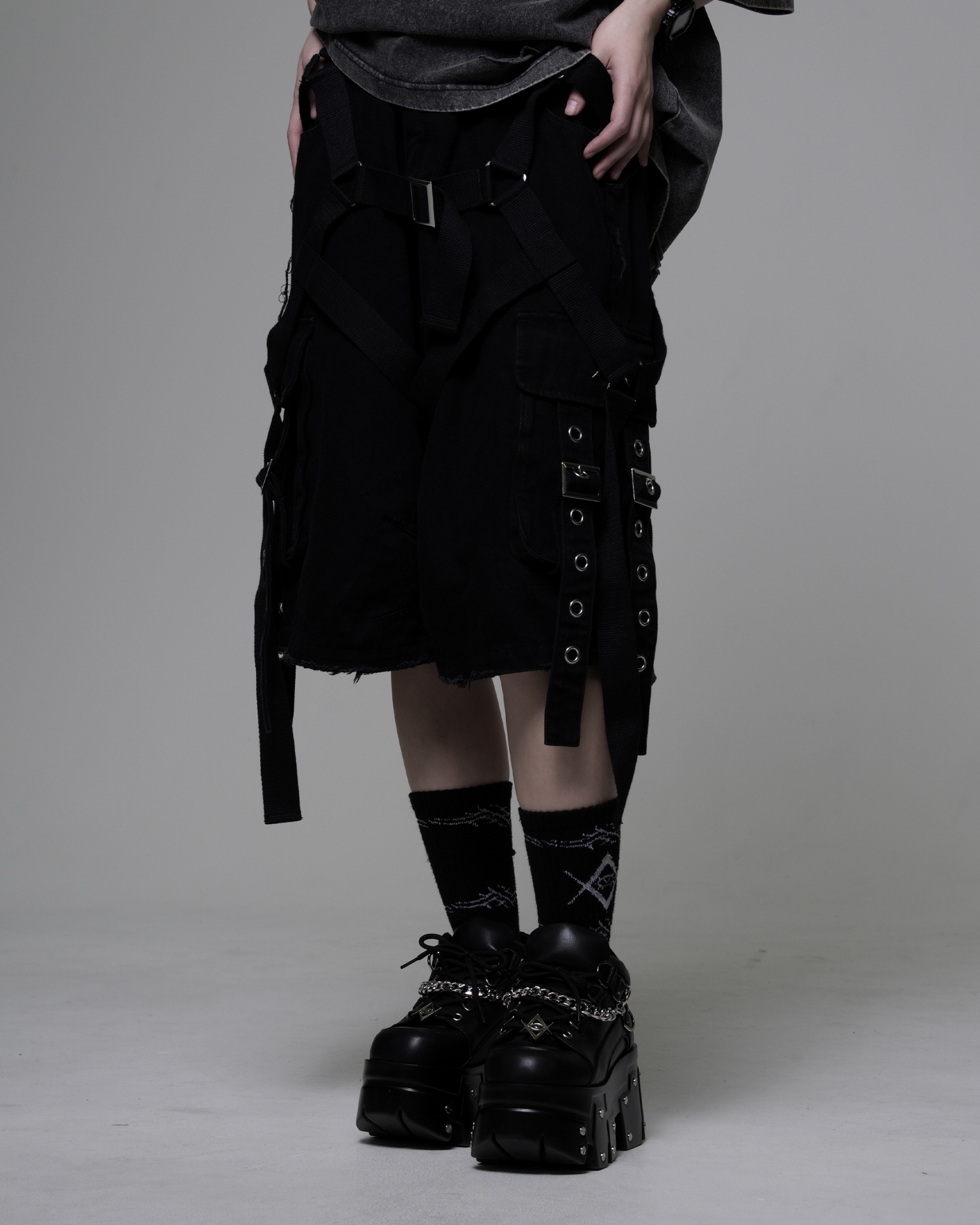 This piece stands out with various details, including belts, straps, and metal parts that create contrast against the monochromatic background.