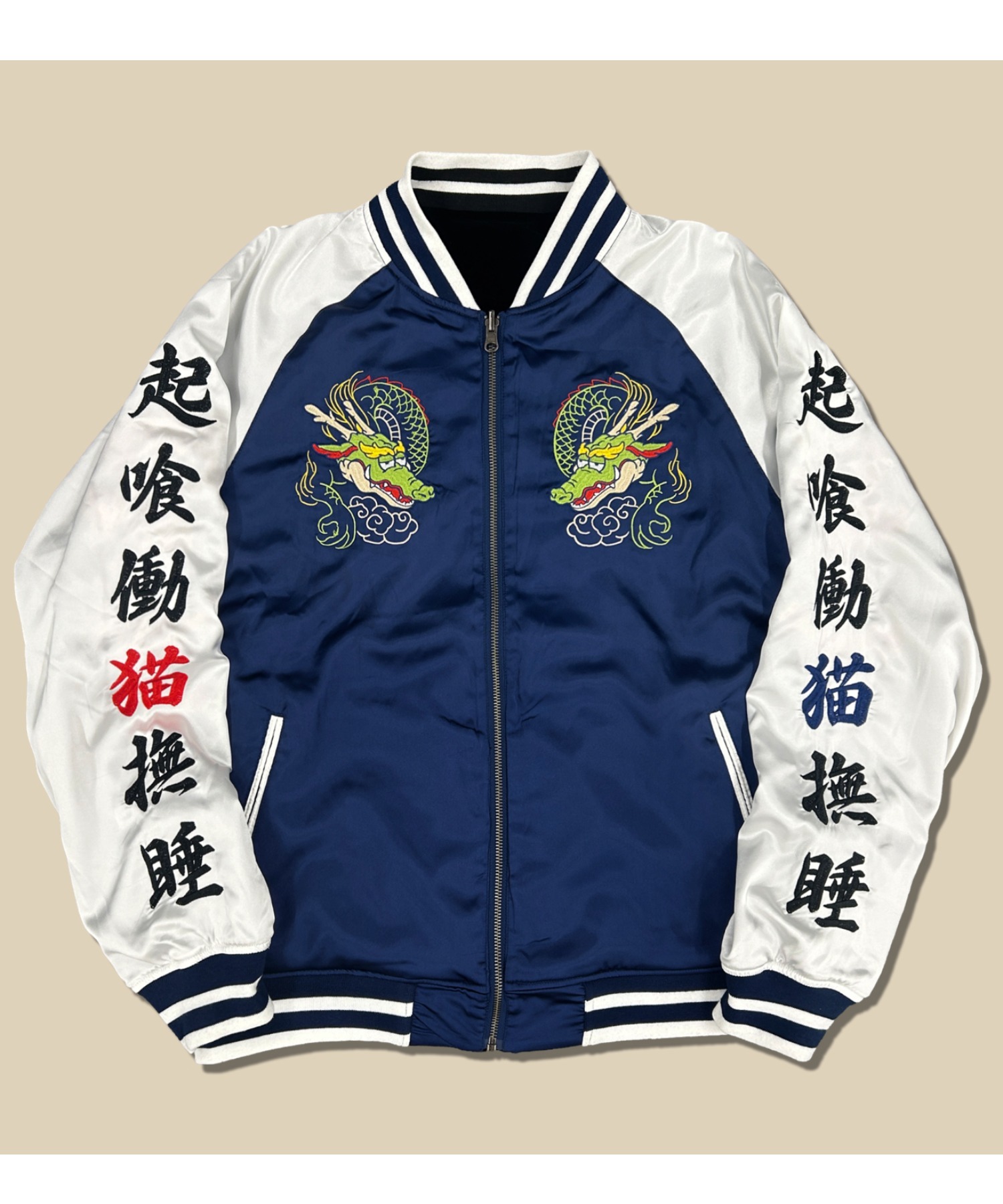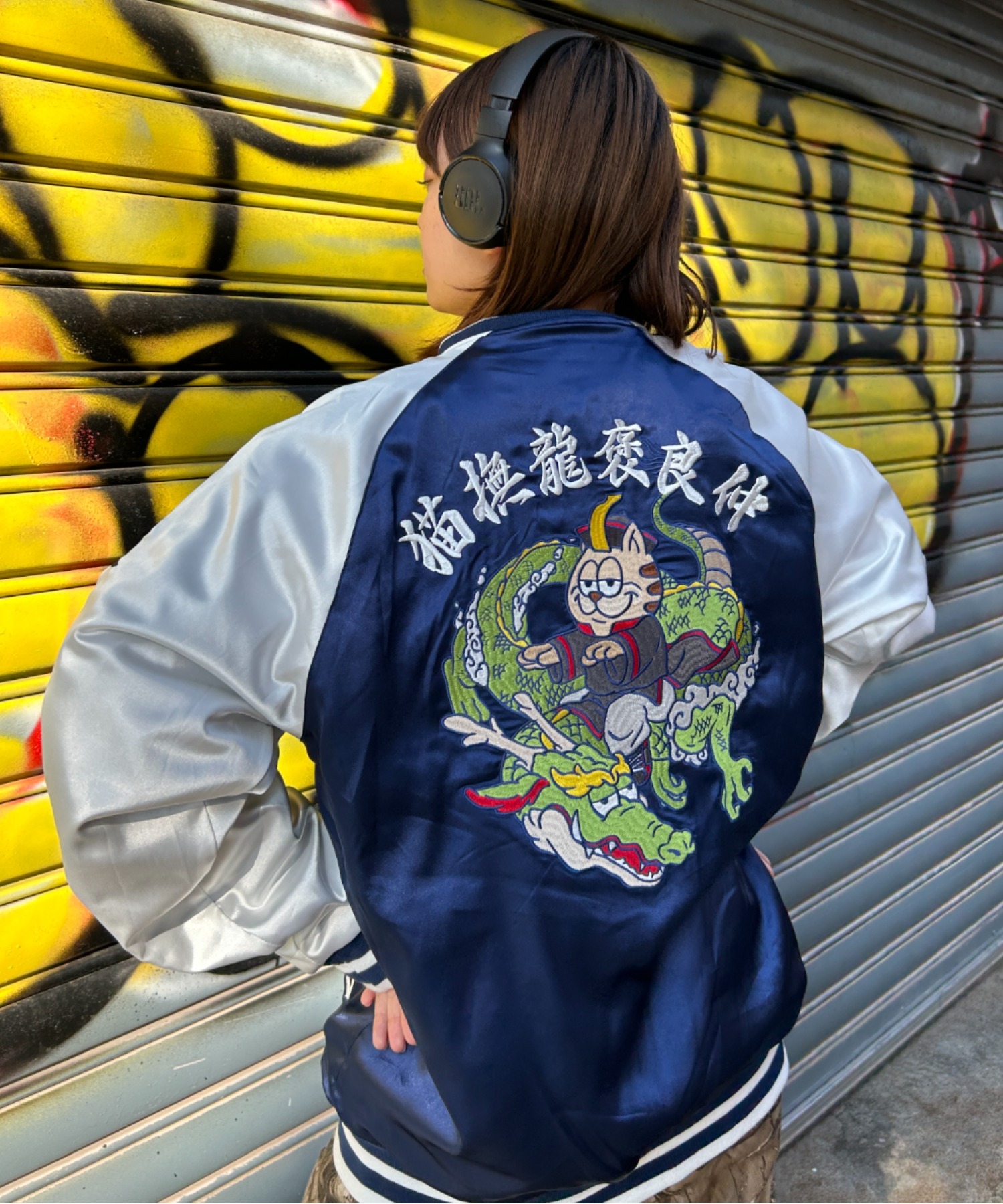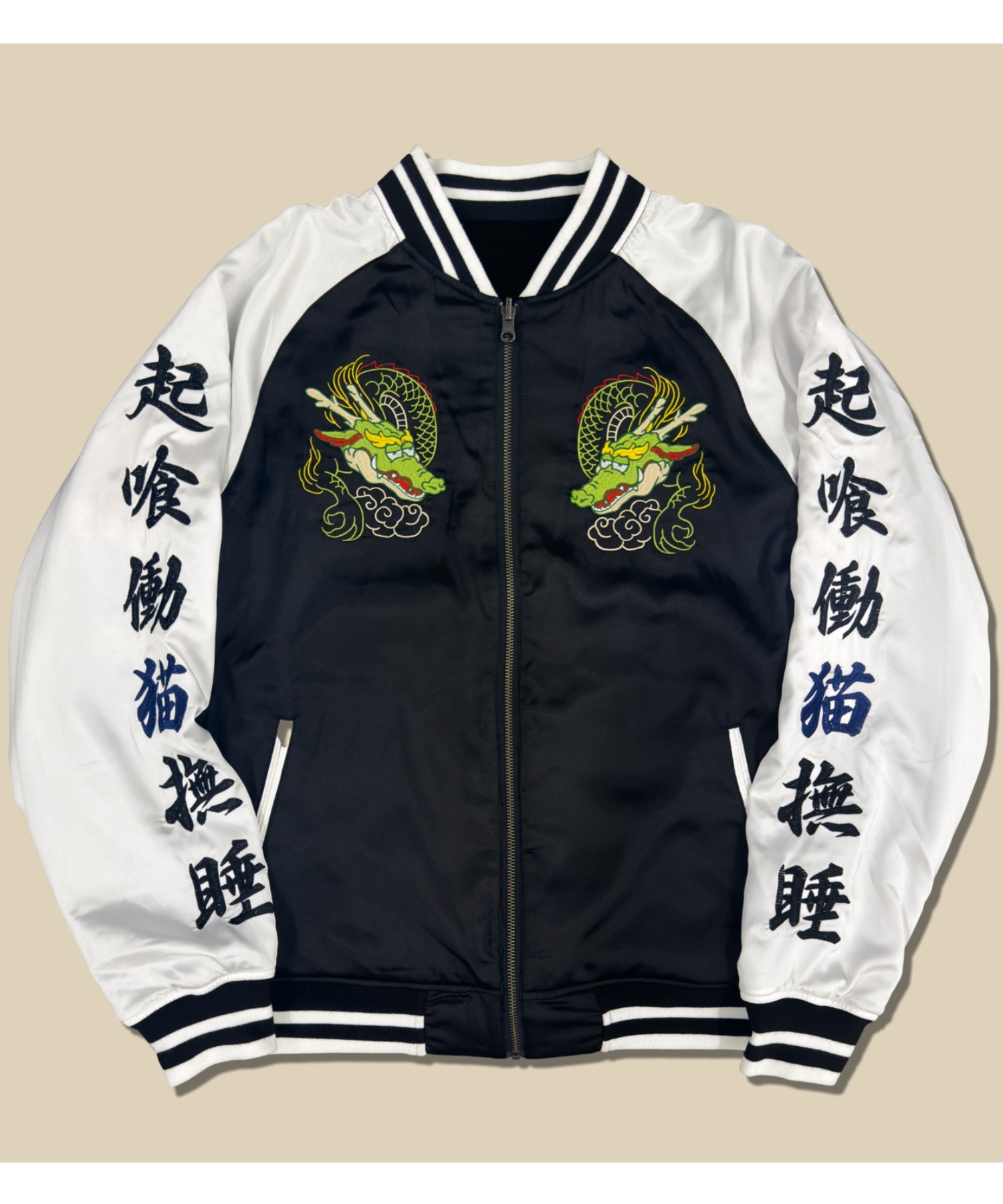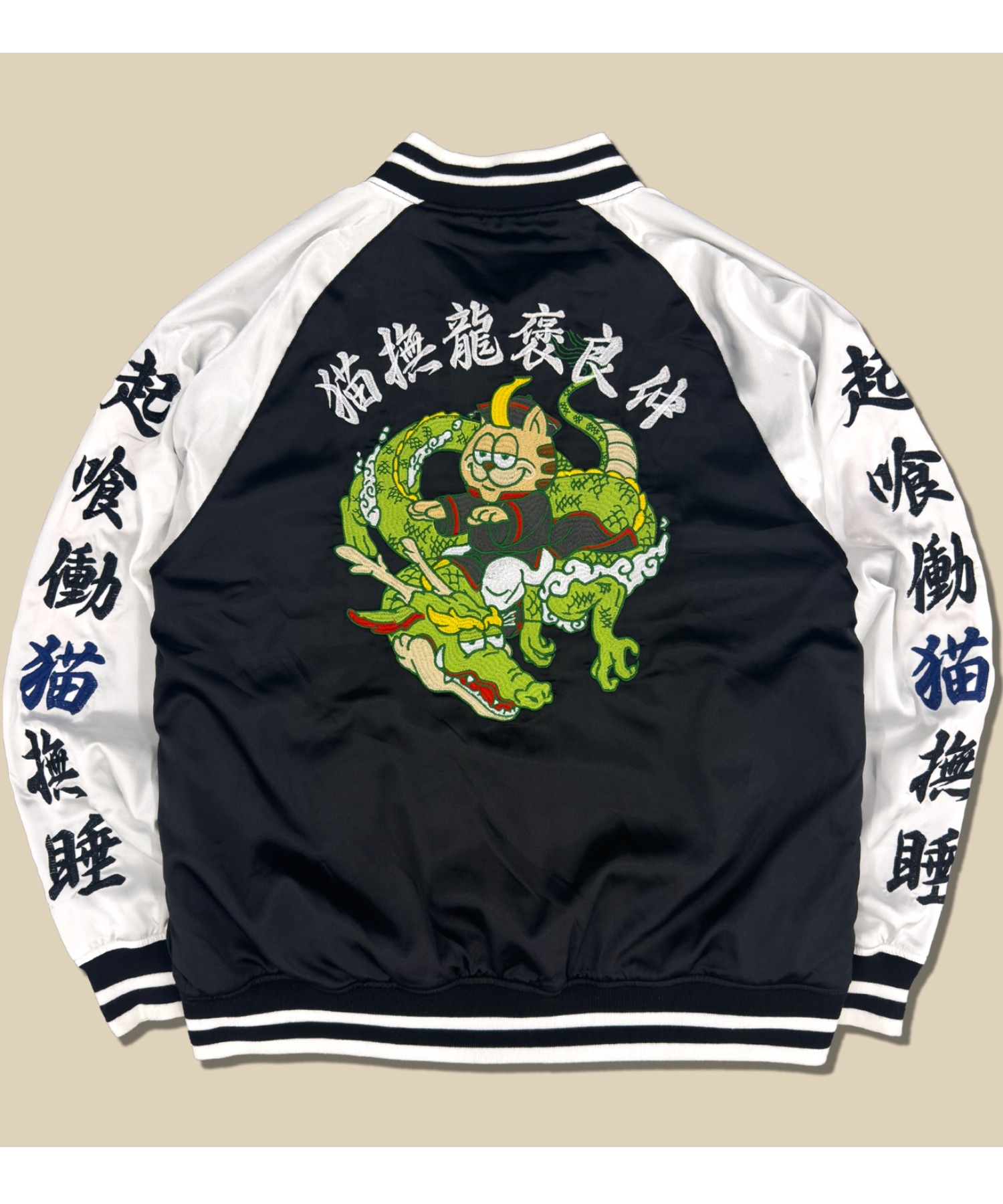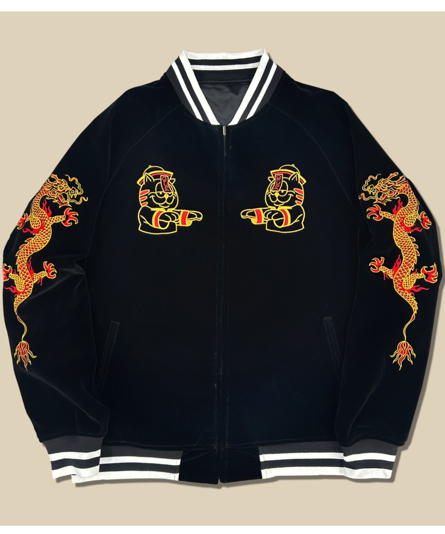 -Reversible design, with a unique design that combines bold dragon embroidery and cat characters on the back. The inner design is black with a vibrant, orange dragon.