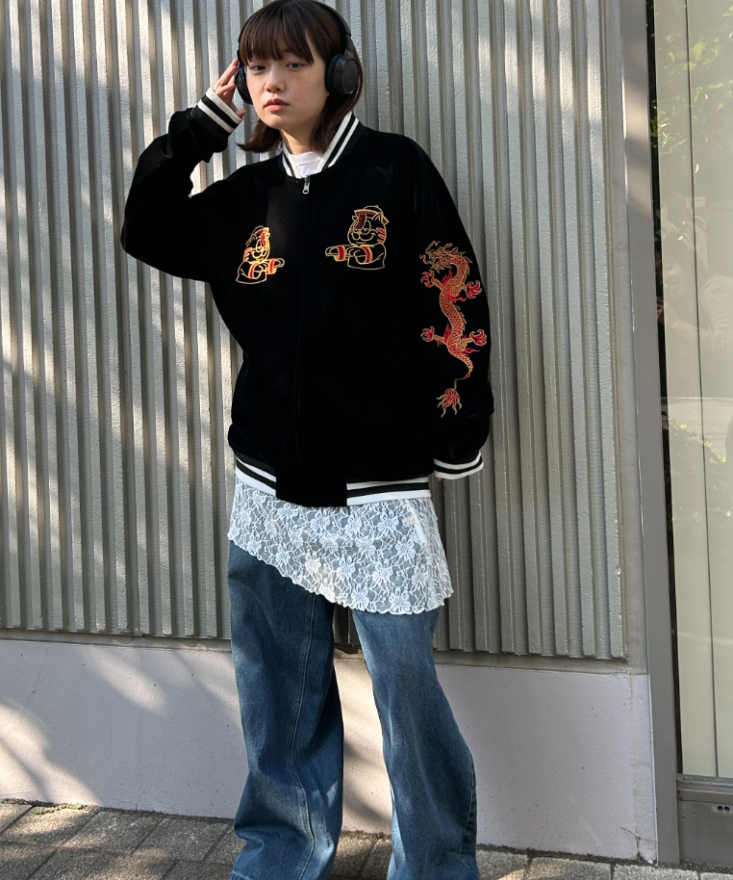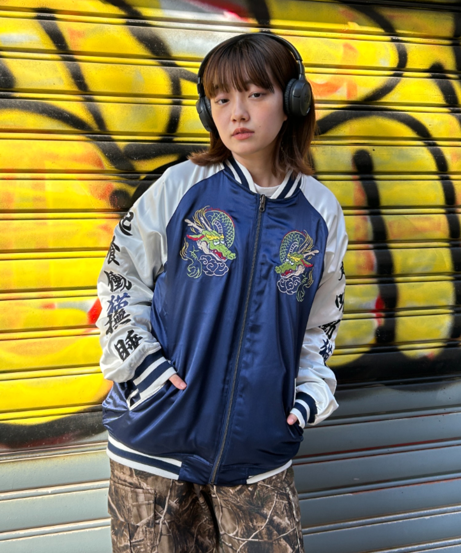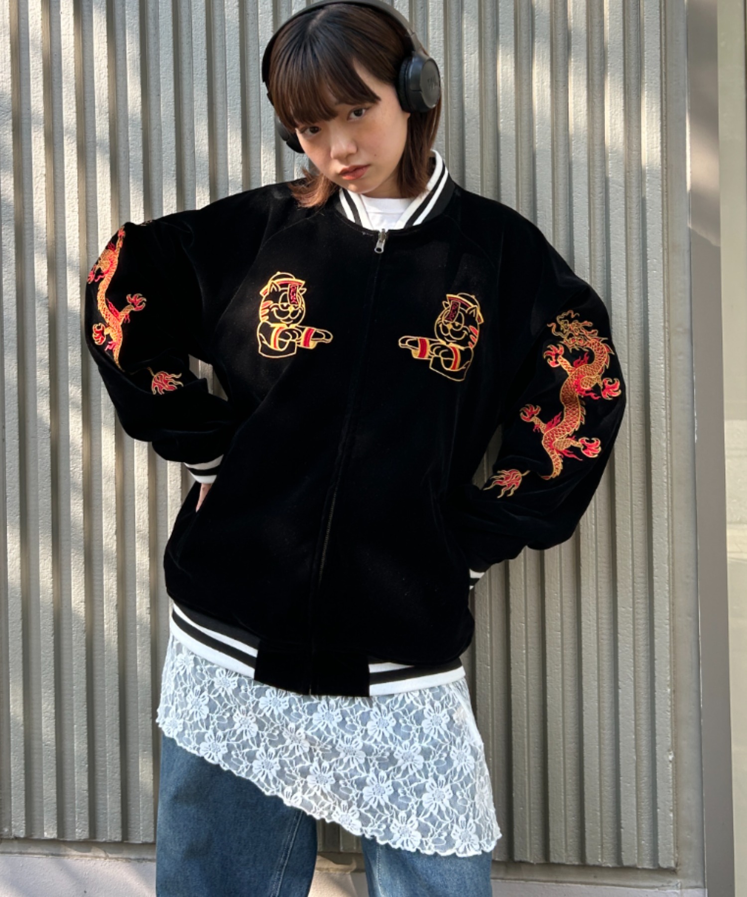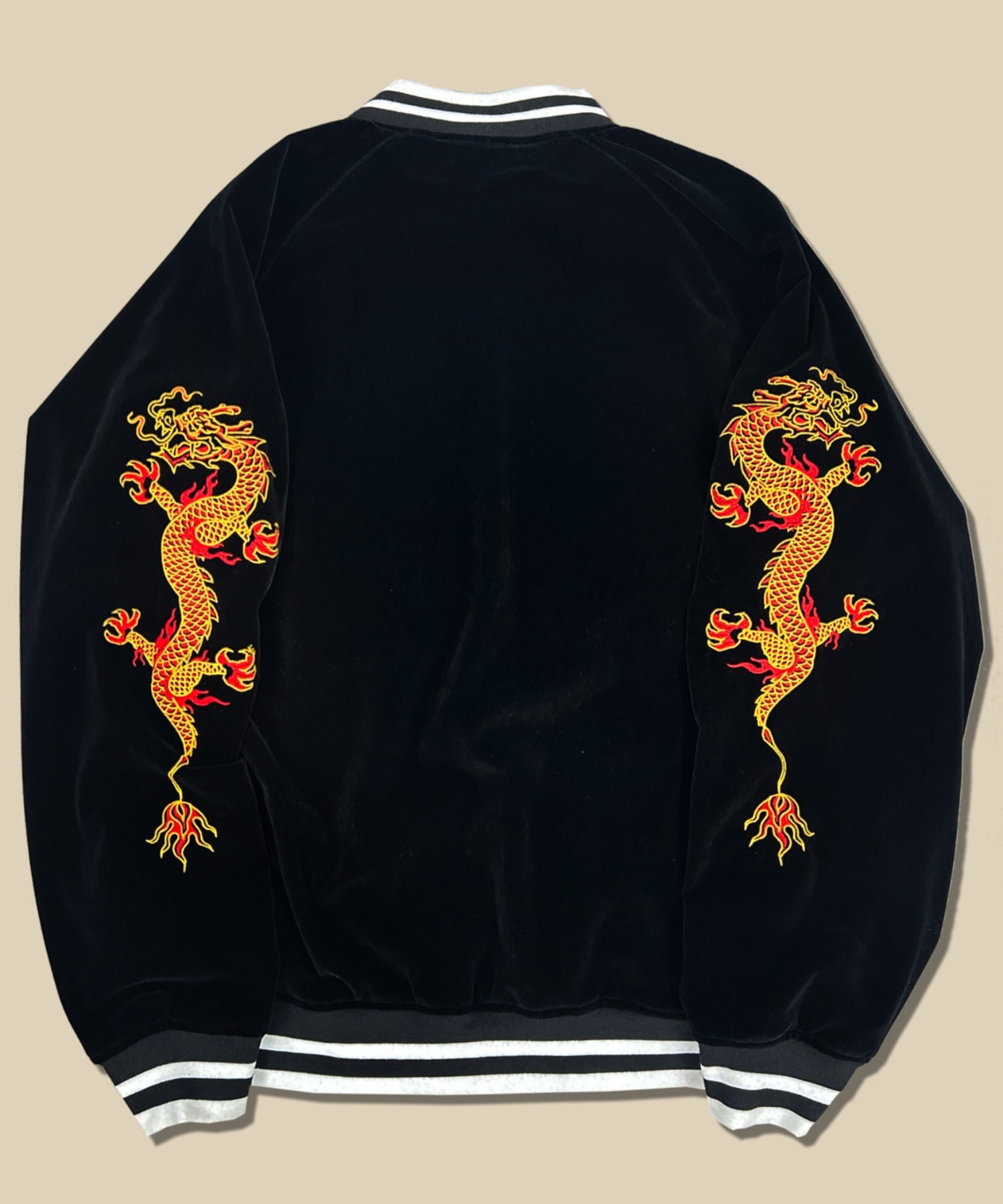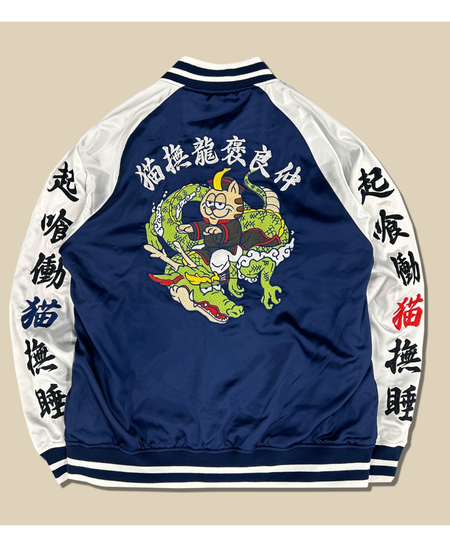 -Reversible design, with a unique design that combines bold dragon embroidery and cat characters on the back. The inner design is black with a vibrant, orange dragon.