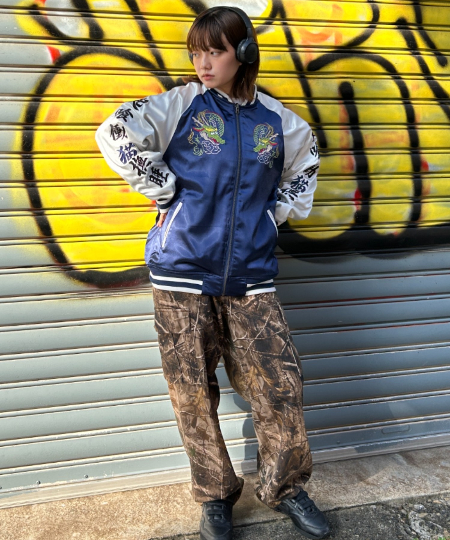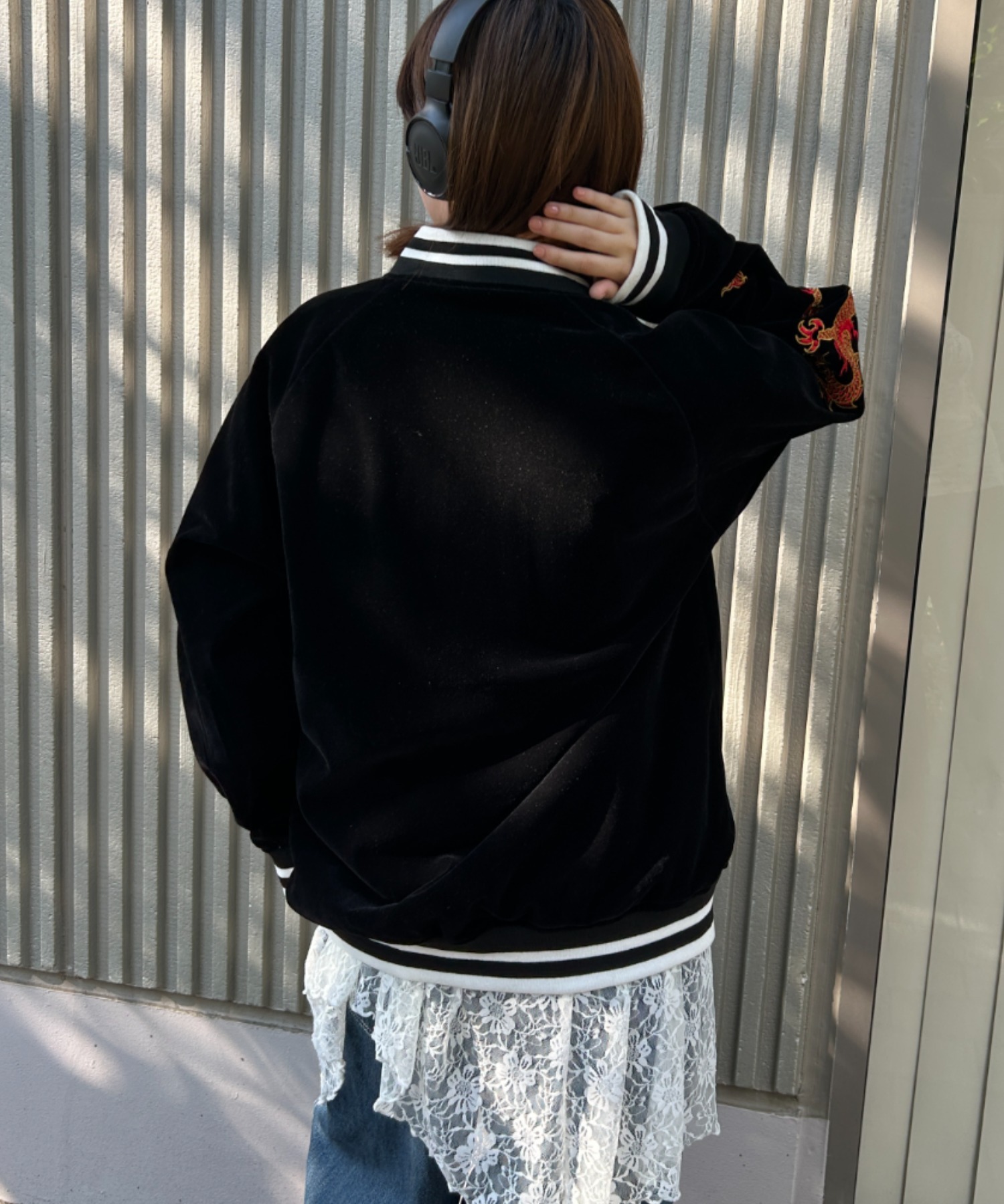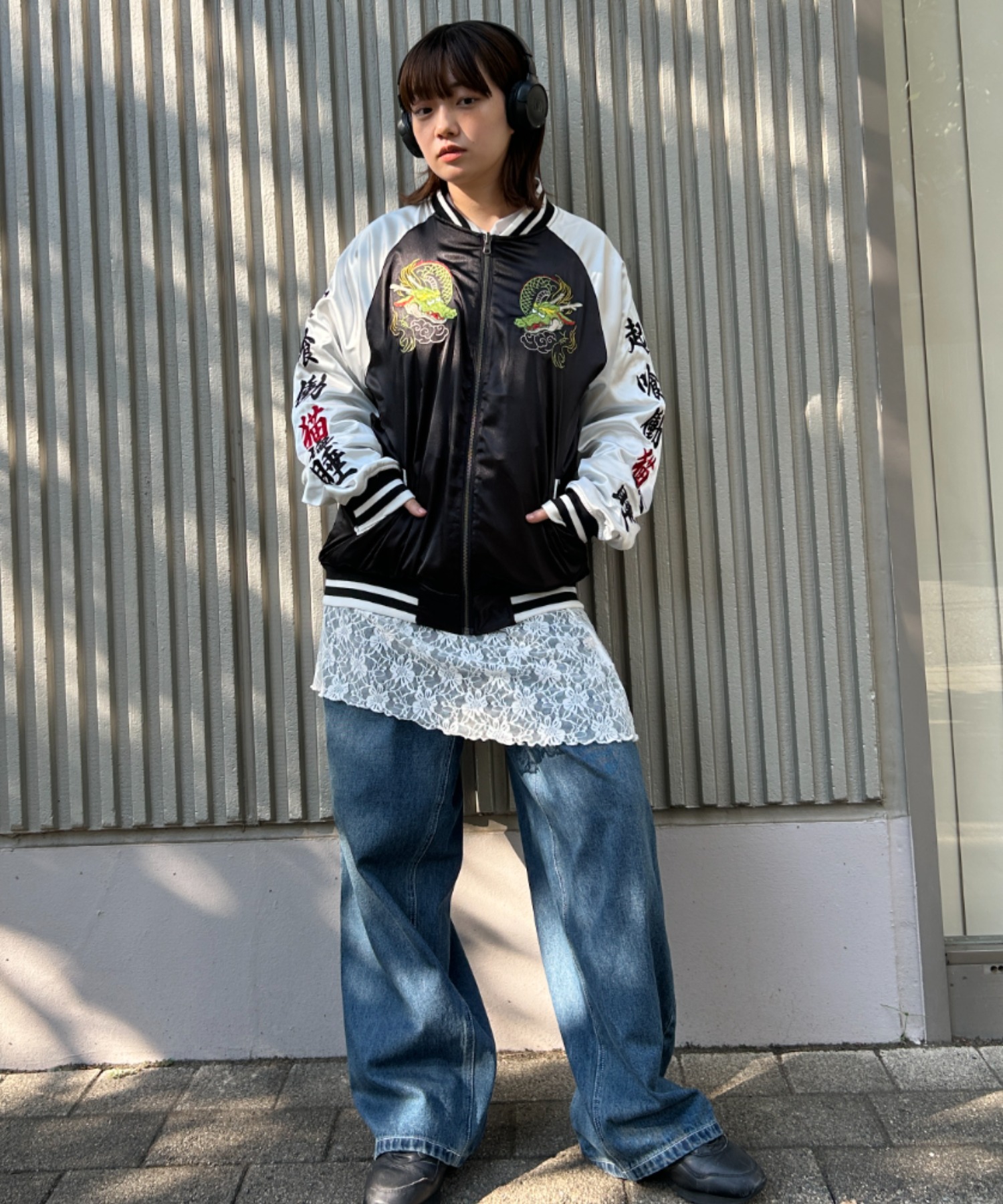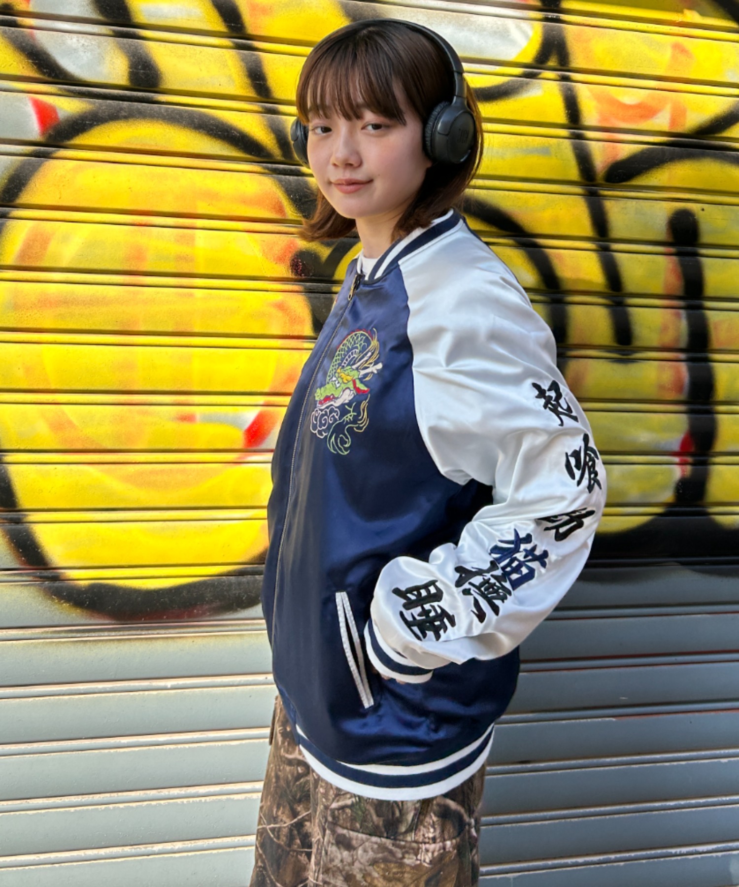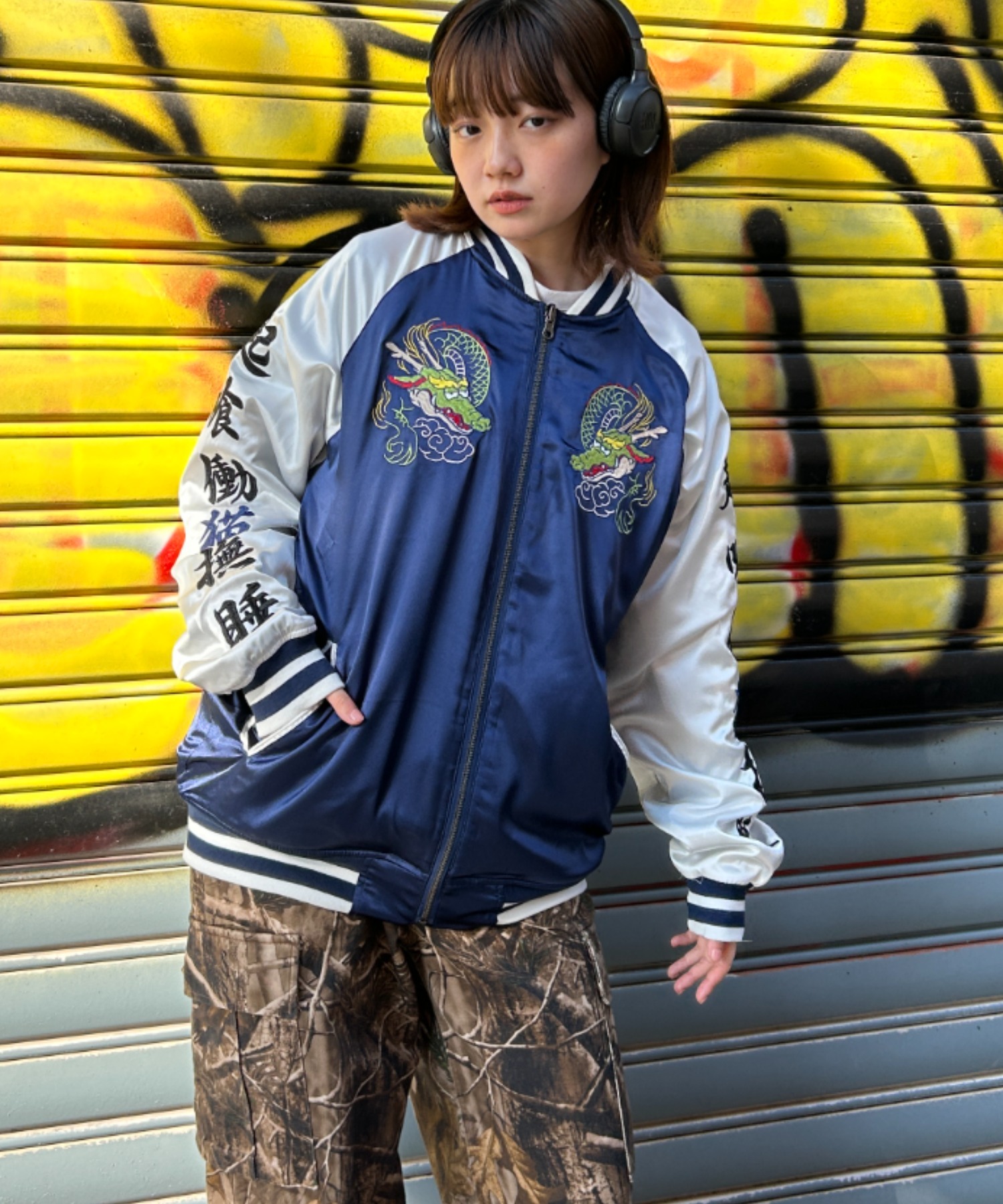 -Reversible design, with a unique design that combines bold dragon embroidery and cat characters on the back. The inner design is black with a vibrant, orange dragon.