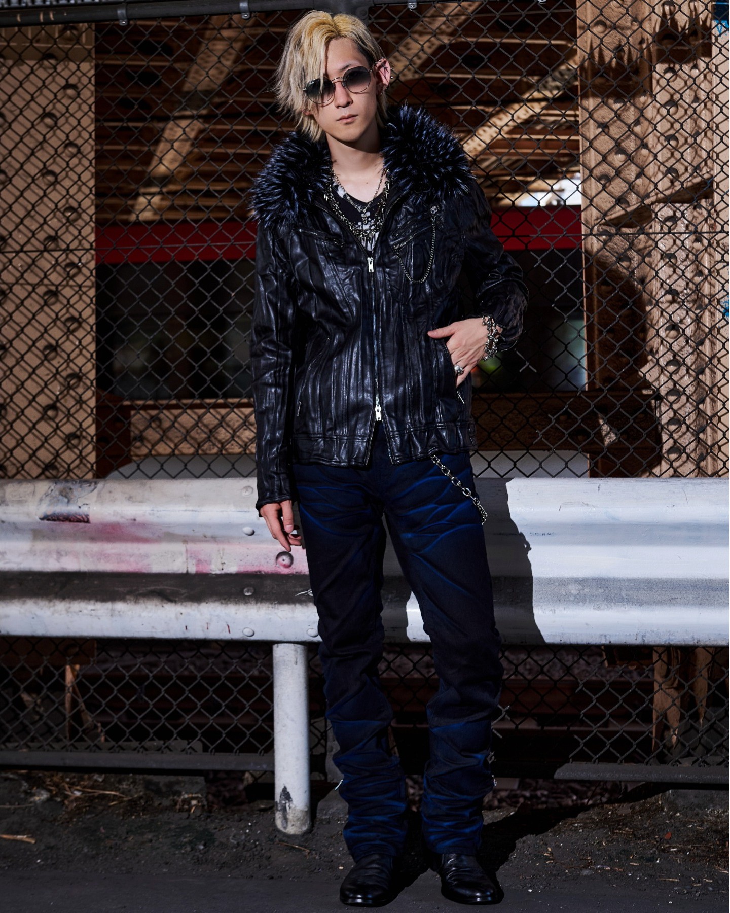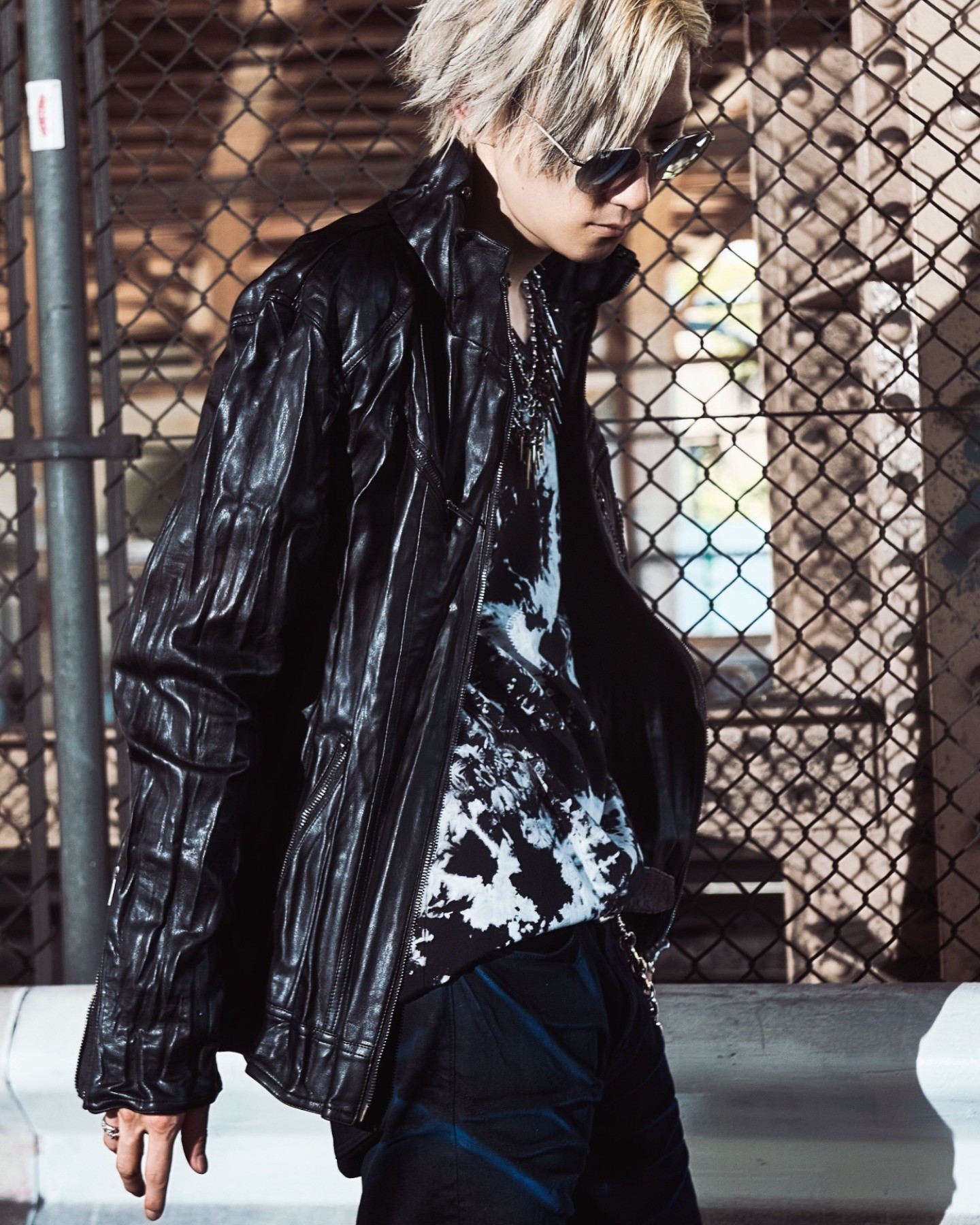 The entire piece has been given a wrinkled finish, creating a rugged look unlike that of a typical rider’s jacket.
